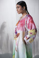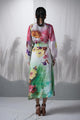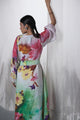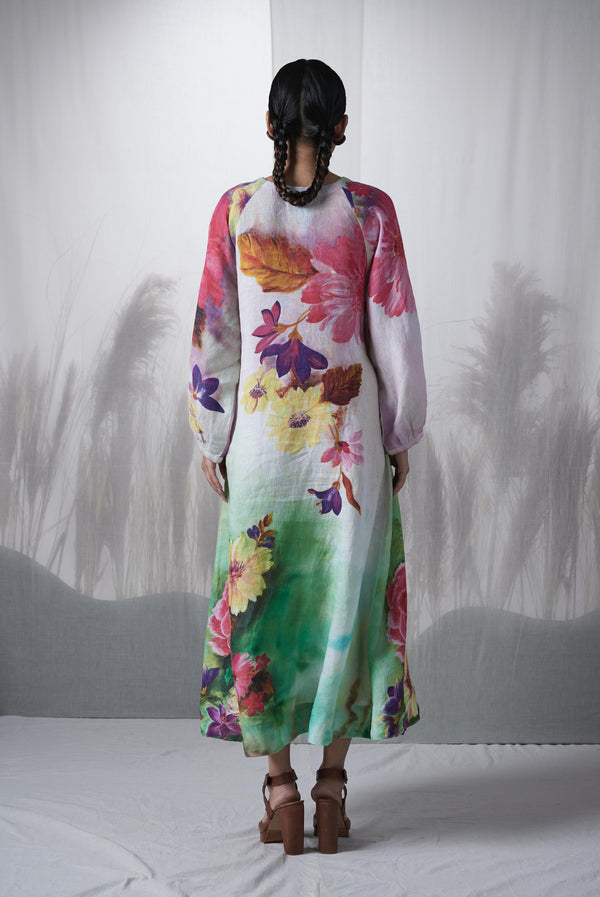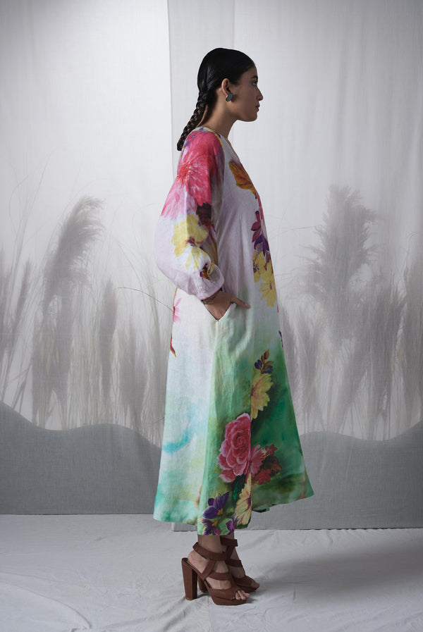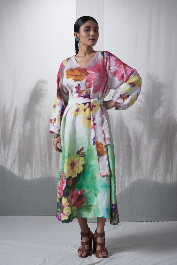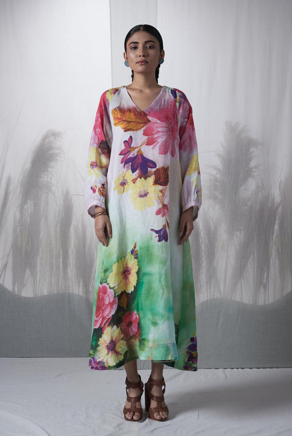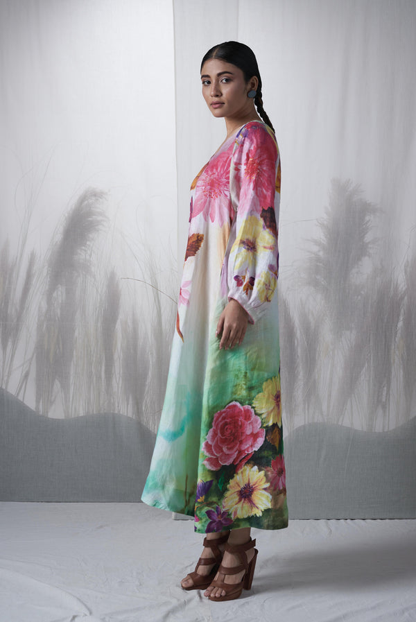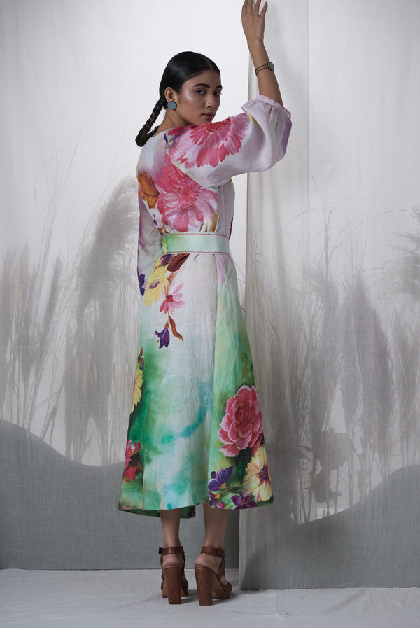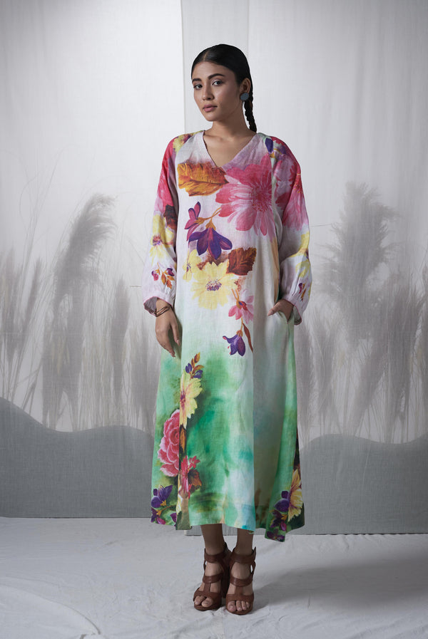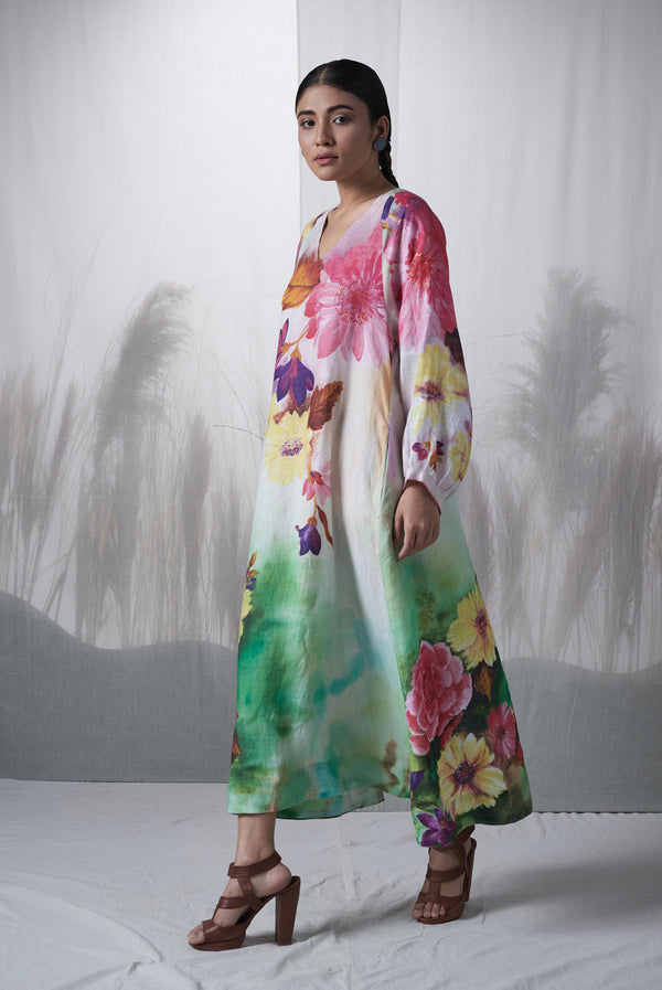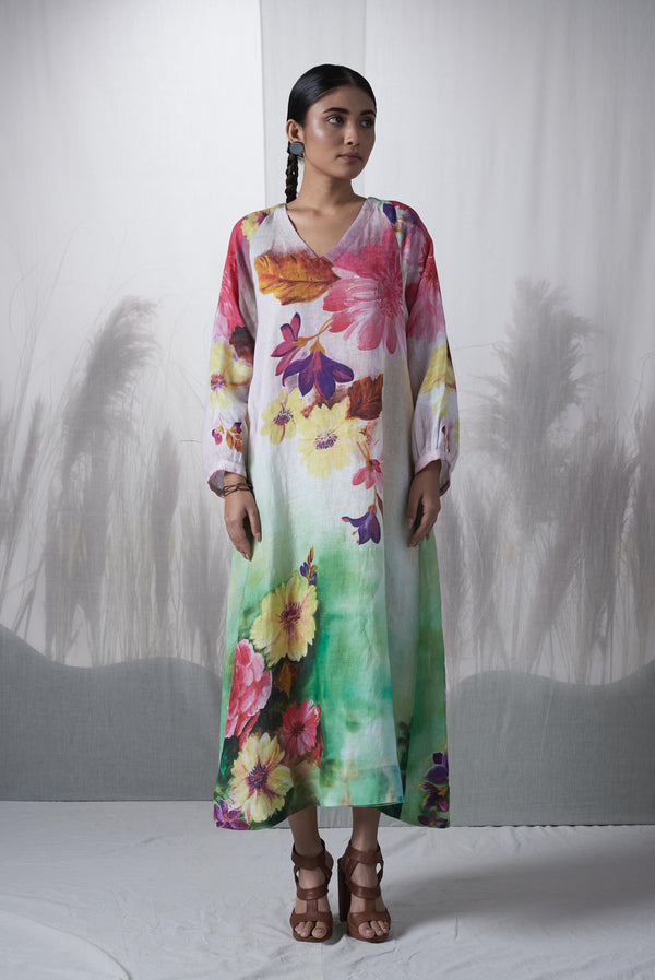 - Green floral printed, hand woven linen V-neck A-line dress.