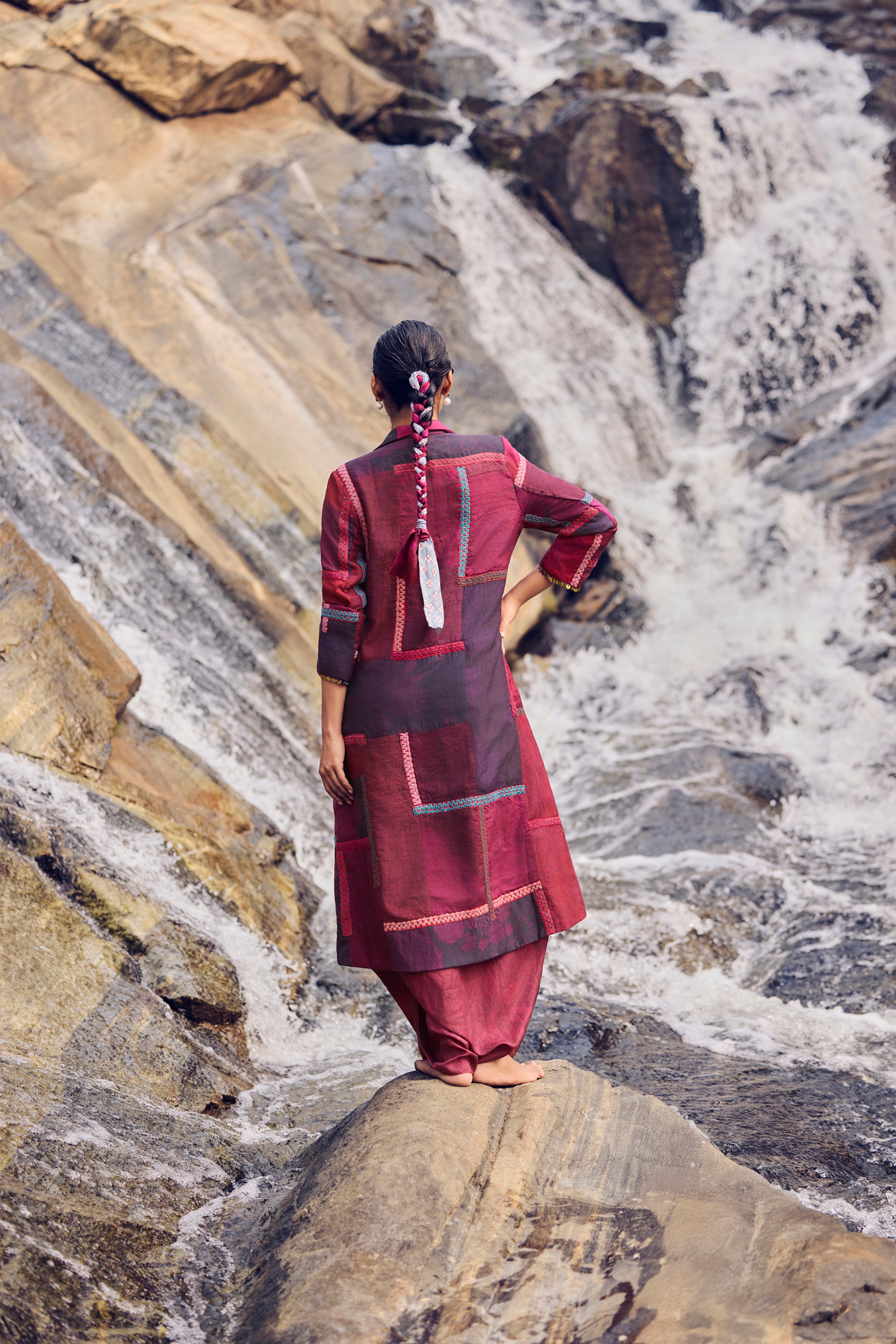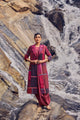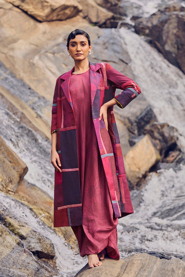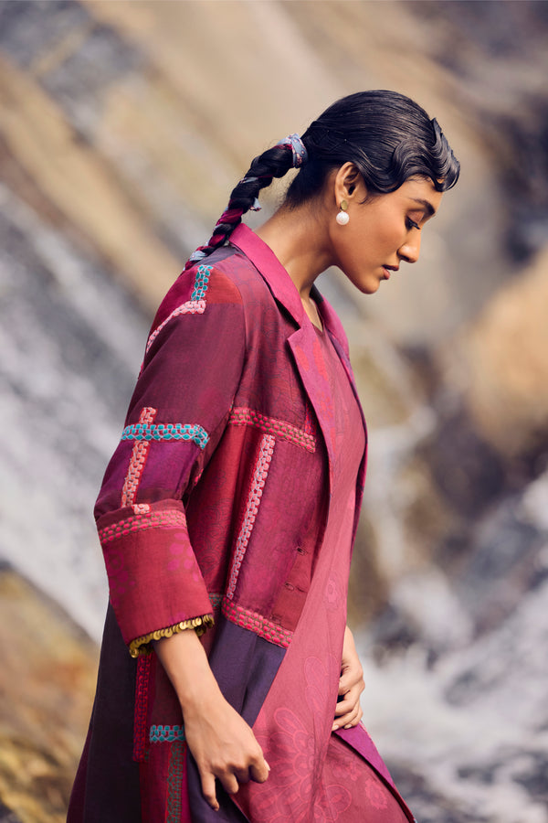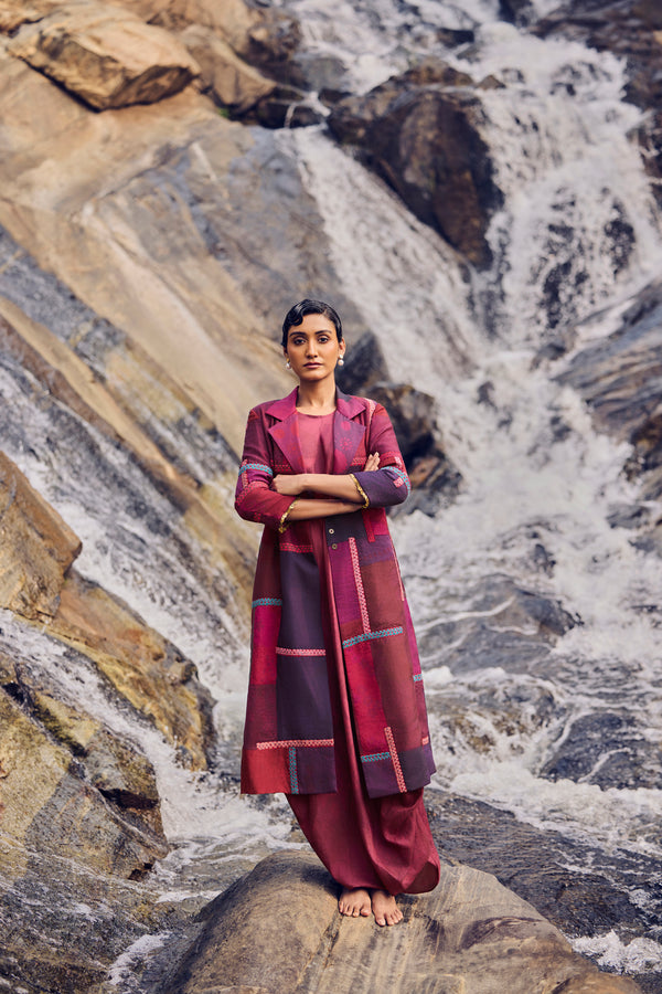 Rich maroon and burgundy tones come alive in this handwoven mulberry silk patchwork jacket, brought to life through traditional hand printing and intricate thread embroidery. Detailed across the front, back, and sleeves, each motif reflects the patience and poetry of artisanal craft.