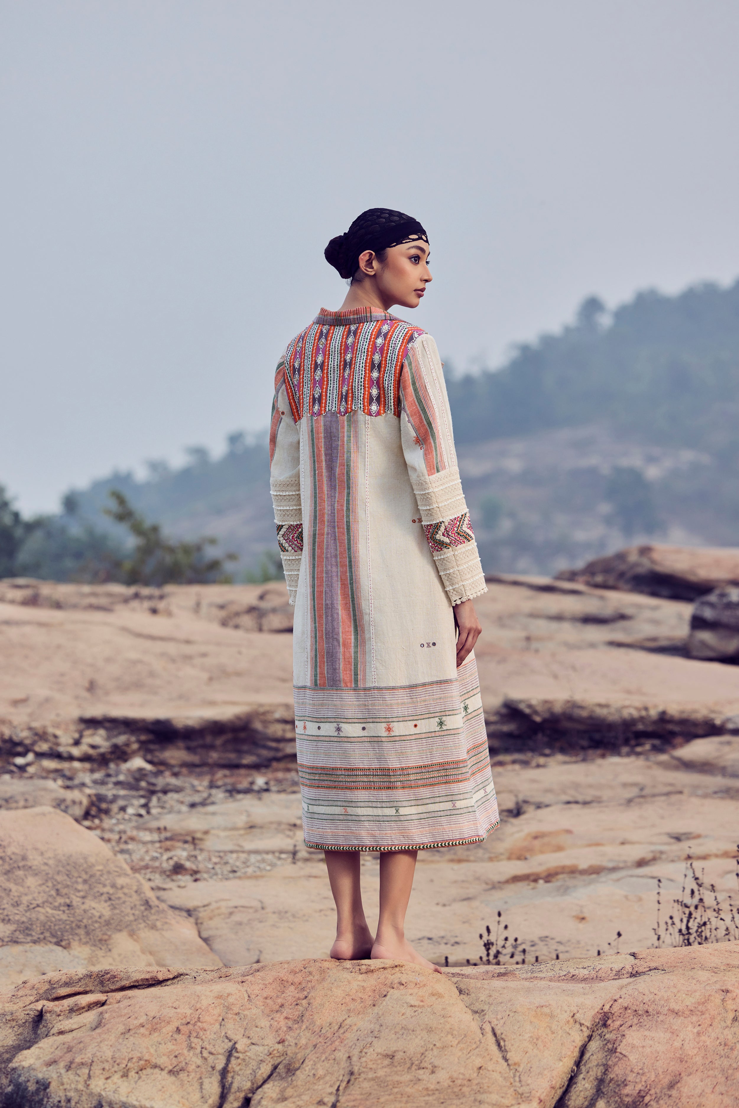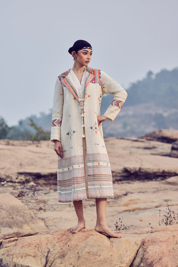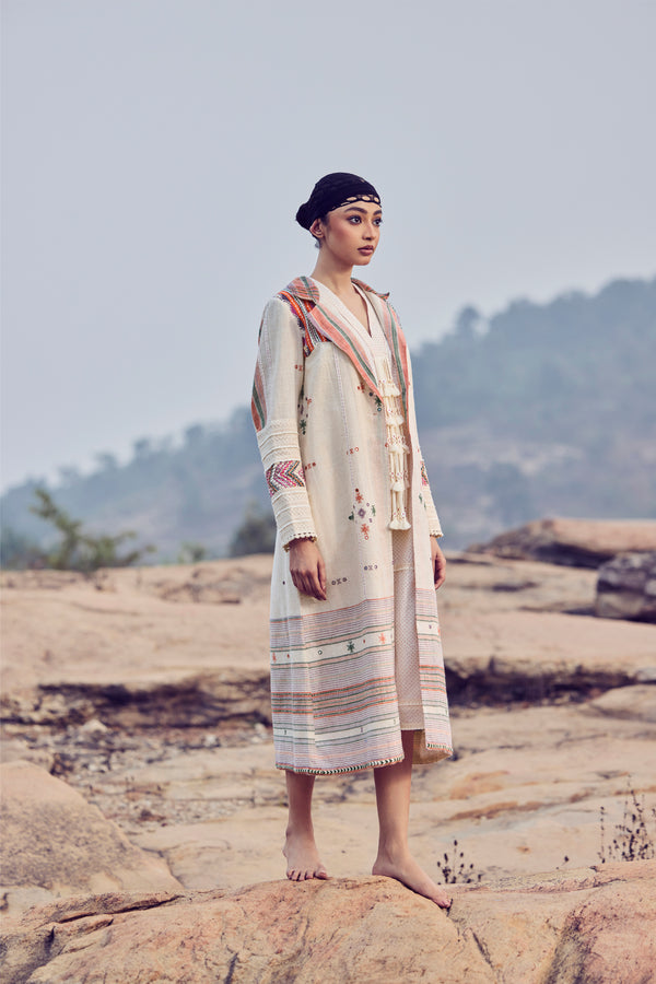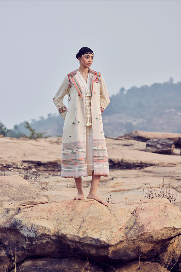 Rooted in desert craft and timeless design, this ensemble features a handwoven kala cotton Bhujodi overlayer jacket in warm ivory and orange hues, detailed with intricate embroidery on the sleeves and shoulders. Layered over a fluid microdot block-printed cotton voile dress, finished with delicate fringe detailing at the front, the look celebrates texture, movement, and heritage.