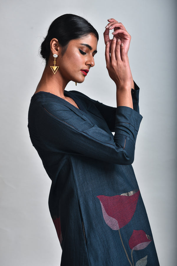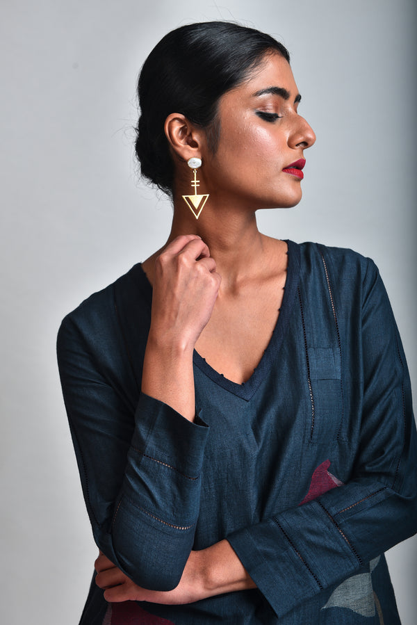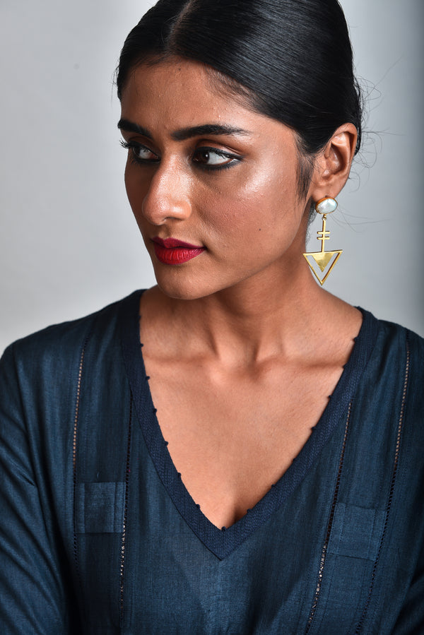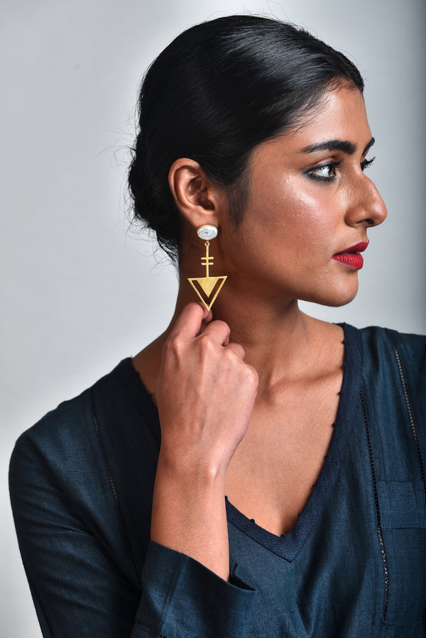 - brass metal arrow shape earrings with baroque pearl setting.