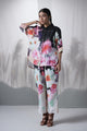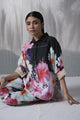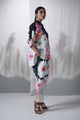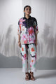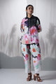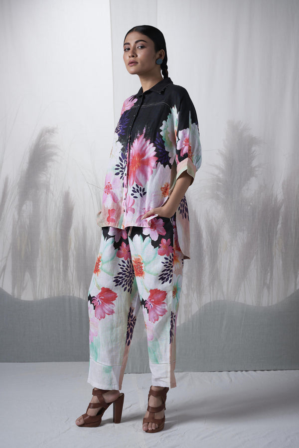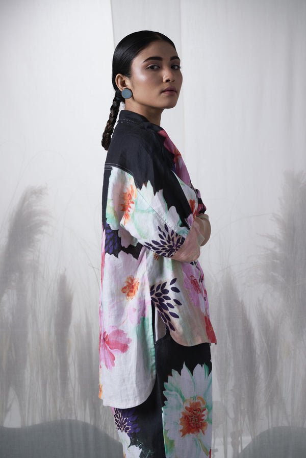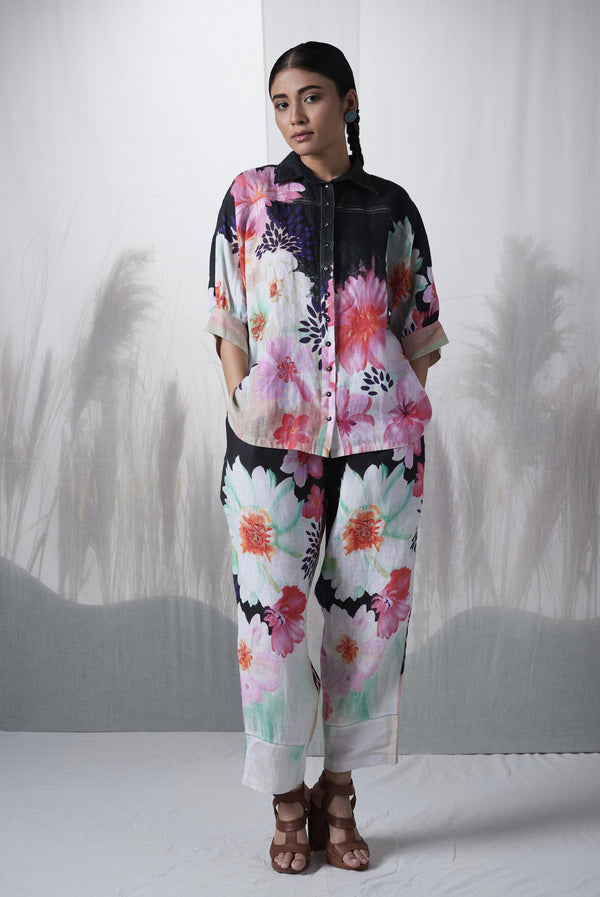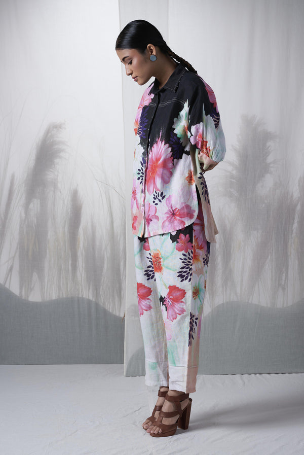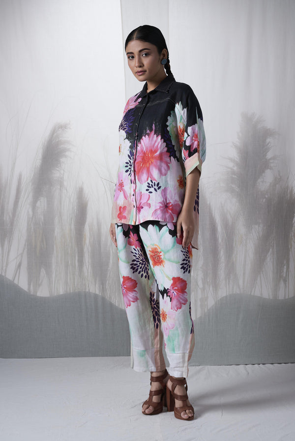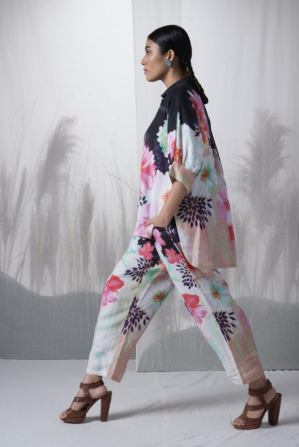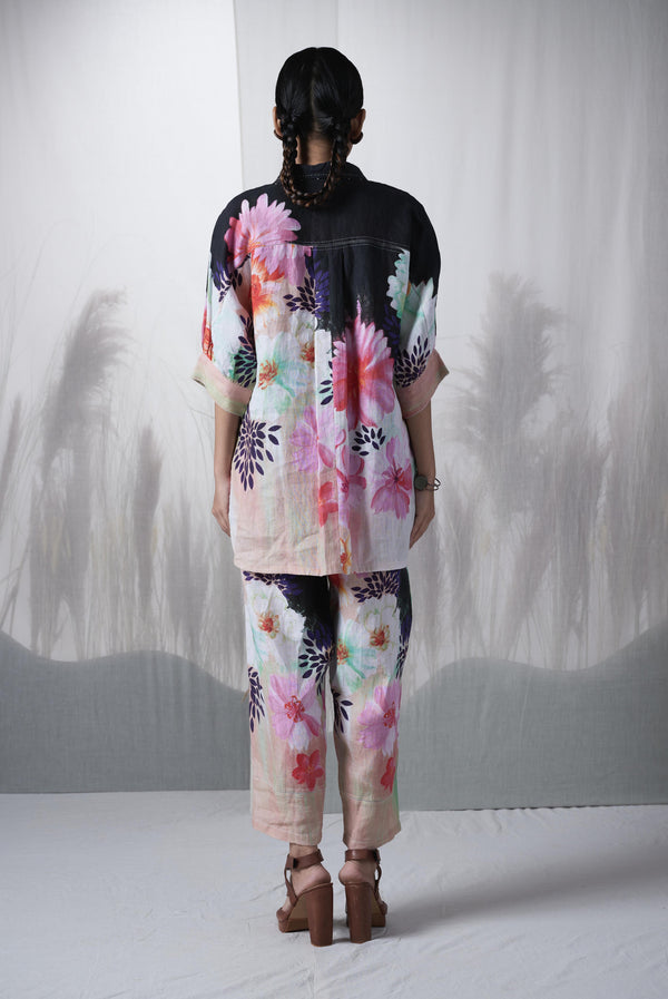 • Charcoal floral printed, hand woven linen kimono shirt paired with pants.