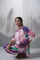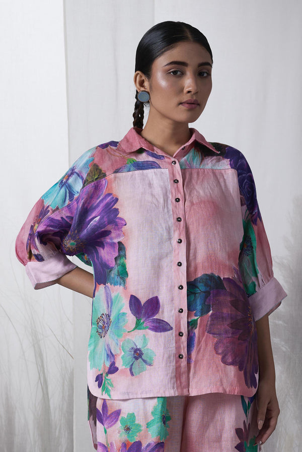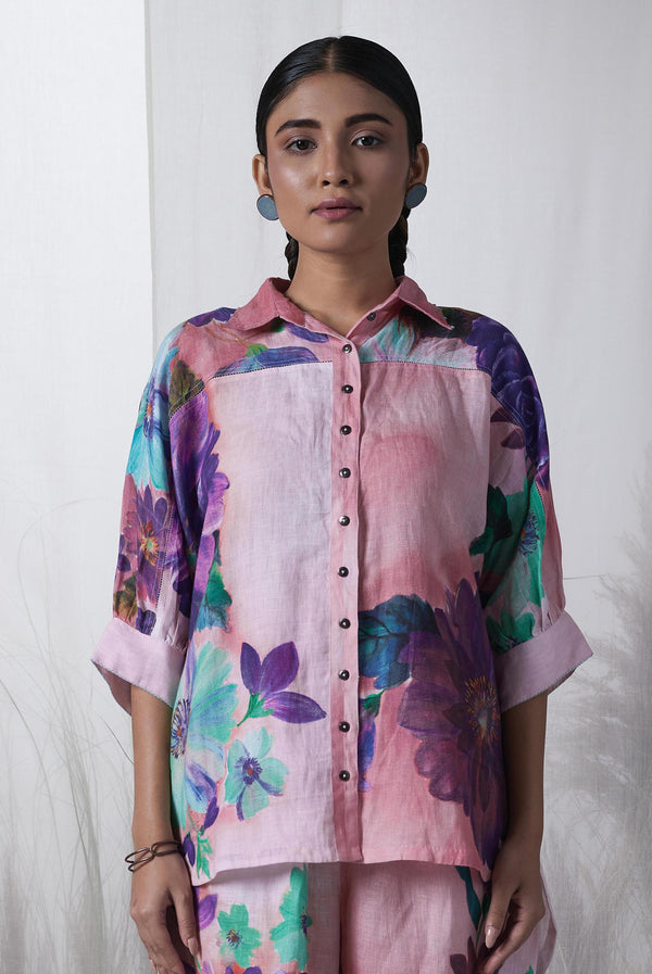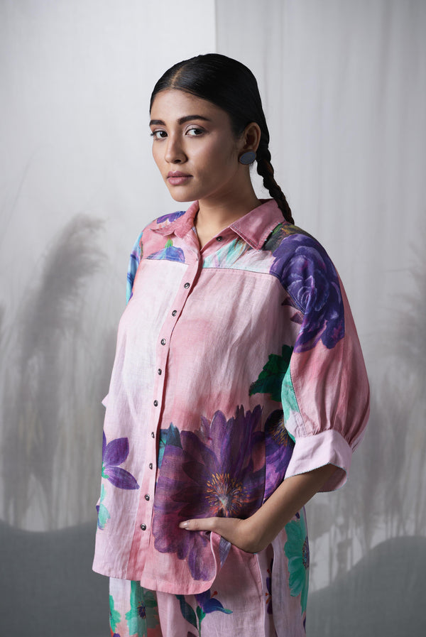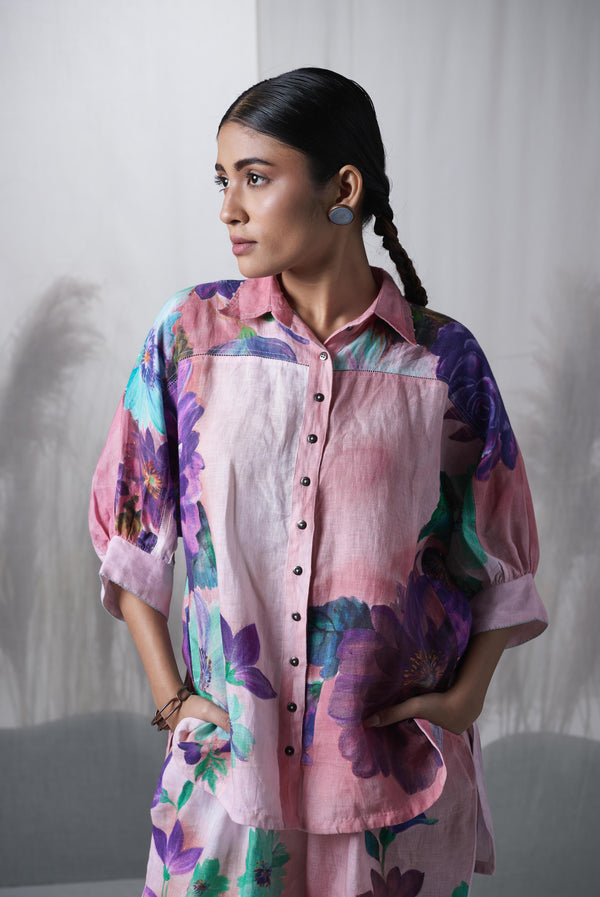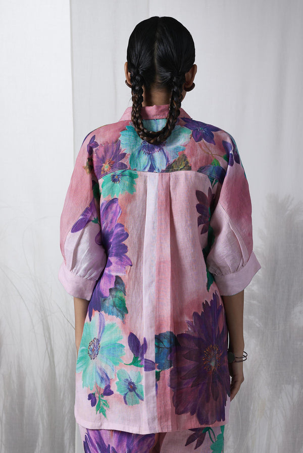 Pink floral printed, hand woven linen Kauri kimono shirt.