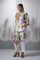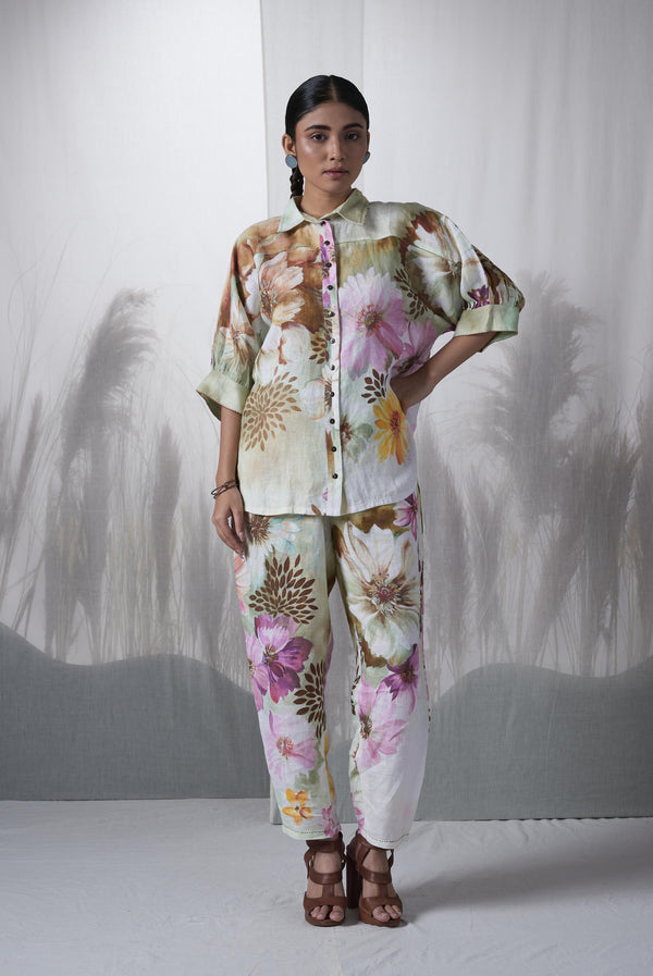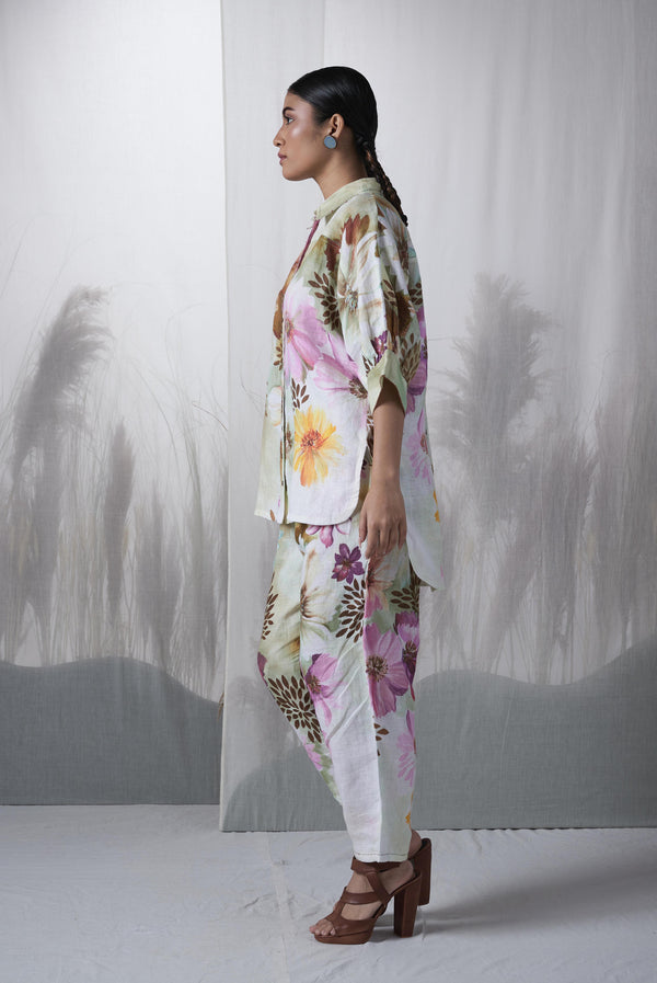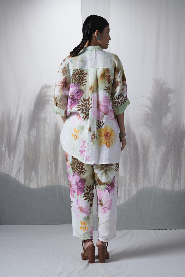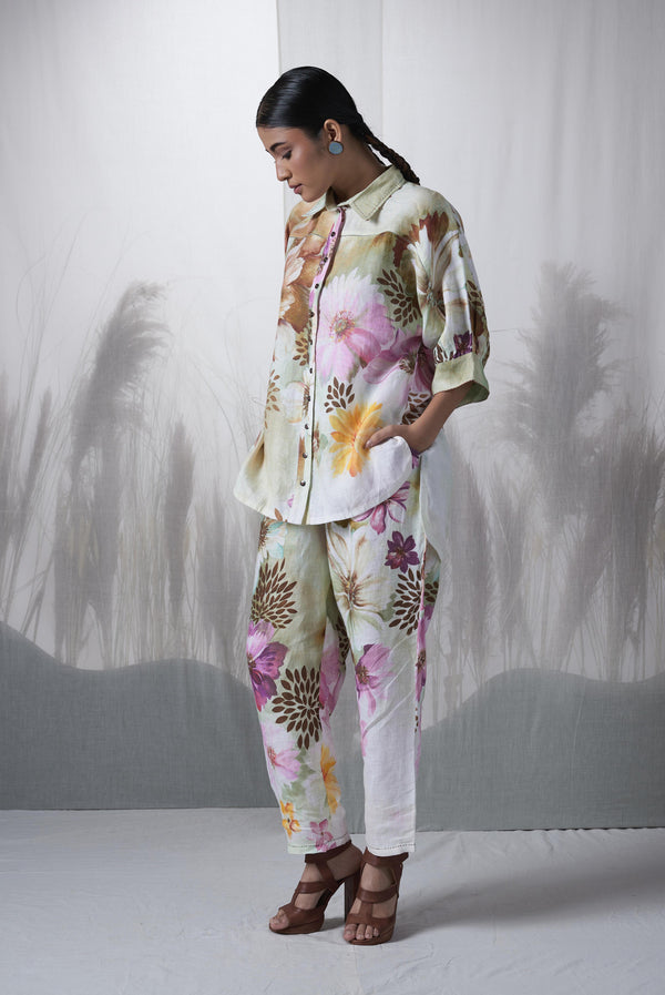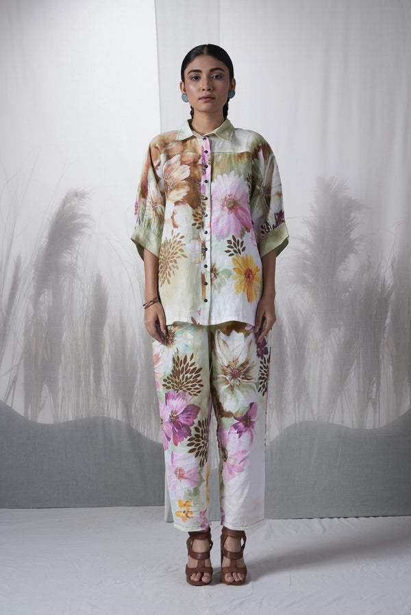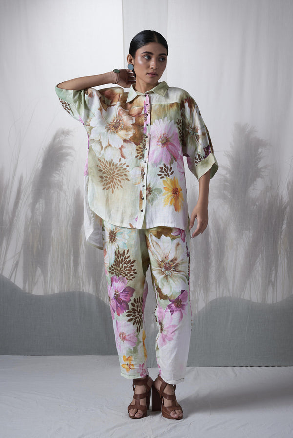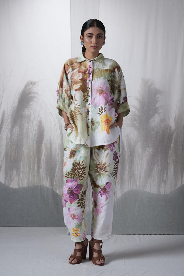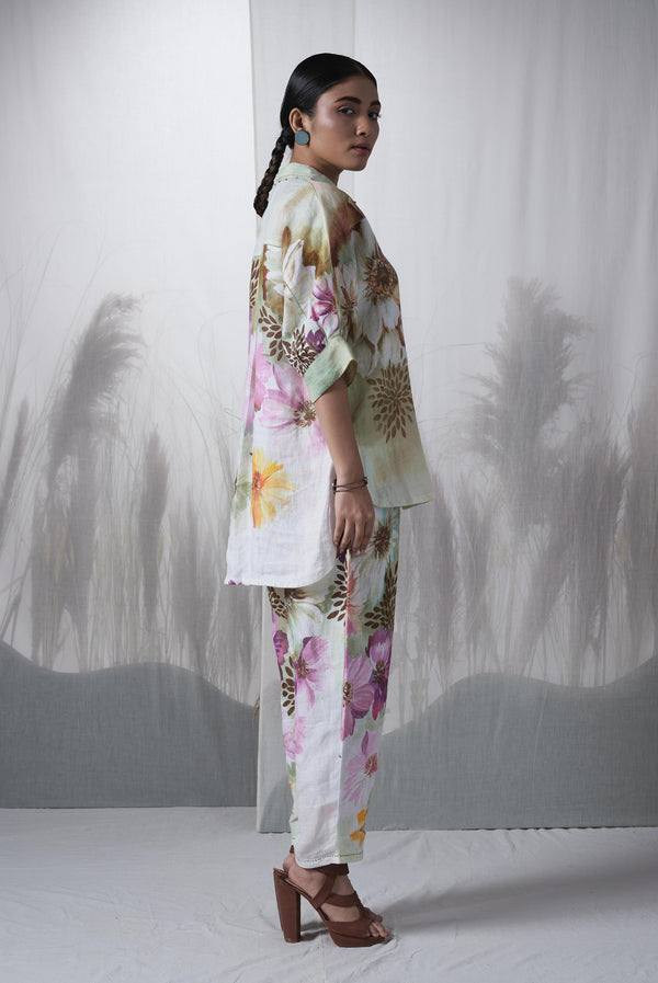 - Snuff floral printed, hand woven linen kimono shirt paired with pants.