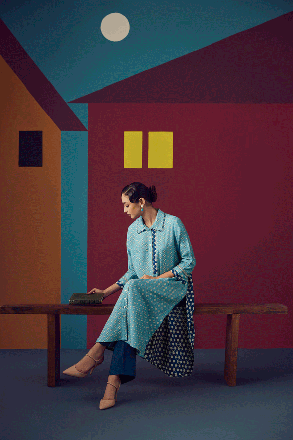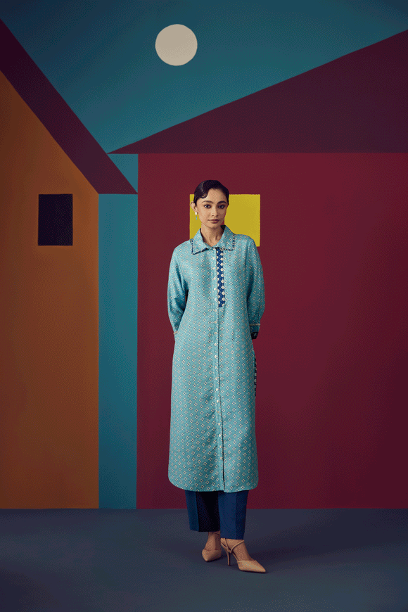 Sky and indigo hand woven, hand printed mulberry silk long shirt cord set