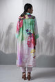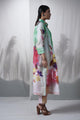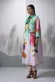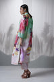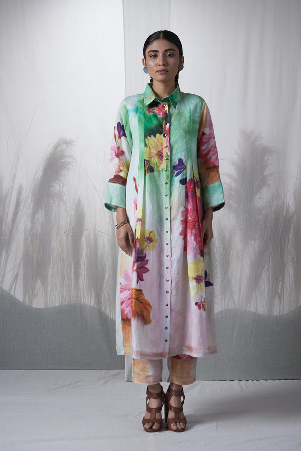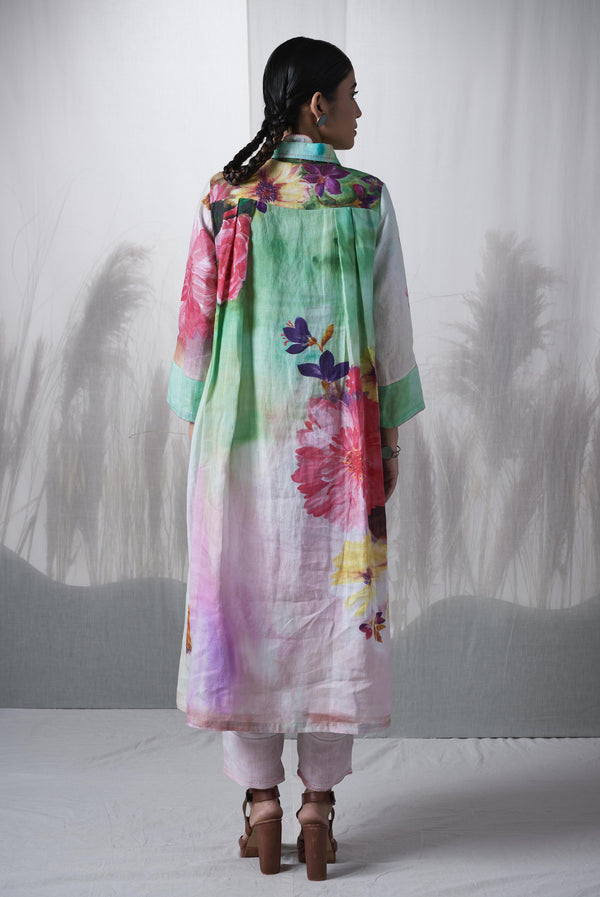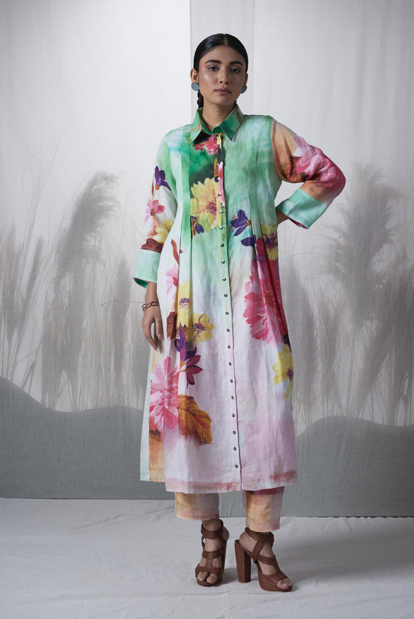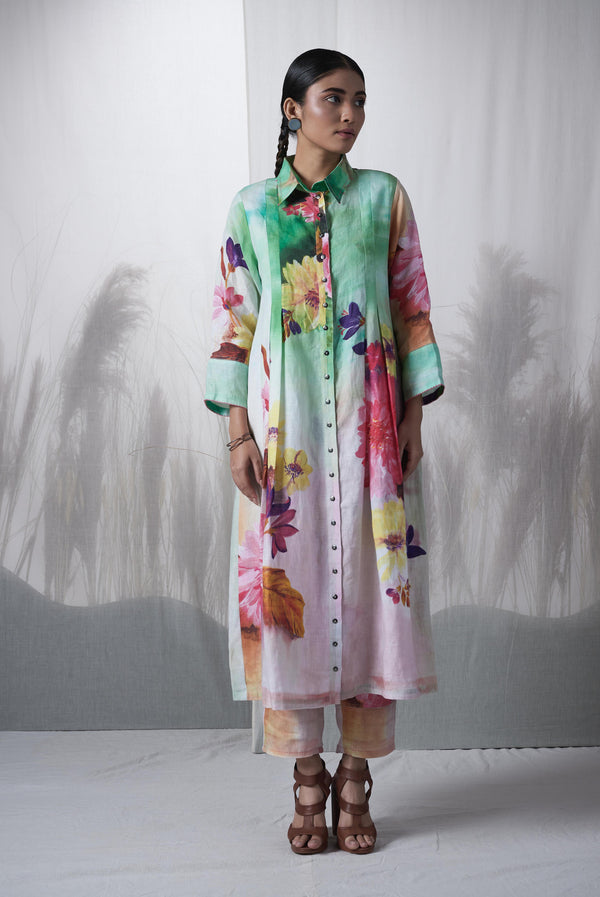 - Green floral printed, hand woven linen kurta with collar and pleat detailing in front and back, paired with pants.