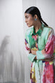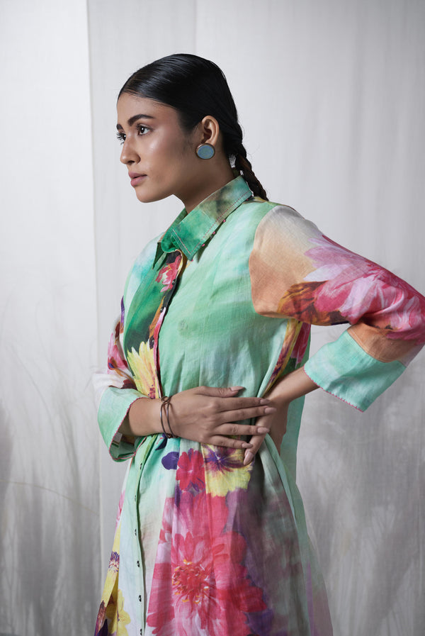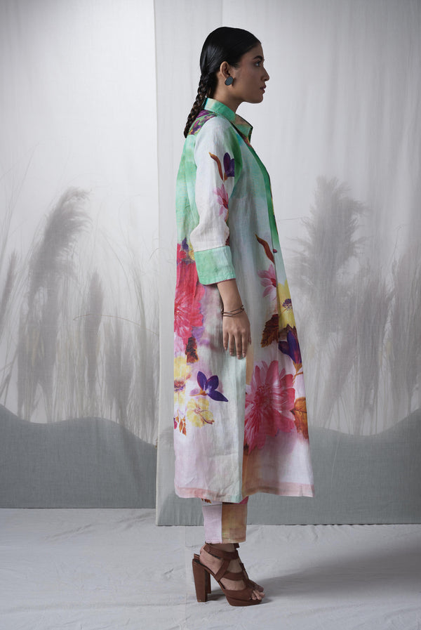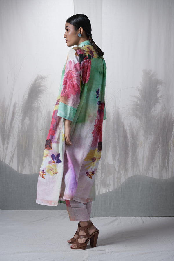 Green floral printed, Begonia hand woven linen kurta paired with pants, sustainable cord set.