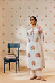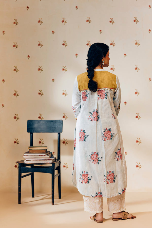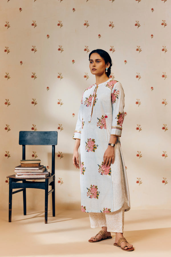 - Beat the heat in style with this airy and elegant off-white khadi cotton tunic set, designed to keep you cool and comfortable during high summer days. Handwoven from pure, breathable khadi cotton, the tunic features a charming sky blue and pink rose hand block print, elevated with a smart Mandarin collar and front placket for a refined ethnic-contemporary look.