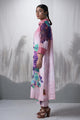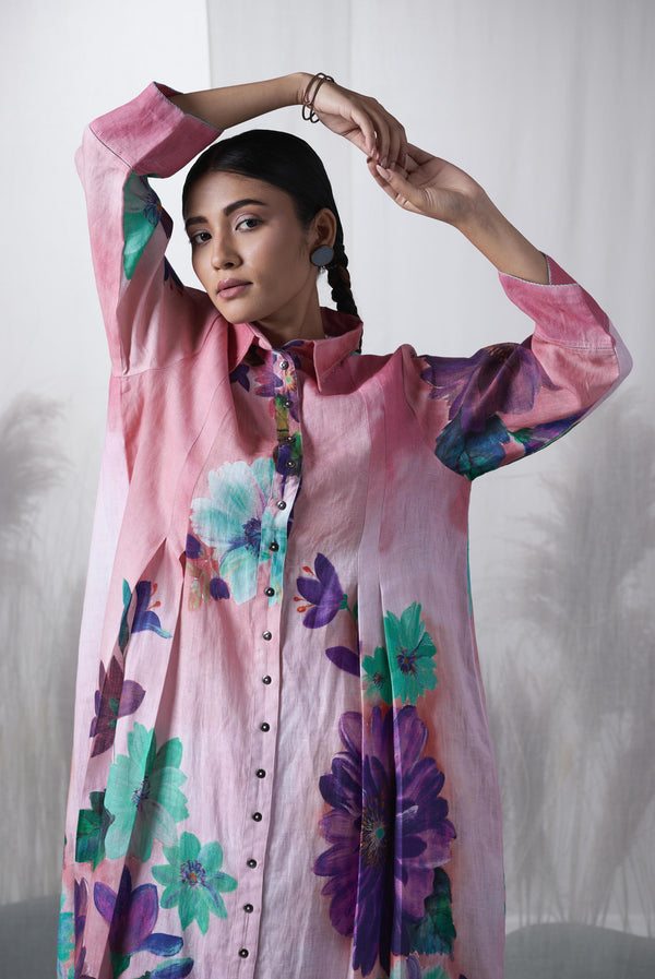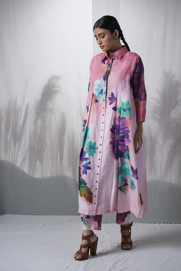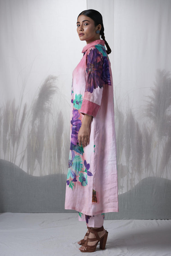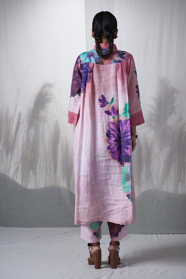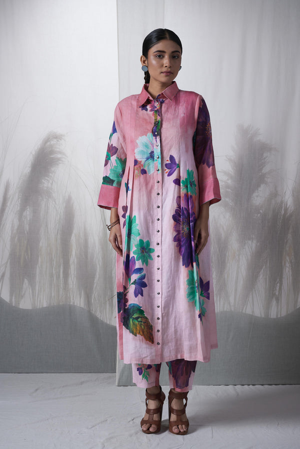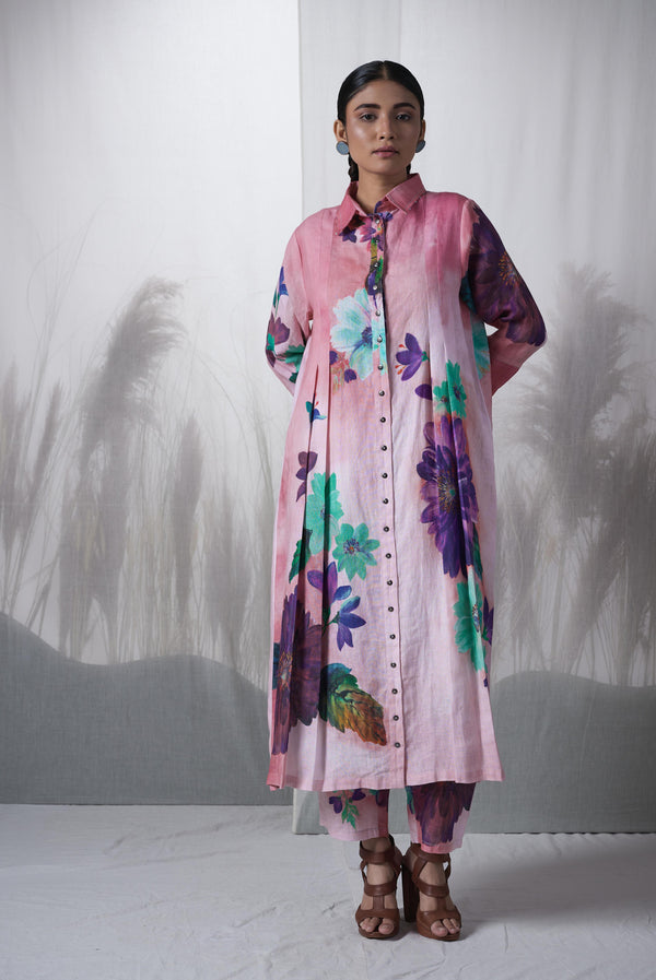 • Pink floral printed, hand woven linen  kurta with collar and pleat detailing in front and back, paired with pants.