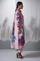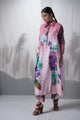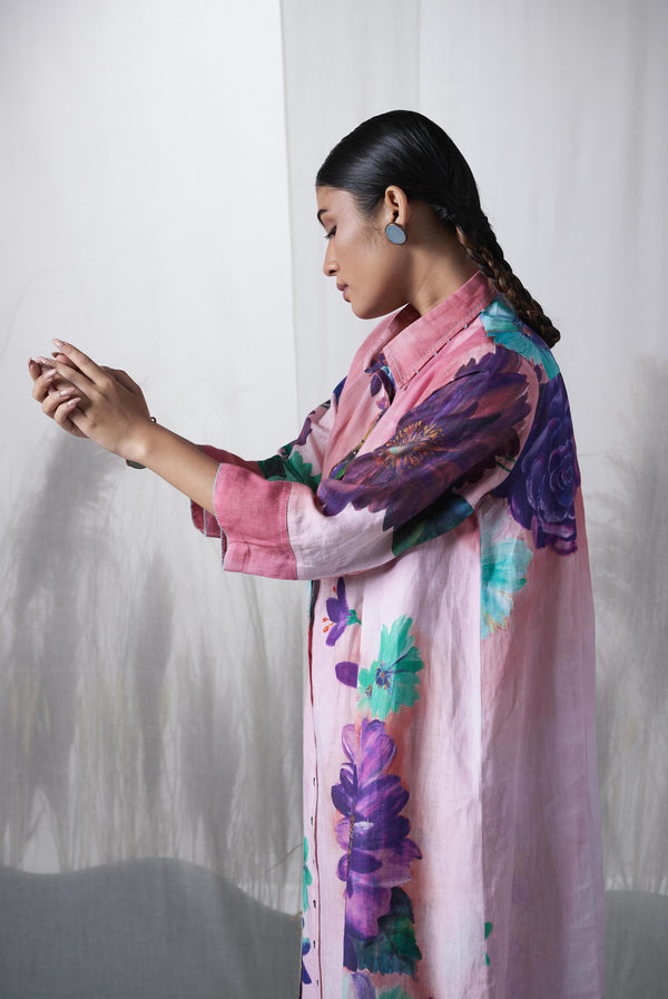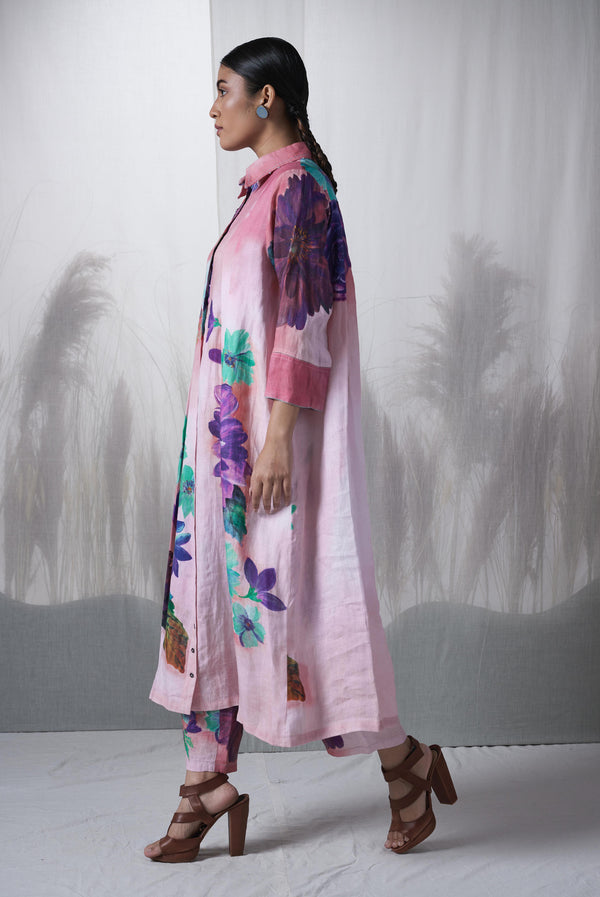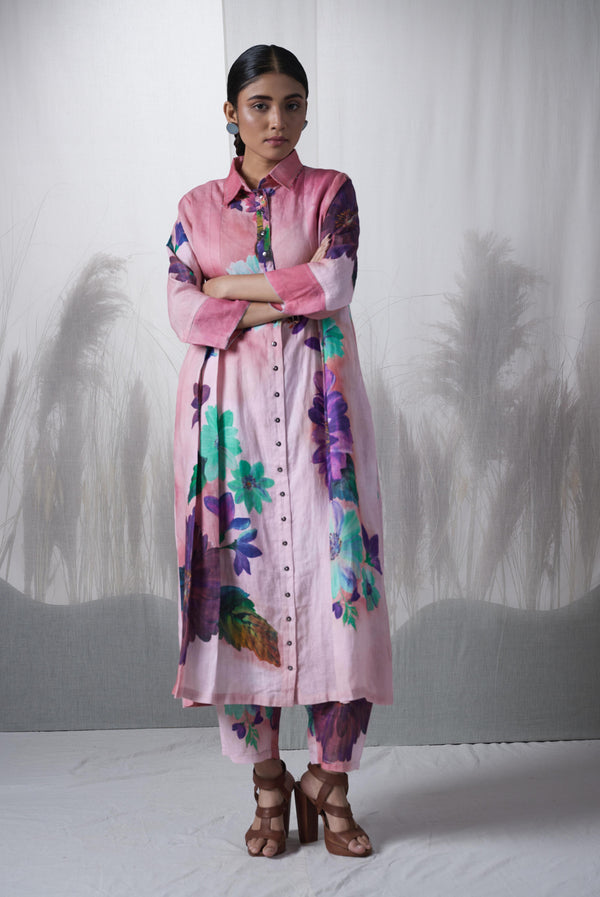 Pink floral printed, Liana hand woven linen kurta, paired with pants, sustainable cord set.