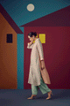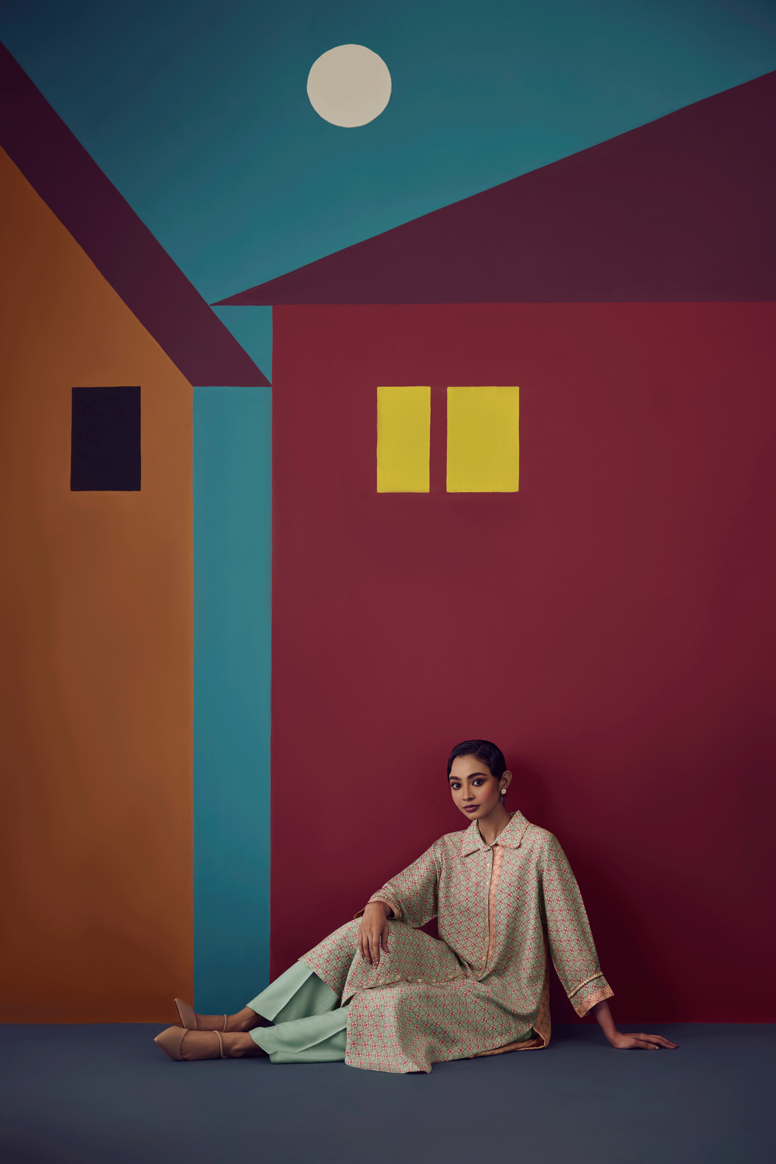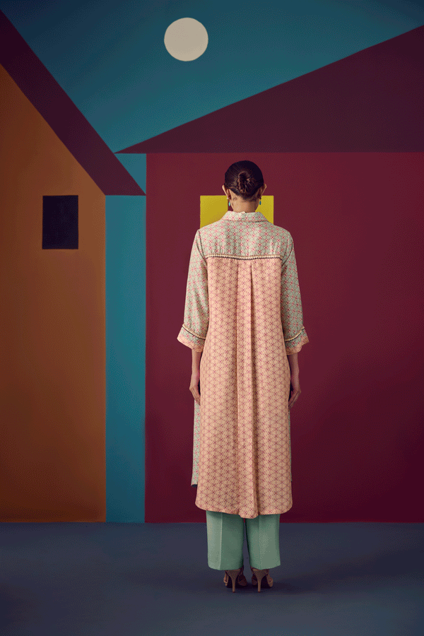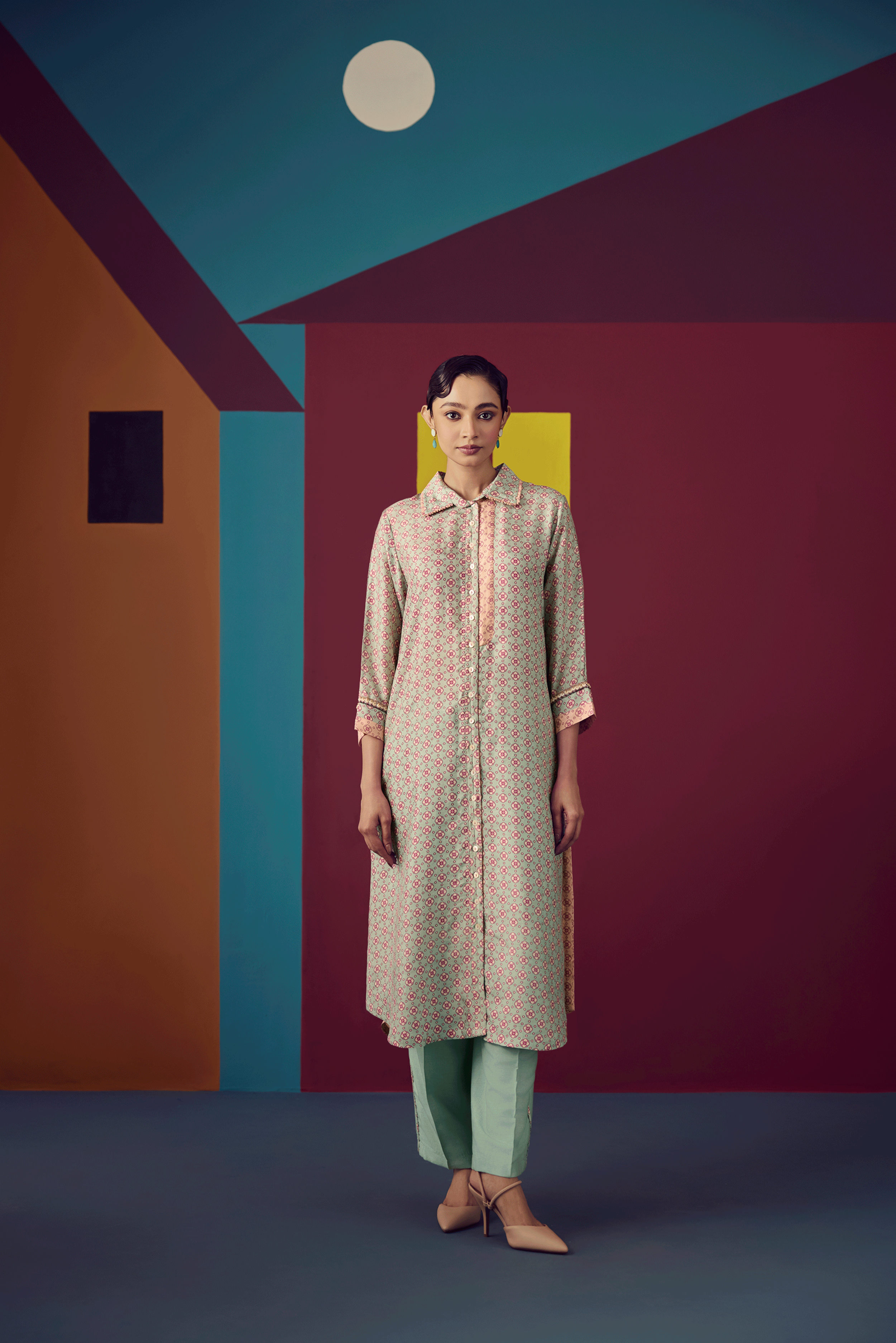 - Hand woven, hand printed mulberry silk dual tone long shirt tunic, paired with pale blue cotton silk pants.