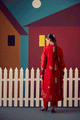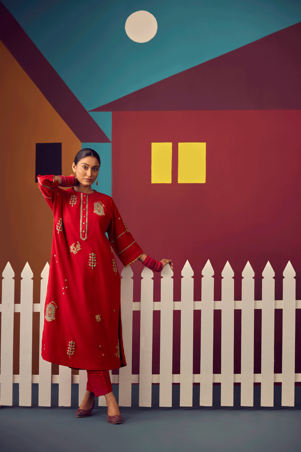 - Red Hand woven matka silk hand embroidered antifit kurta set with kaftan cut sleeves, paired with a matka silk pants and chanderi tissue dupatta.