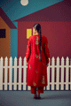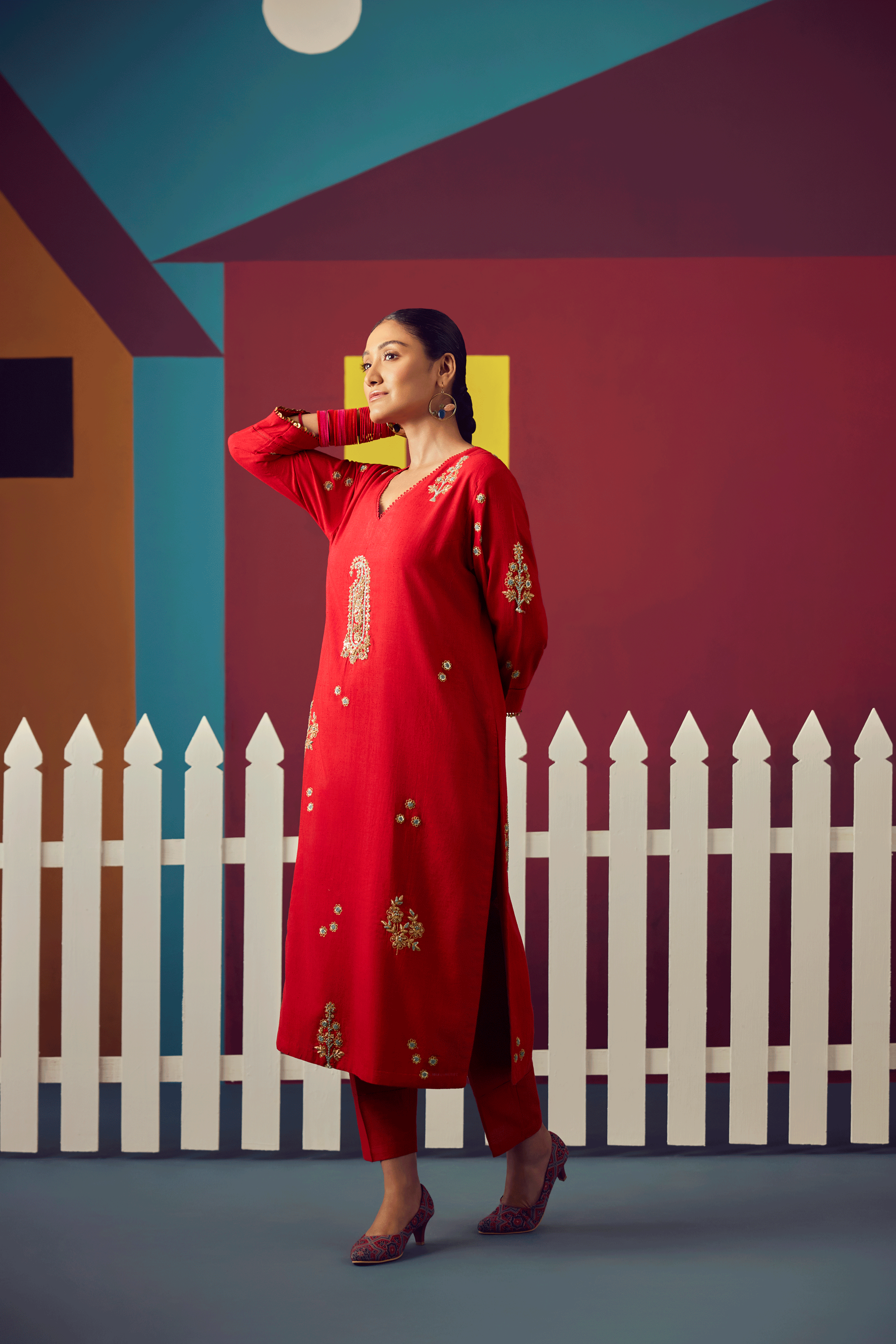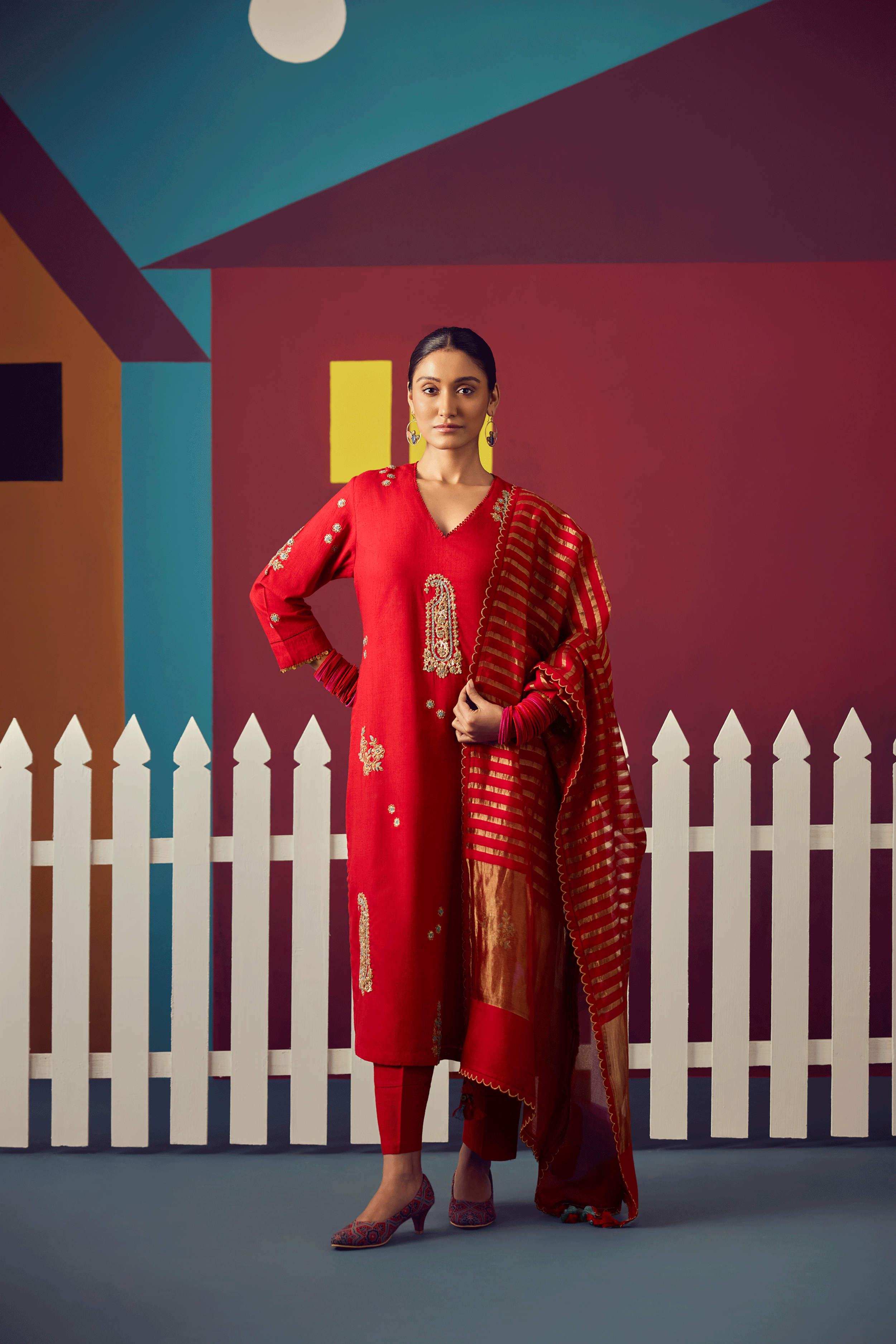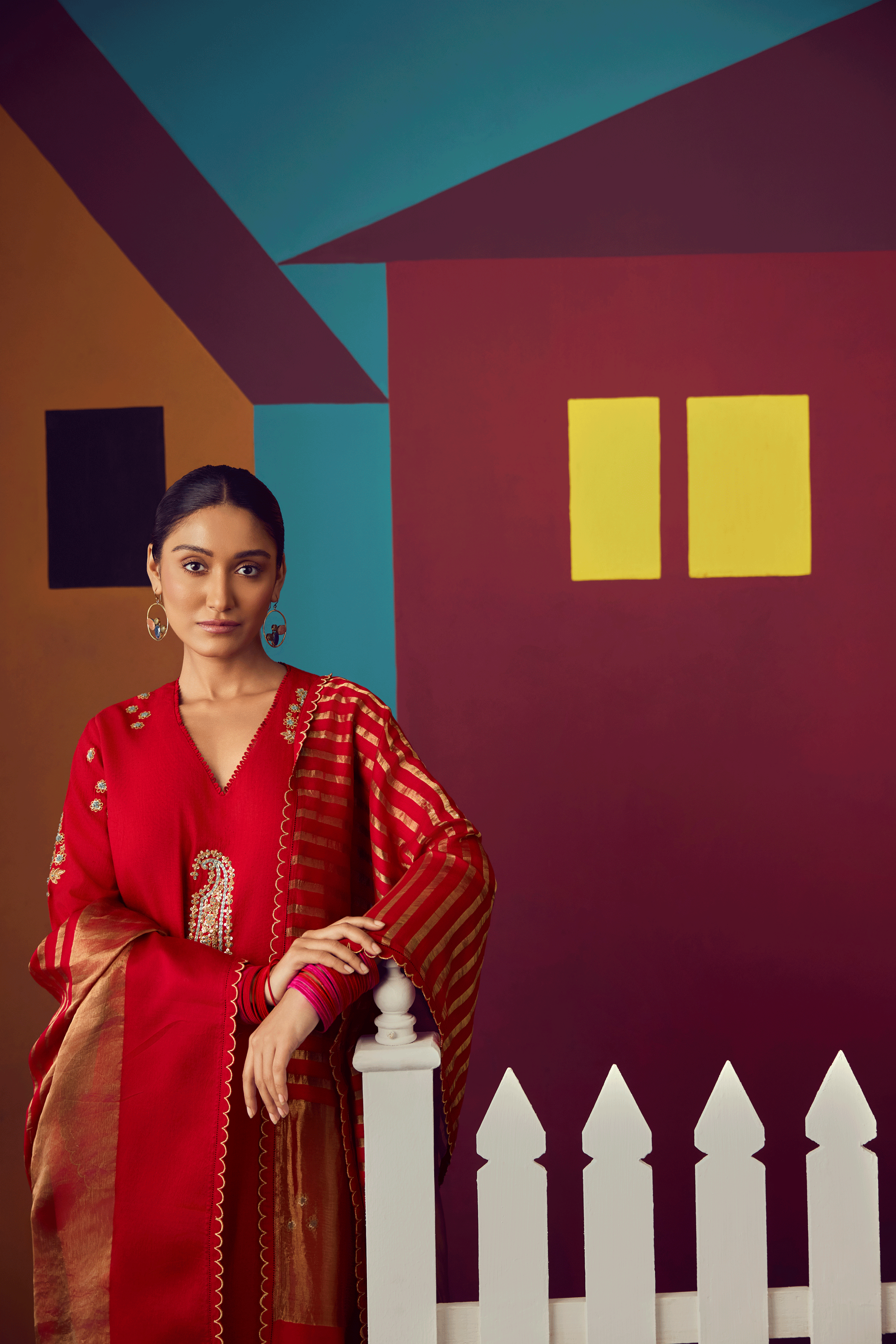 - Red Hand woven matka silk hand embroidered straight kurta set, paired with a matka silk pants and chanderi tissue dupatta.