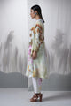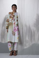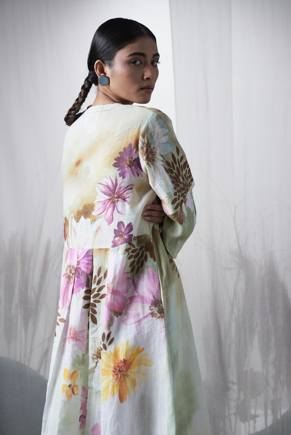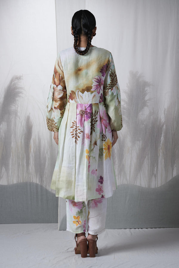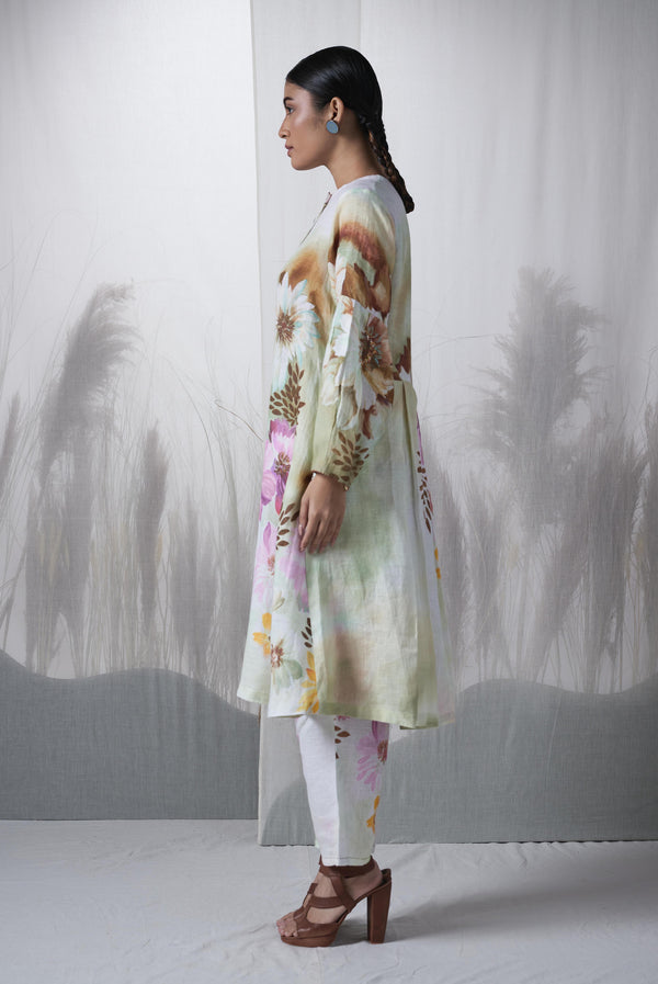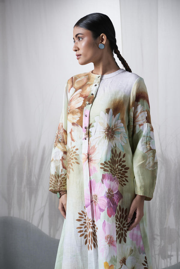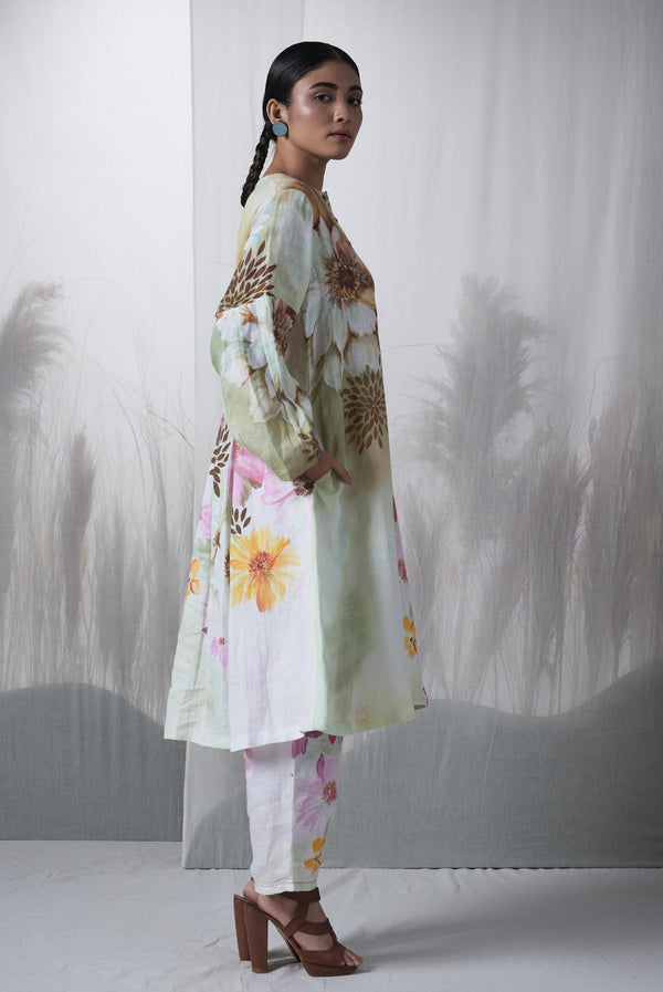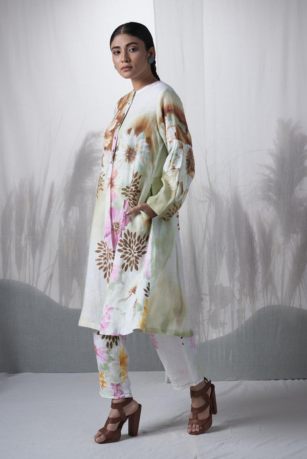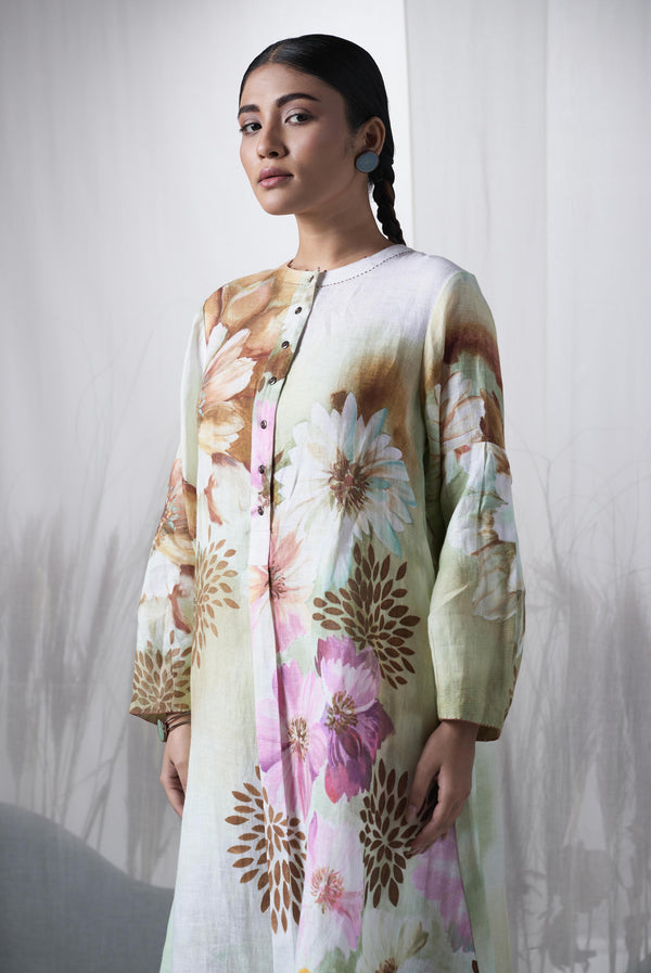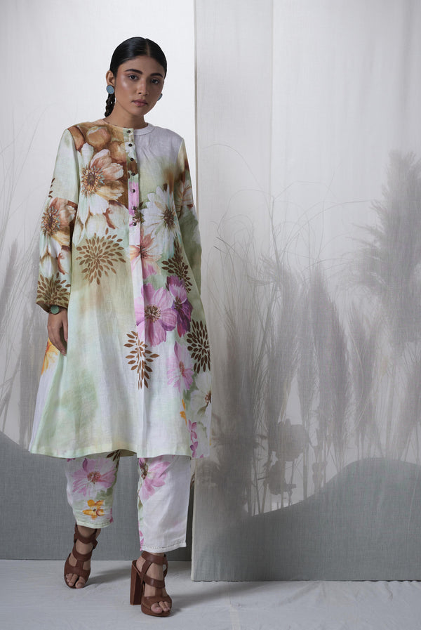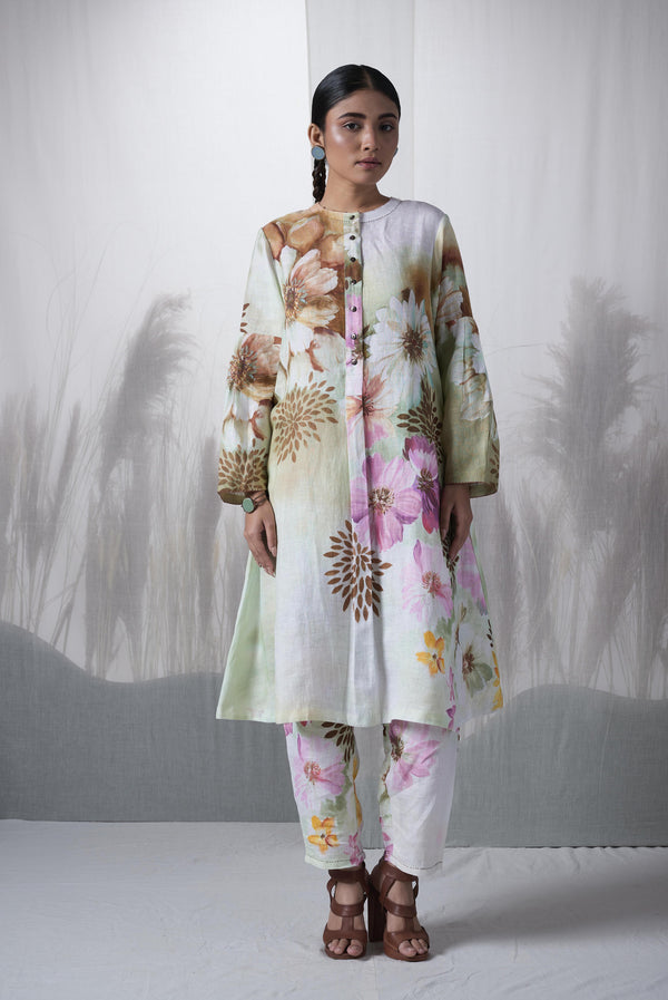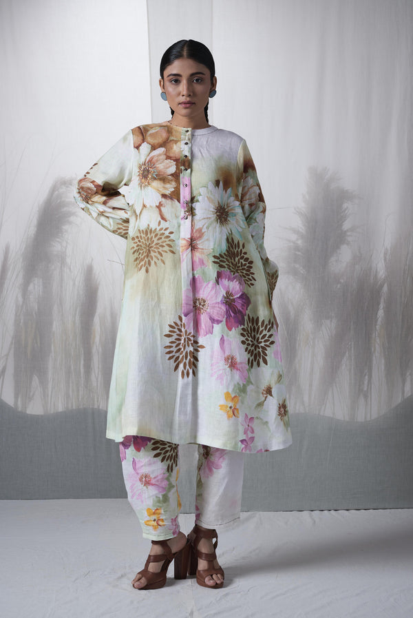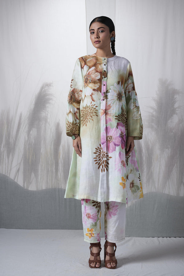 - Snuff floral printed, hand woven linen round neck kurta paired with pants, Cord set