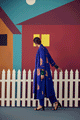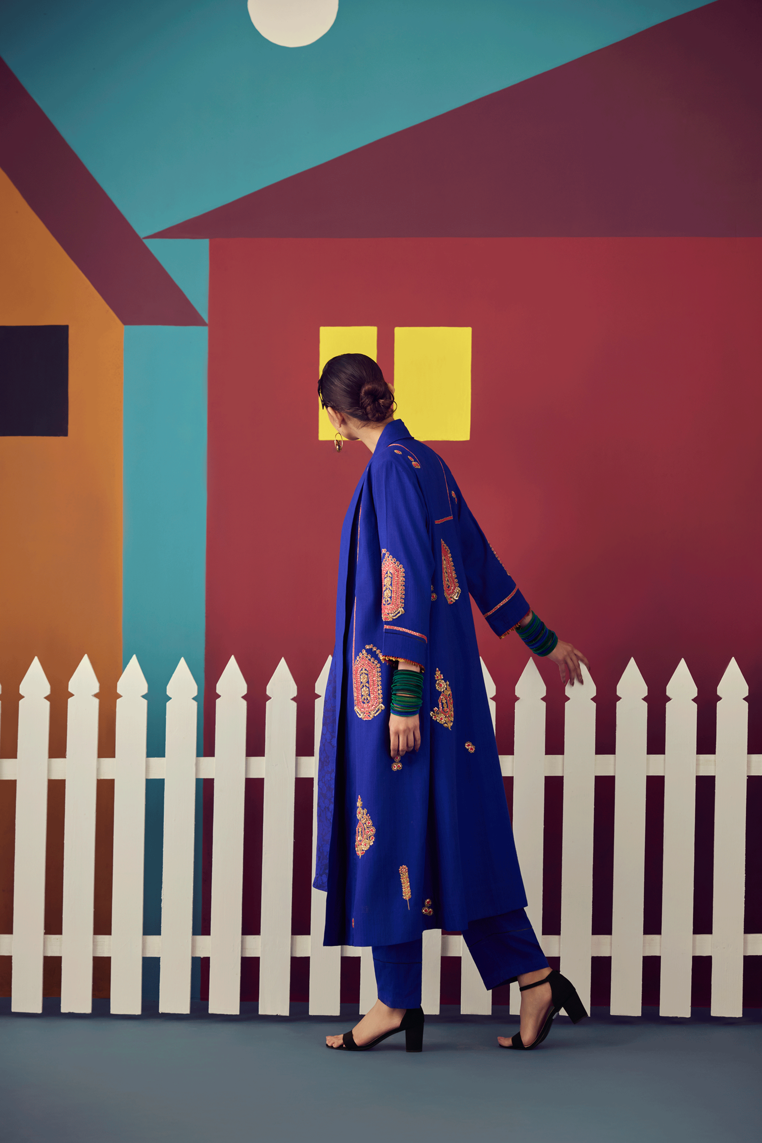 - Electric blue Hand woven matka silk hand embroidered front open shawl collar jacket, paired with a hand printed mulberry silk inner dress, and a pair of pants.