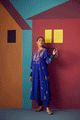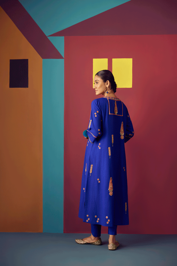 - Electric blue Hand woven matka silk hand embroidered A-line kurta set, with kaftan cut sleeves paired with a matka silk pants and chanderi tissue dupatta.