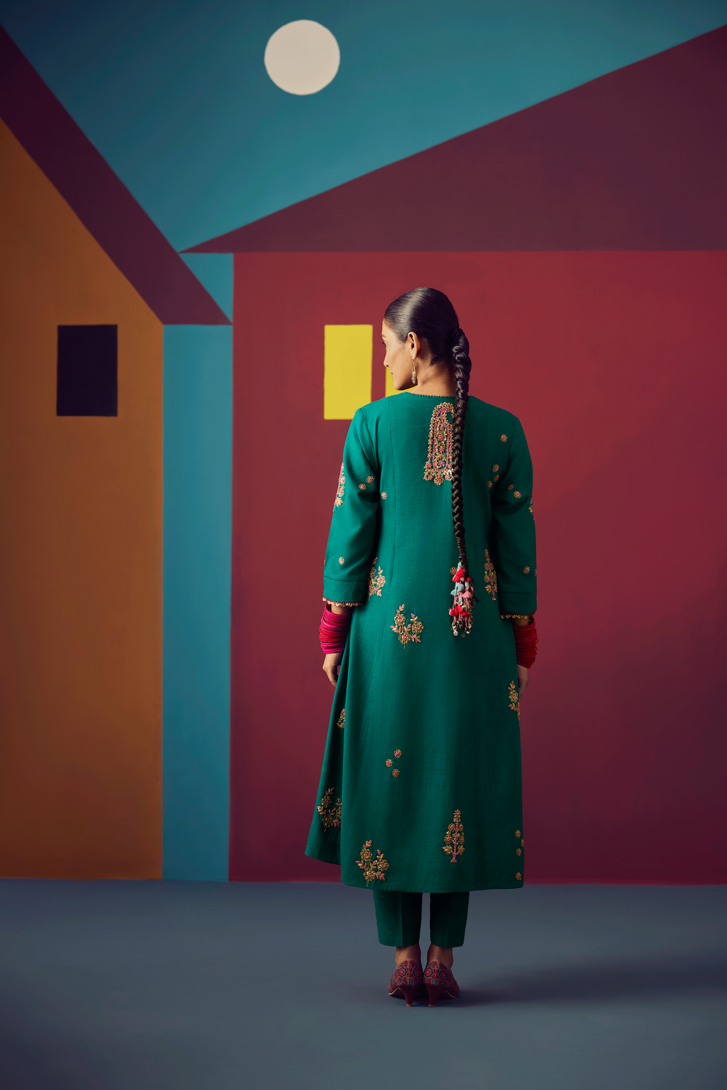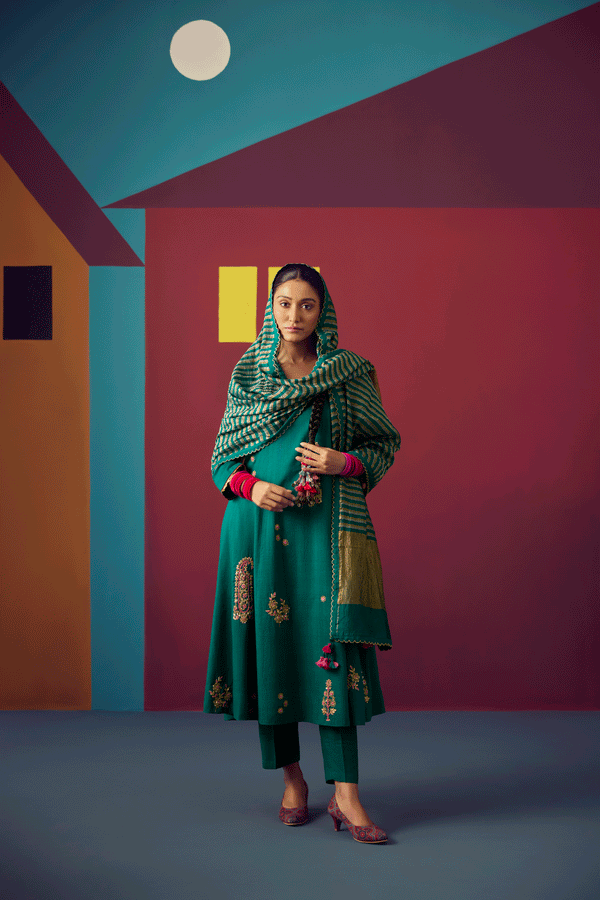 - Green silk khadi floral jamdani panelled a-line kurta with chine collar, paired with silk chanderi dupatta and pants