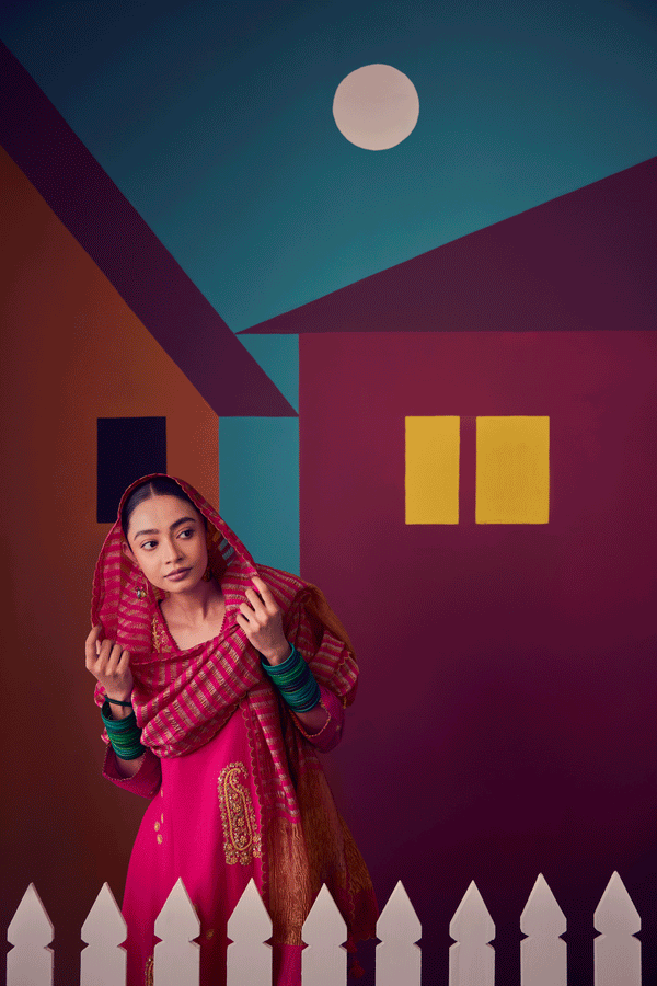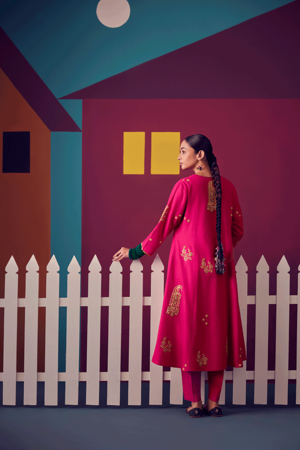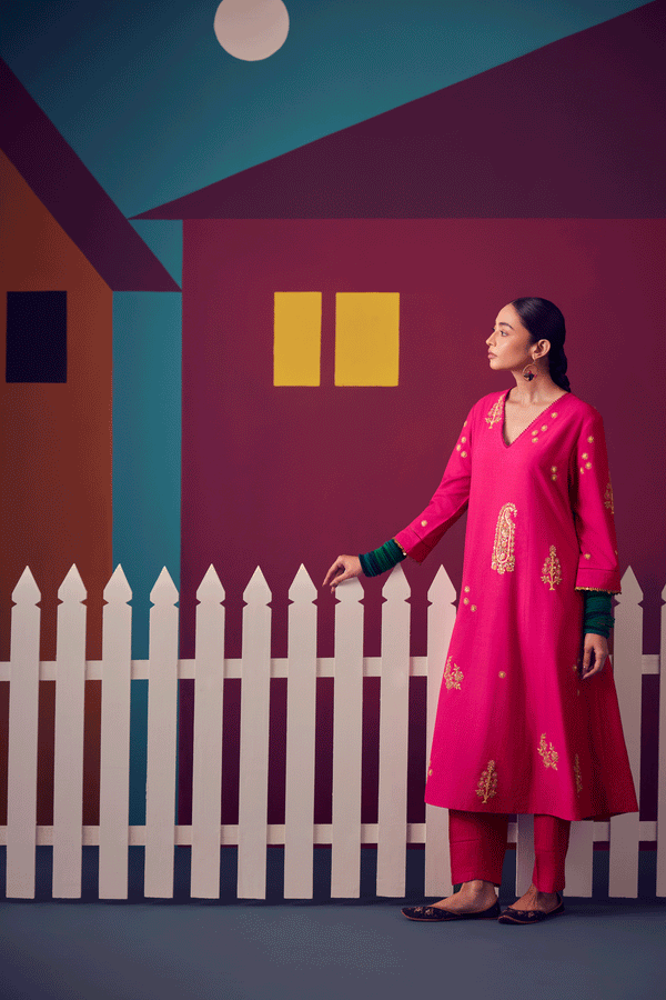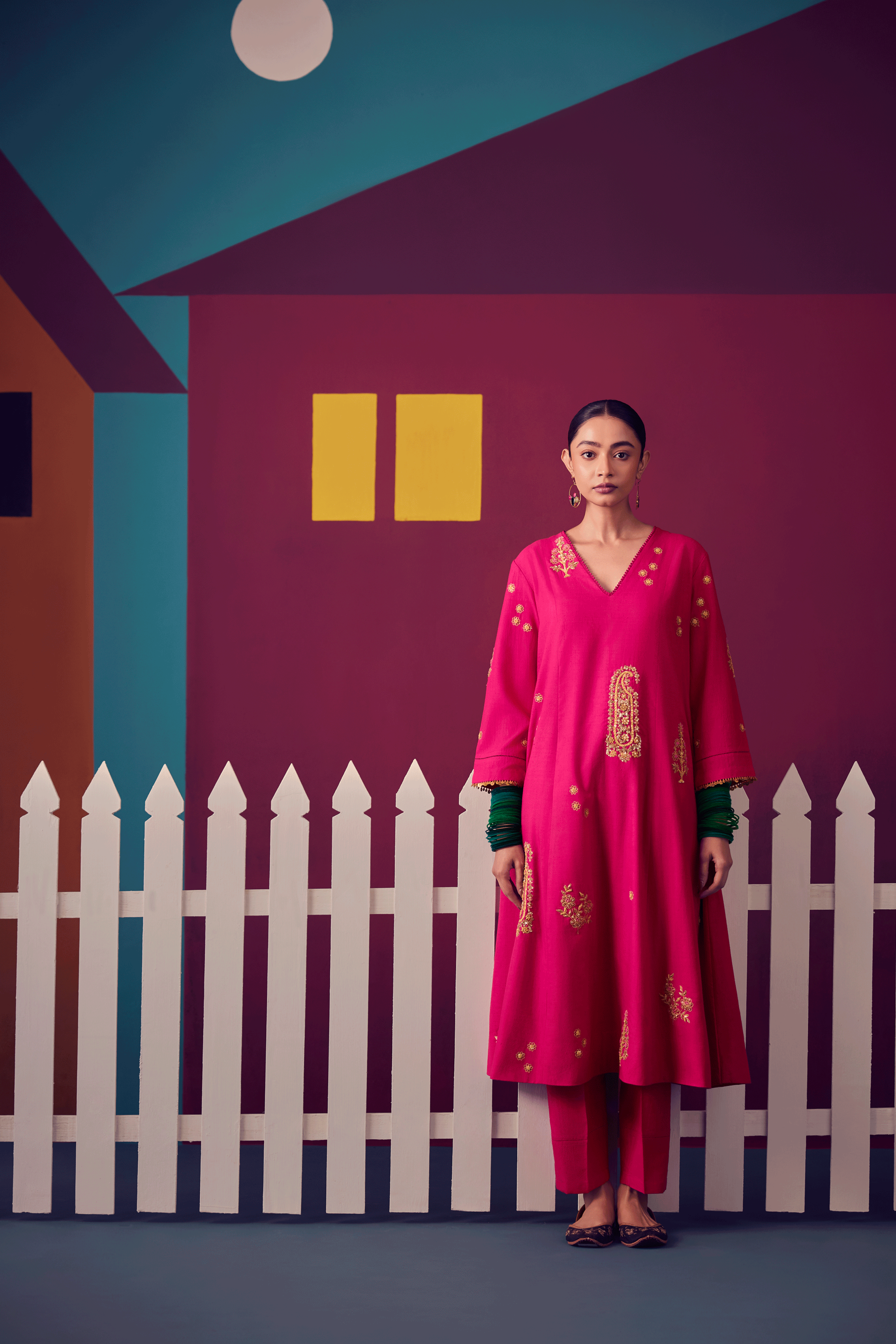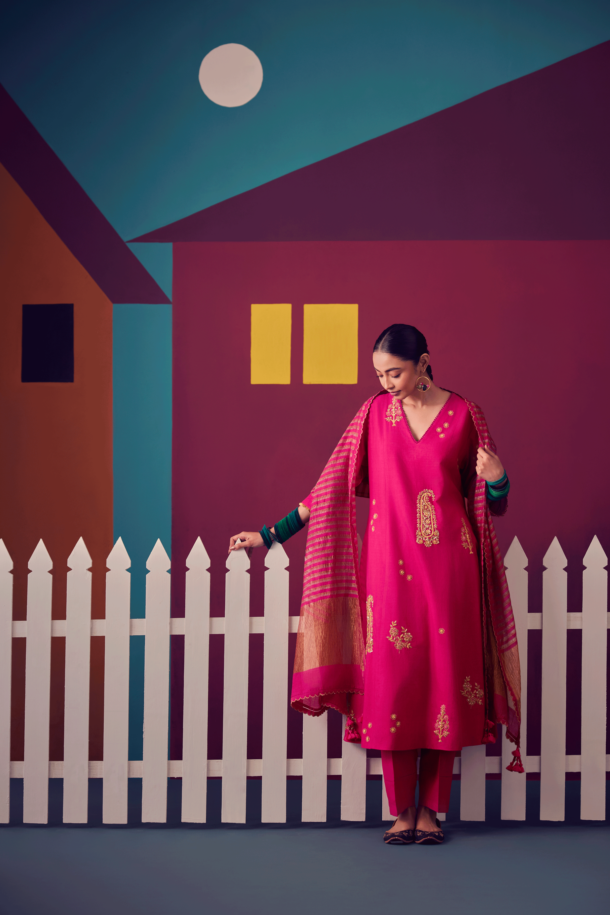 - Pink Hand woven matka silk hand embroidered A-line kurta set, paired with a matka silk pants and chanderi tissue dupatta.