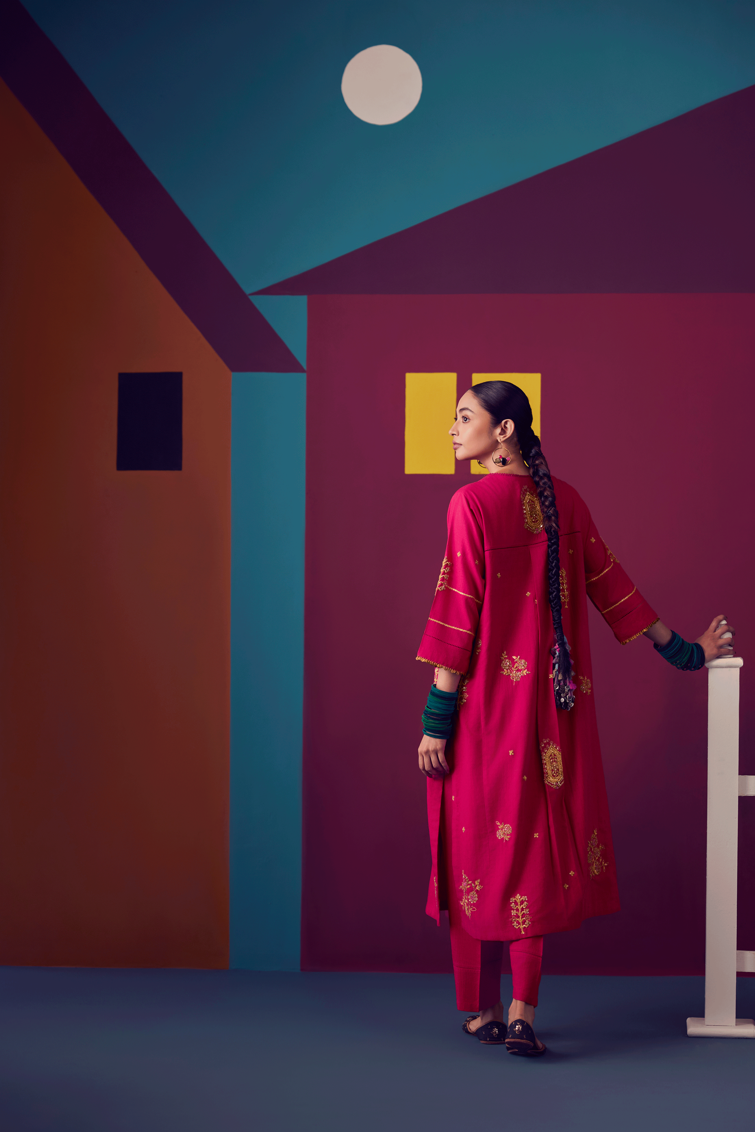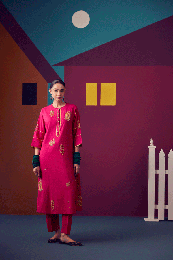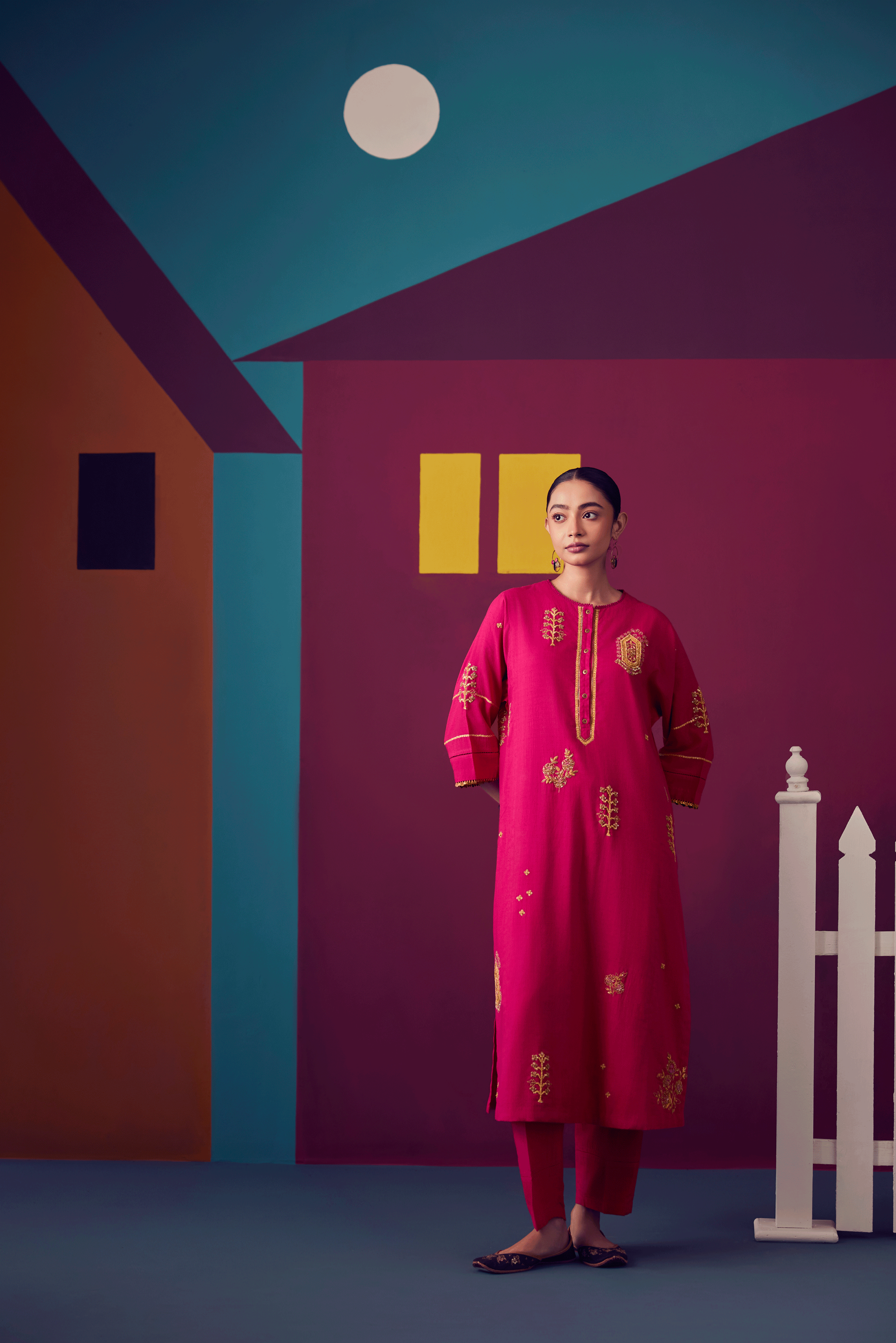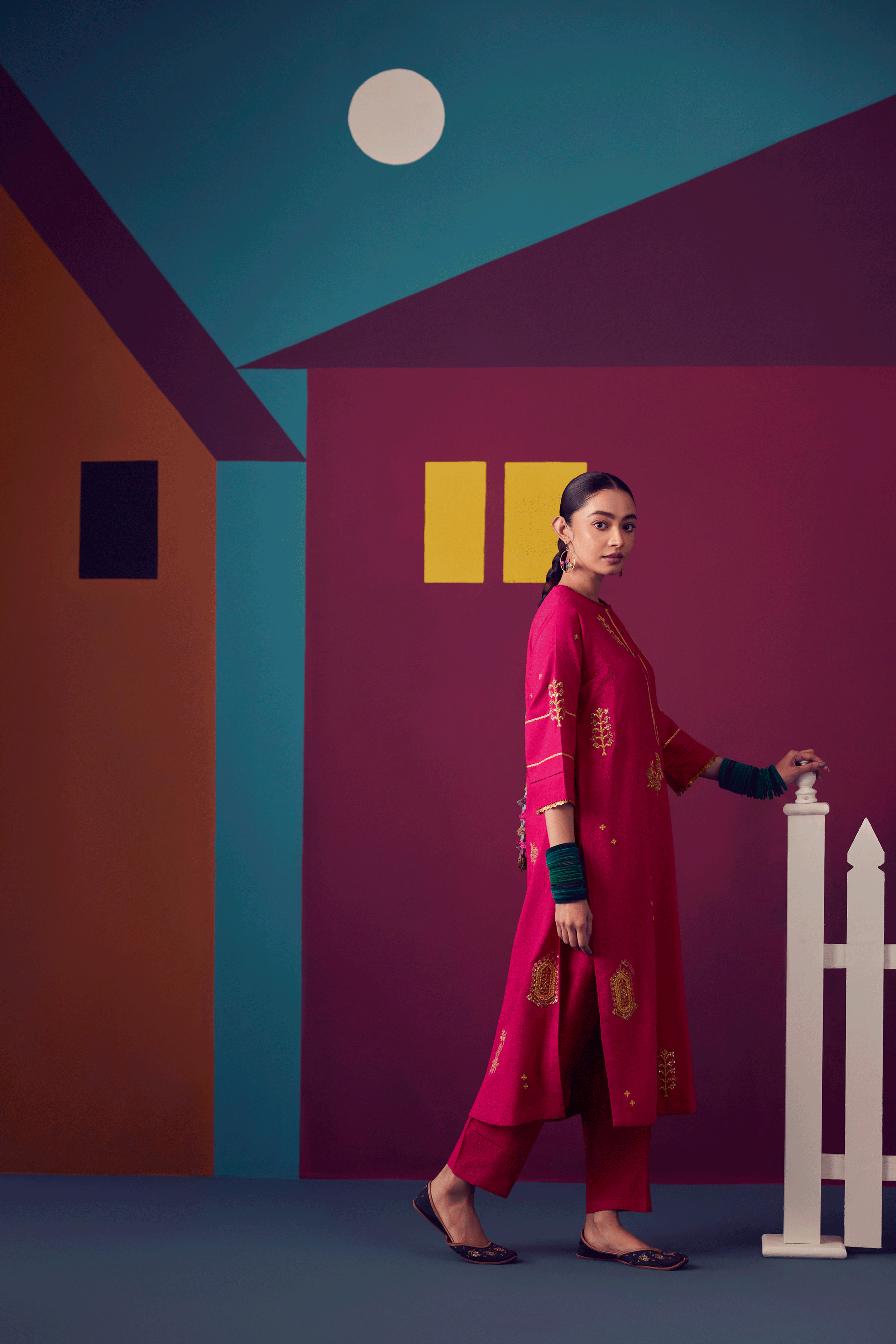 Pink hand woven matka silk embroidered kaftan cut kurta set