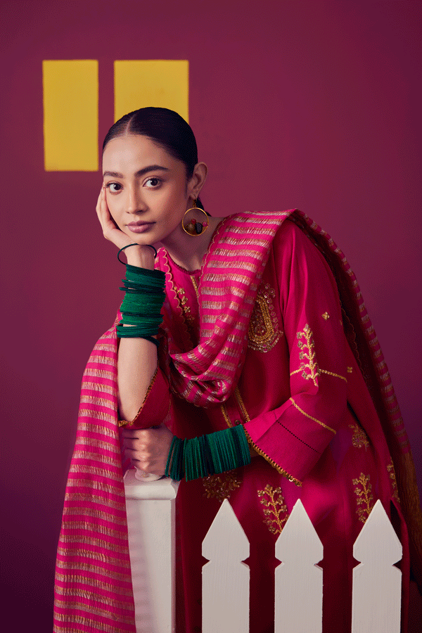 • Pink Hand woven matka silk hand embroidered antifit  kurta set with kaftan cut sleeves, paired with a matka silk pants and chanderi tissue dupatta.