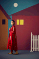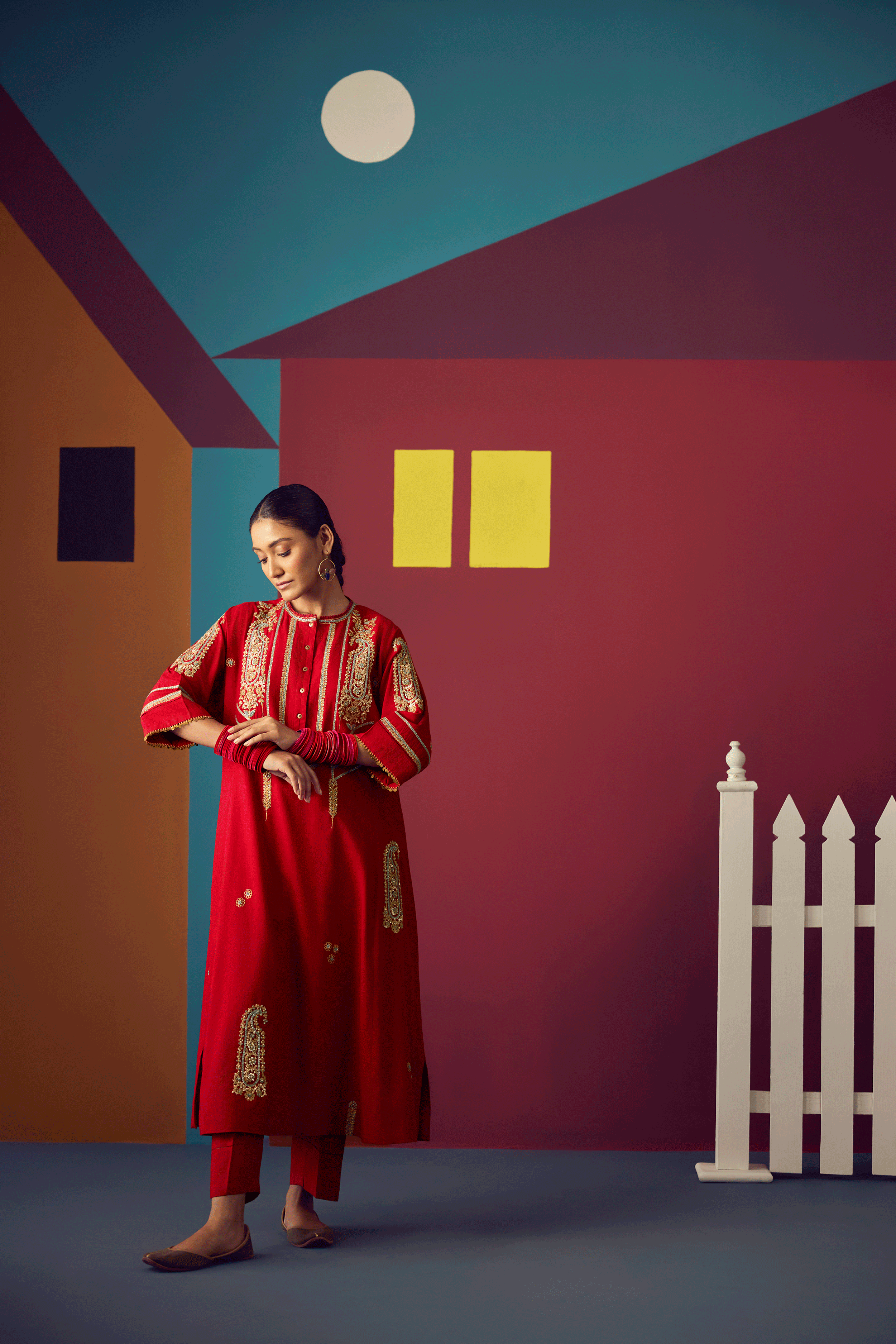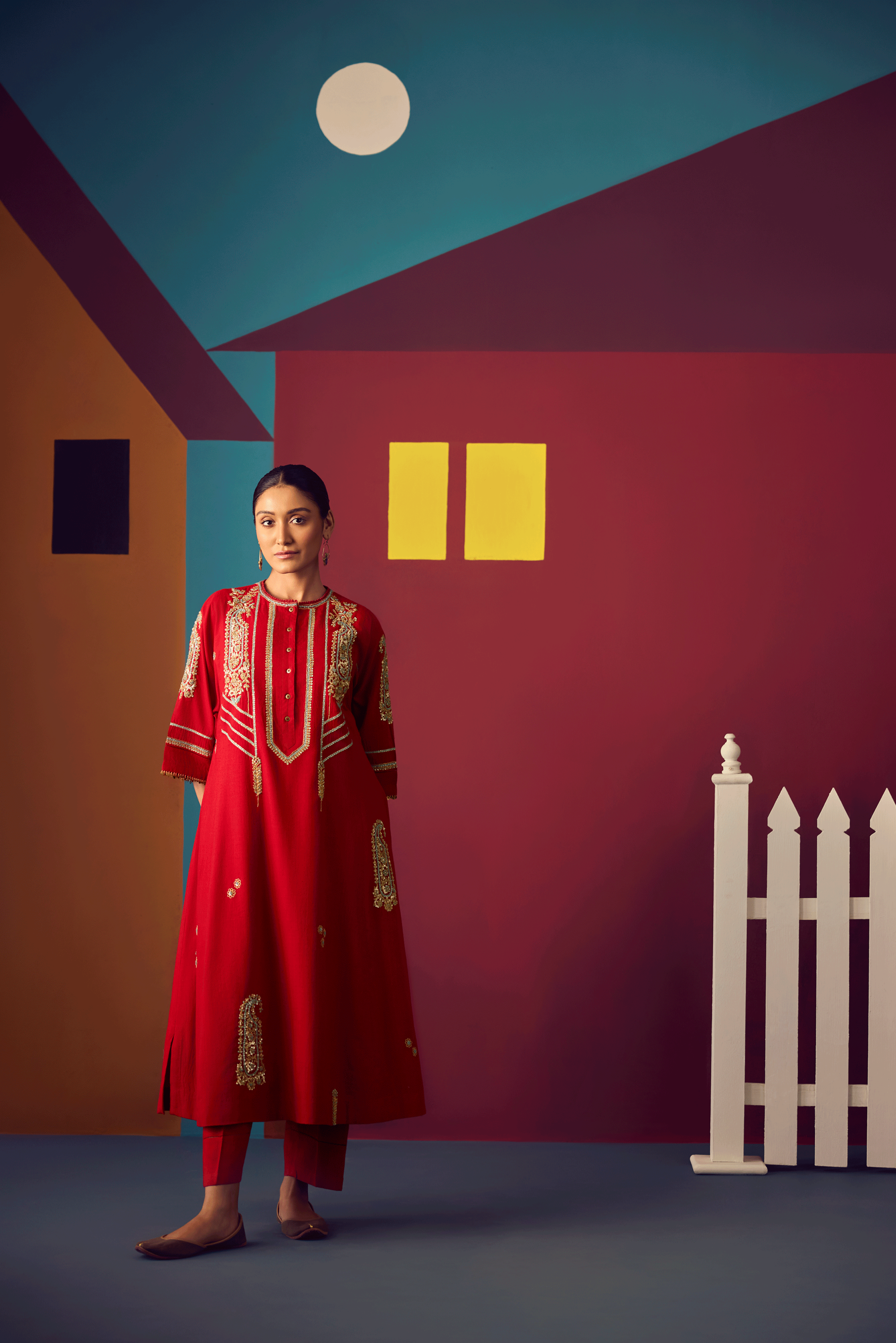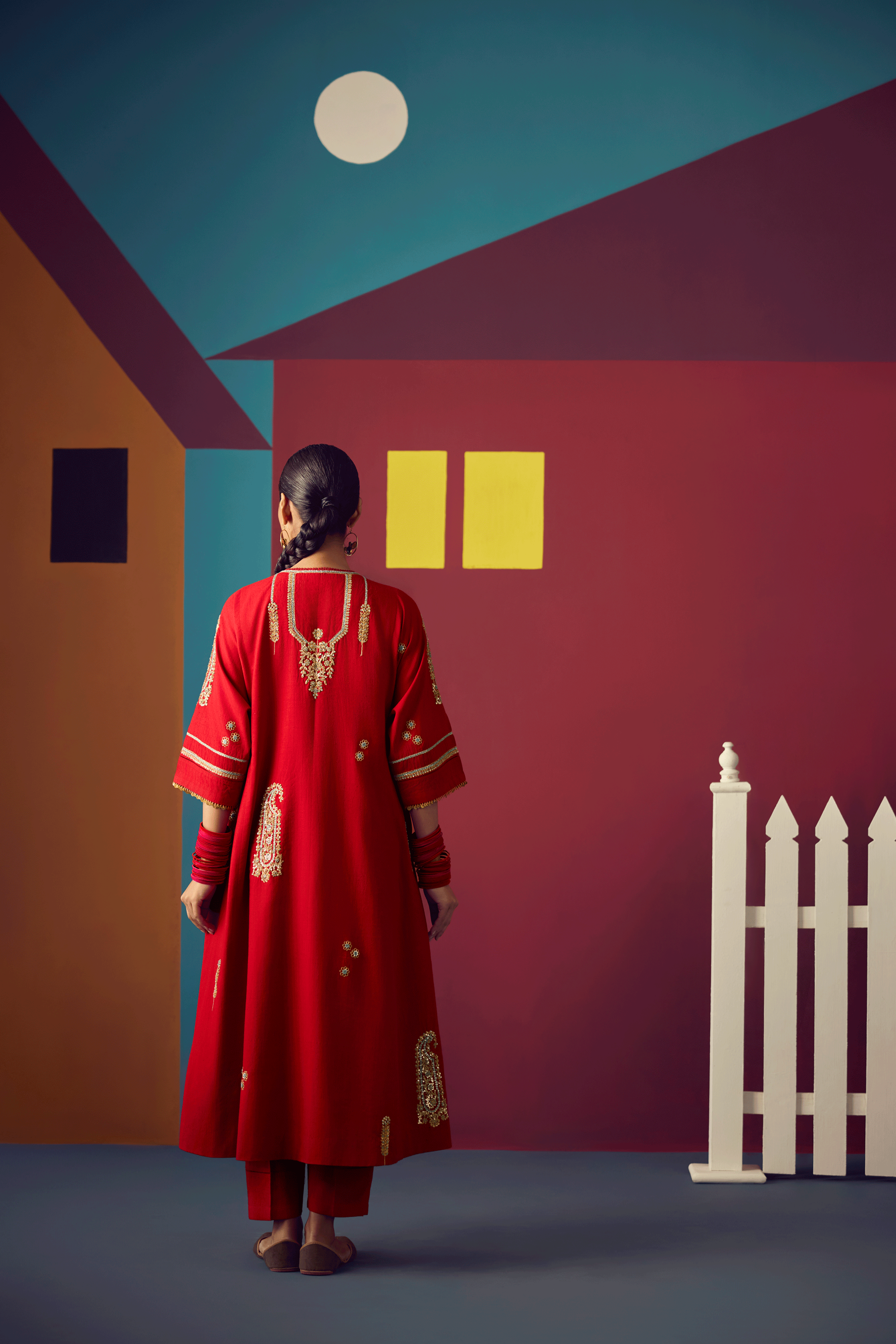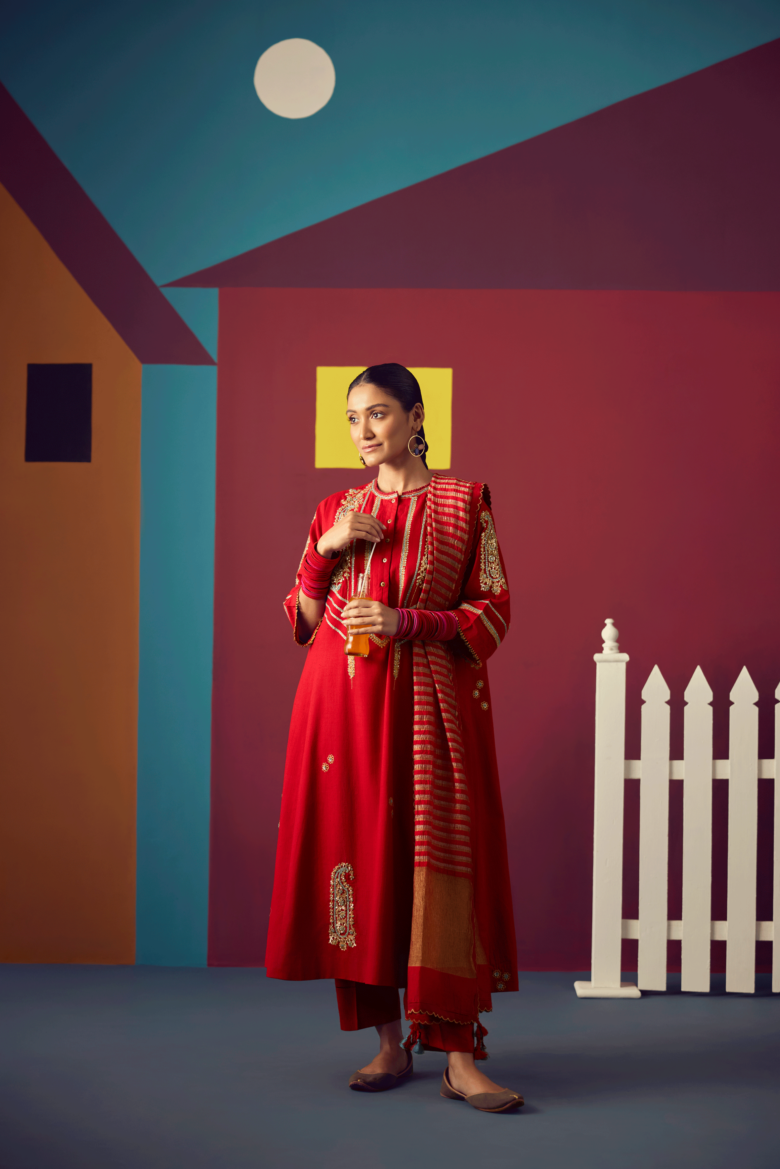 • Red Hand woven matka silk hand embroidered A-line  kurta set, with kaftan cut sleeves paired with a matka silk pants and chanderi tissue dupatta.