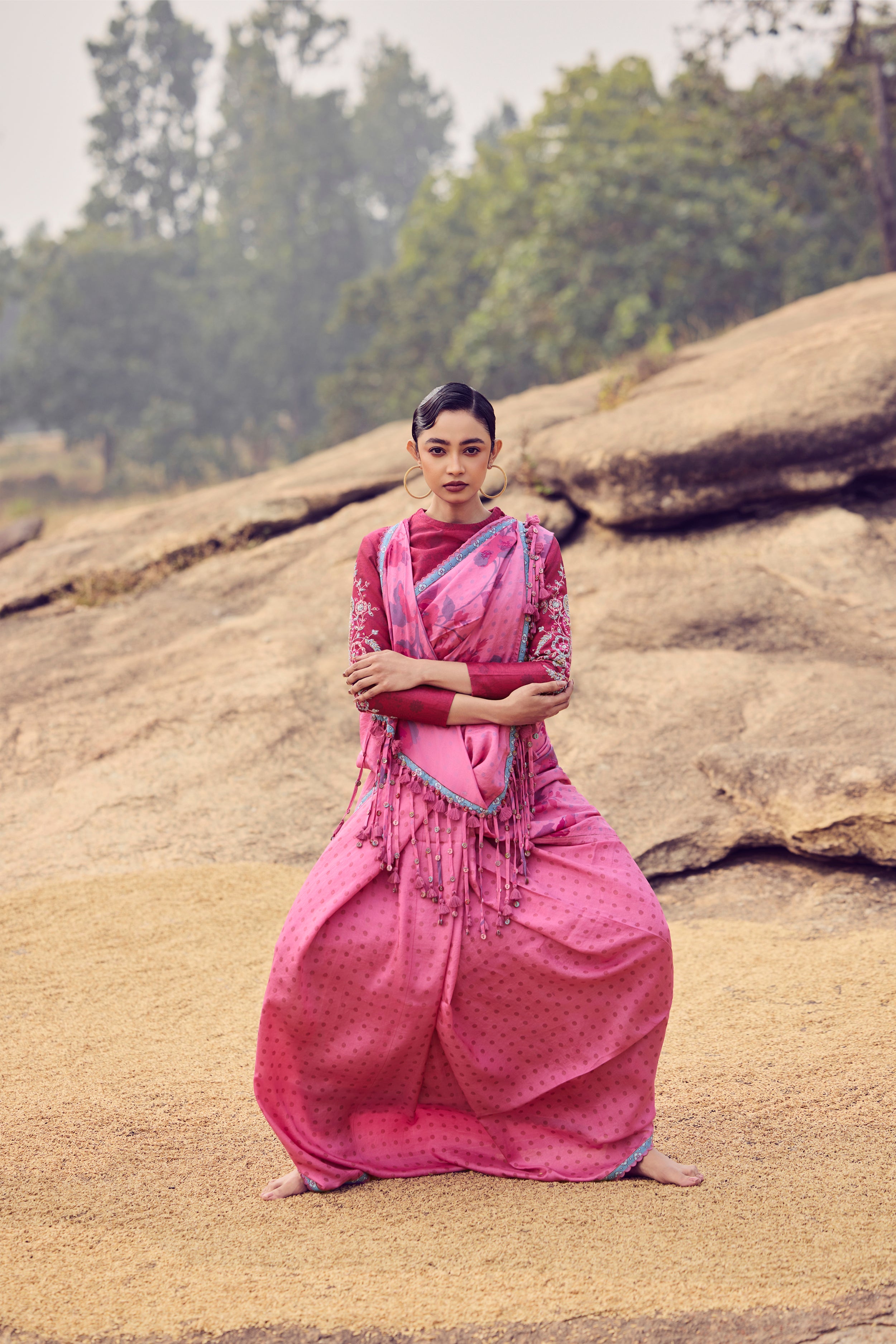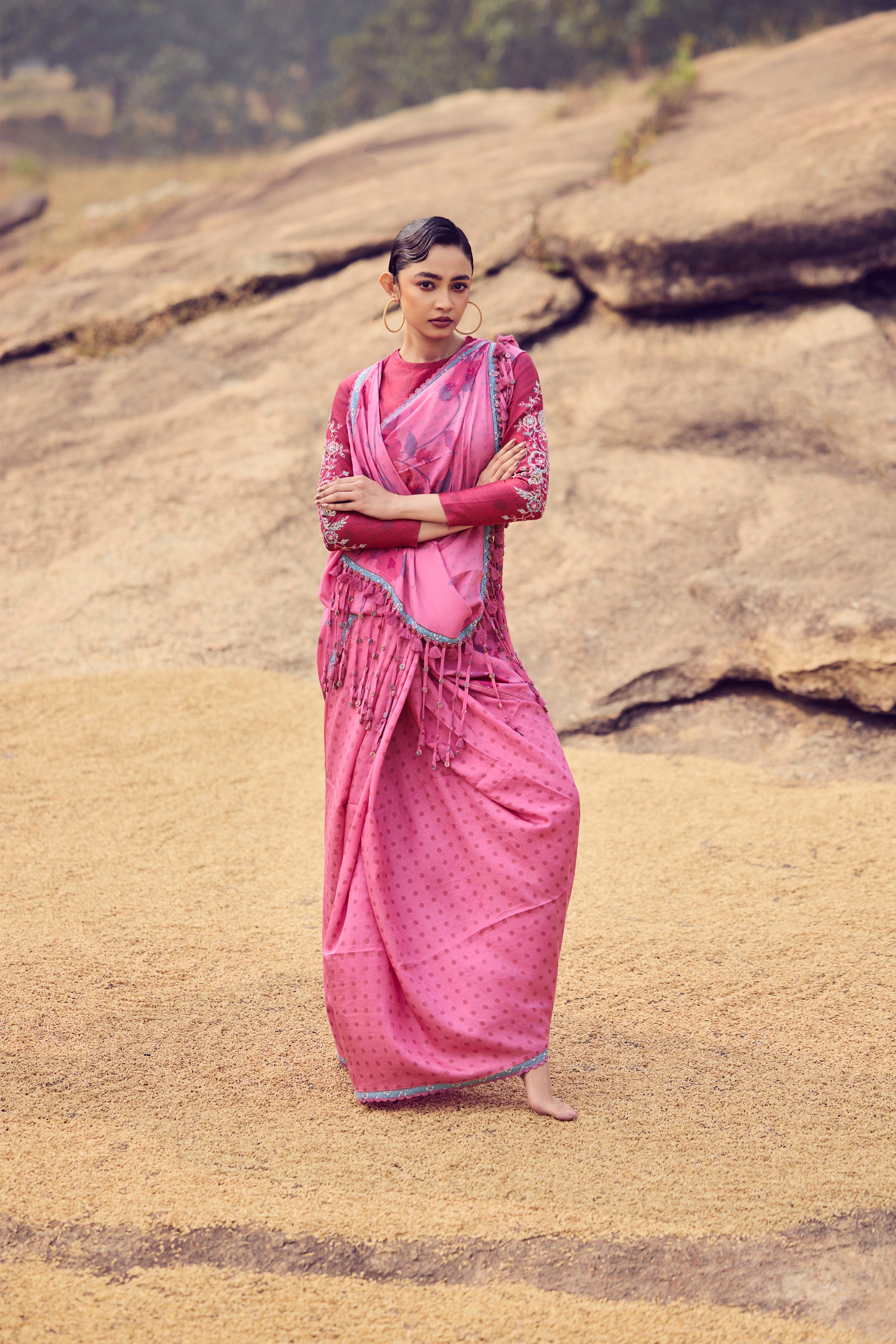 Warm as a twilight blush, this salmon pink handwoven mulberry silk saree is adorned with delicate hand printing and finished with soft fringe detailing along the pallu. Paired with a finely embroidered blouse, the drape flows with effortless grace and refined femininity.