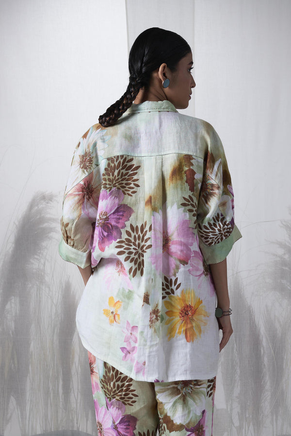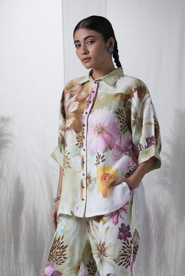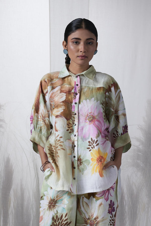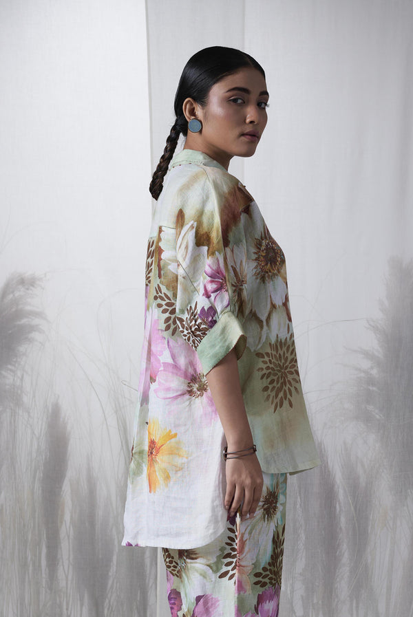 Snuff floral printed, Forest hand woven linen Ceiba kimono shirt.