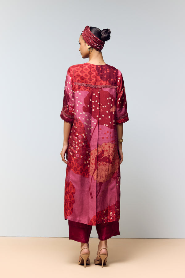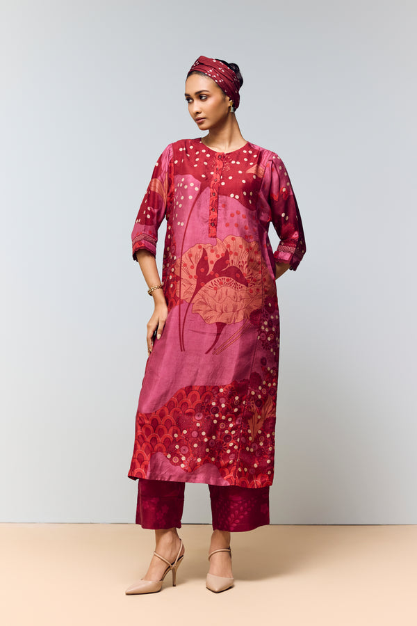 - The top is beautifully hand printed in deep tones of burgundy and red, exuding warmth and regality. It is paired with burgundy tone-on-tone printed mulberry silk pants, completing a harmonious silhouette that is both powerful and poised.