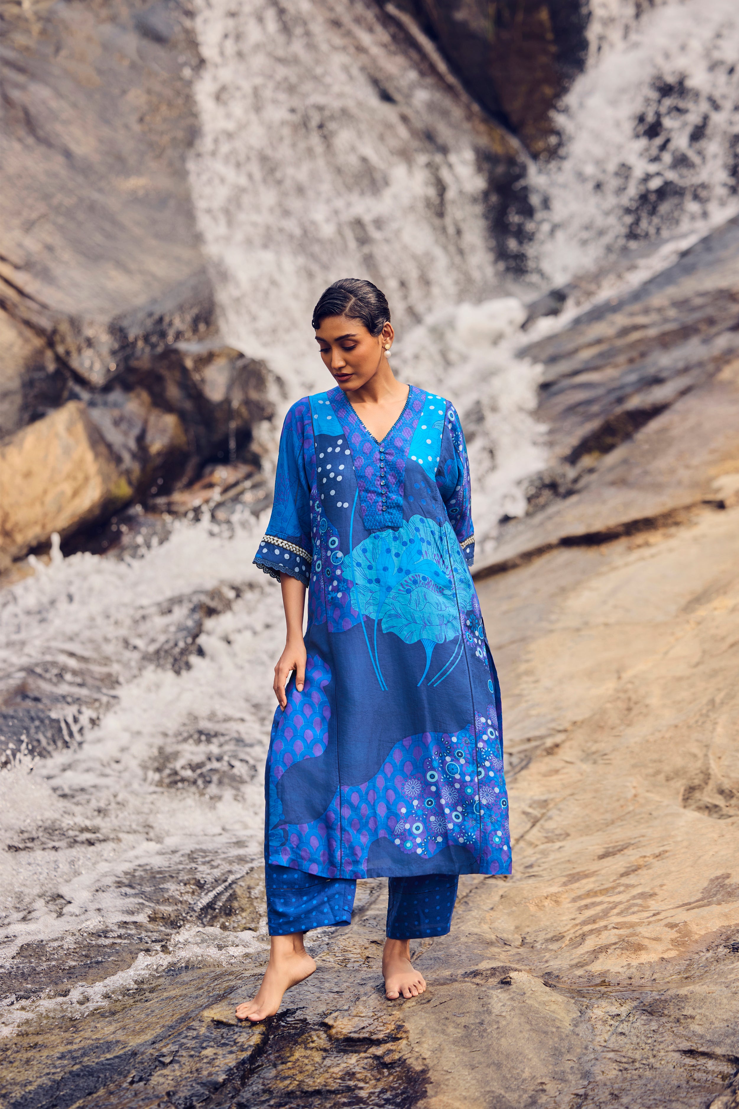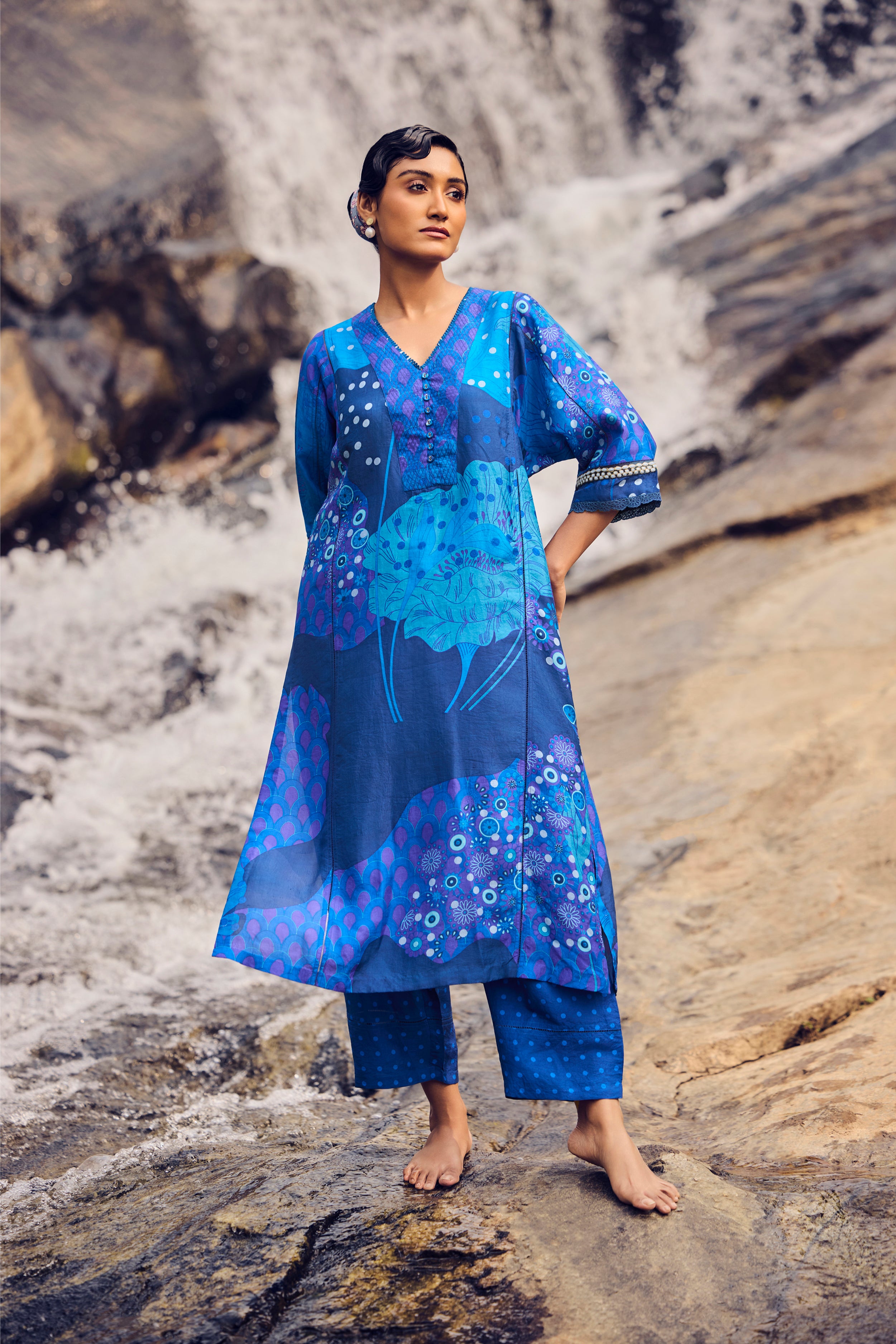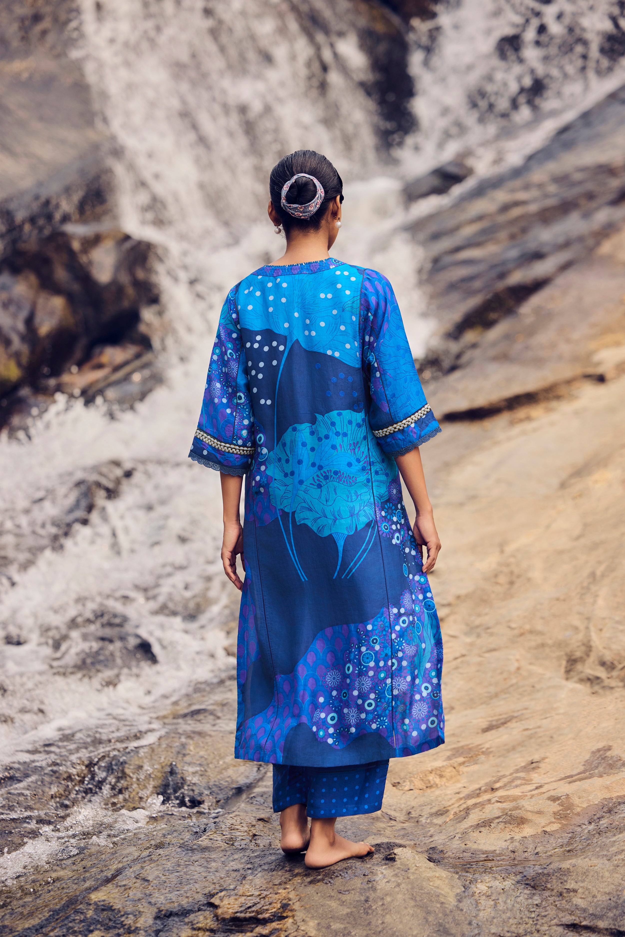 Vibrant and fluid, this electric blue handwoven and hand-printed A-line kurta moves with effortless grace. Designed with relaxed kaftan-cut sleeves and finished with intricate embroidery detailing on the sleeves and back, the silhouette balances comfort with statement artistry. Paired with coordinated pants, the ensemble reflects modern elegance rooted in handcrafted tradition.