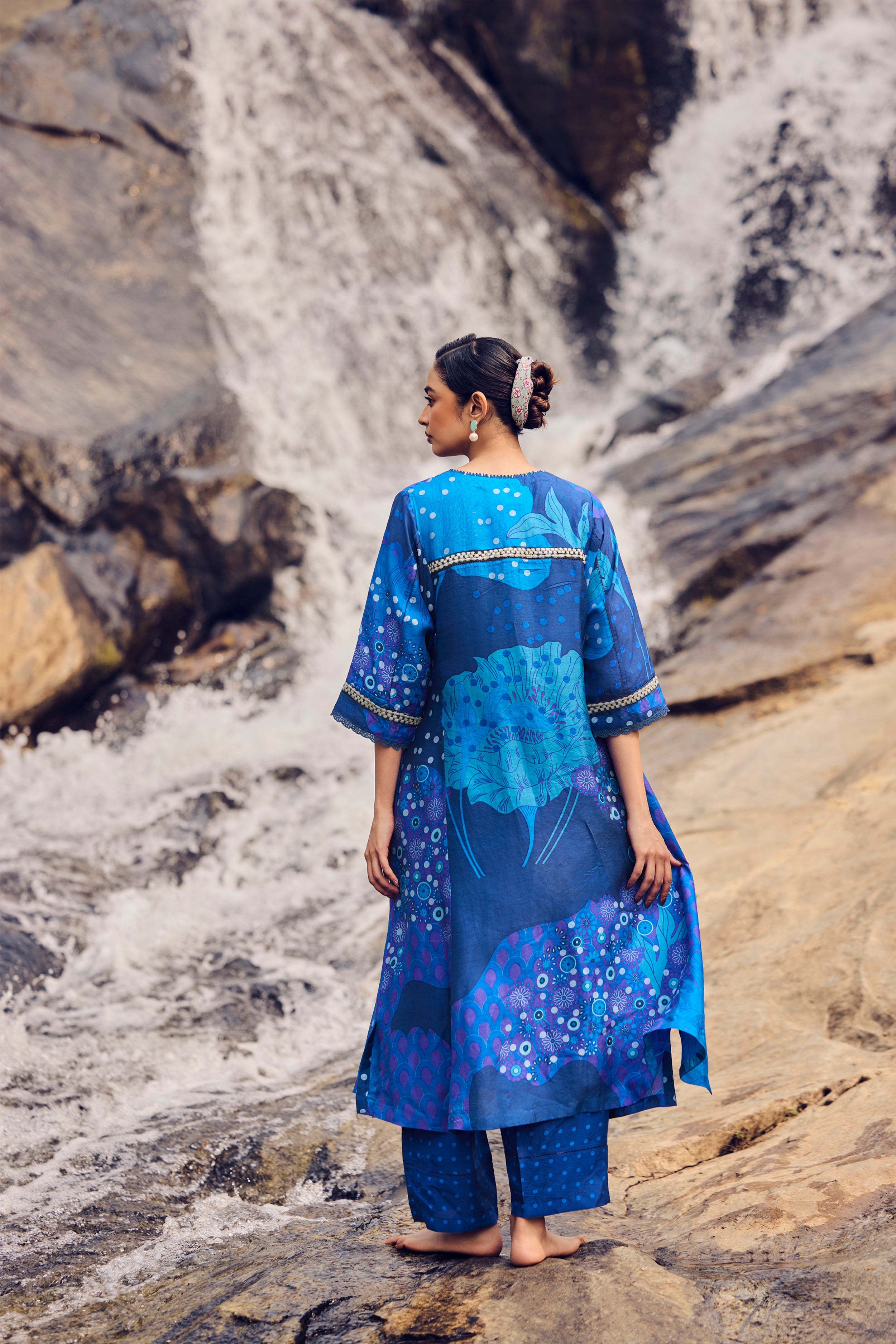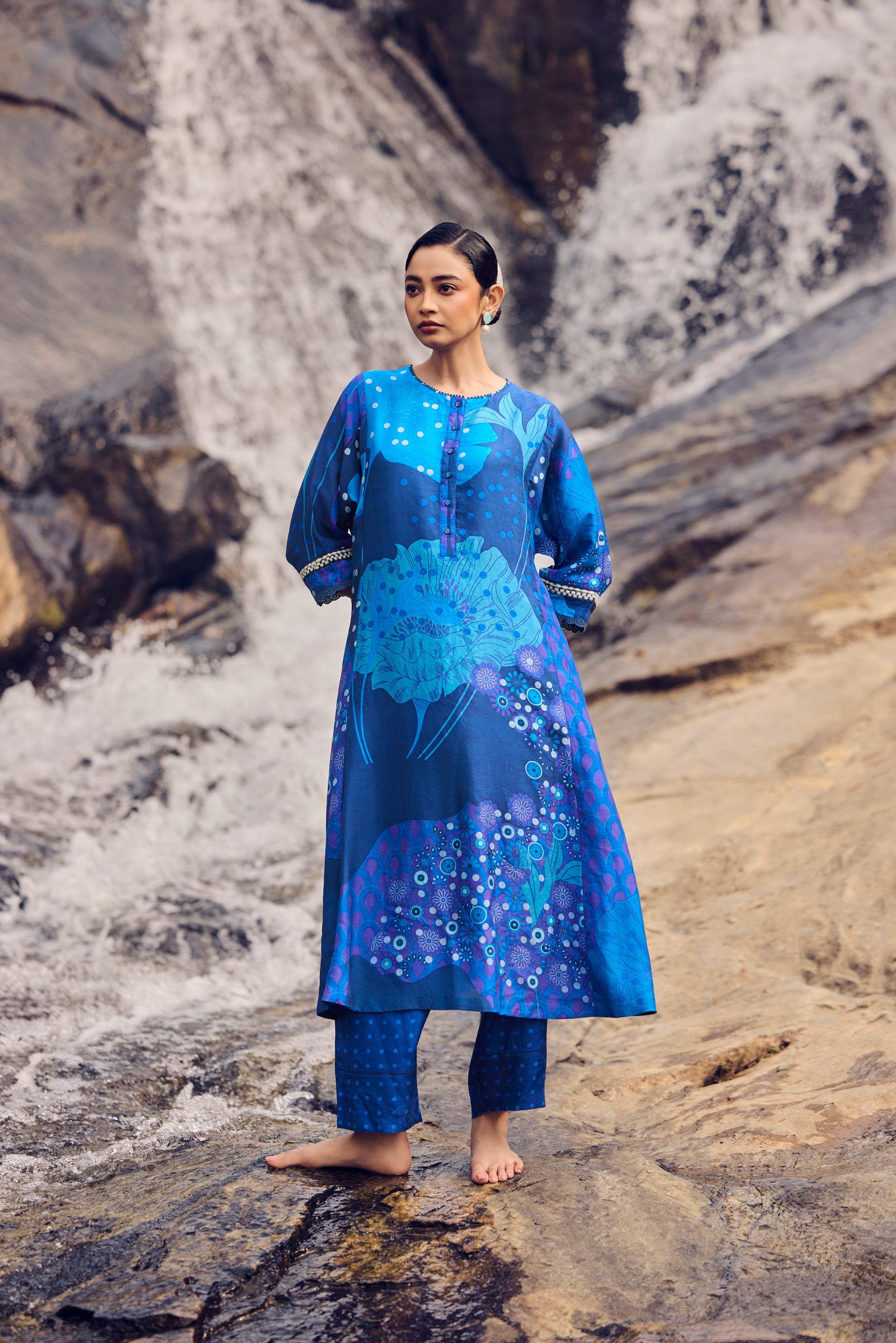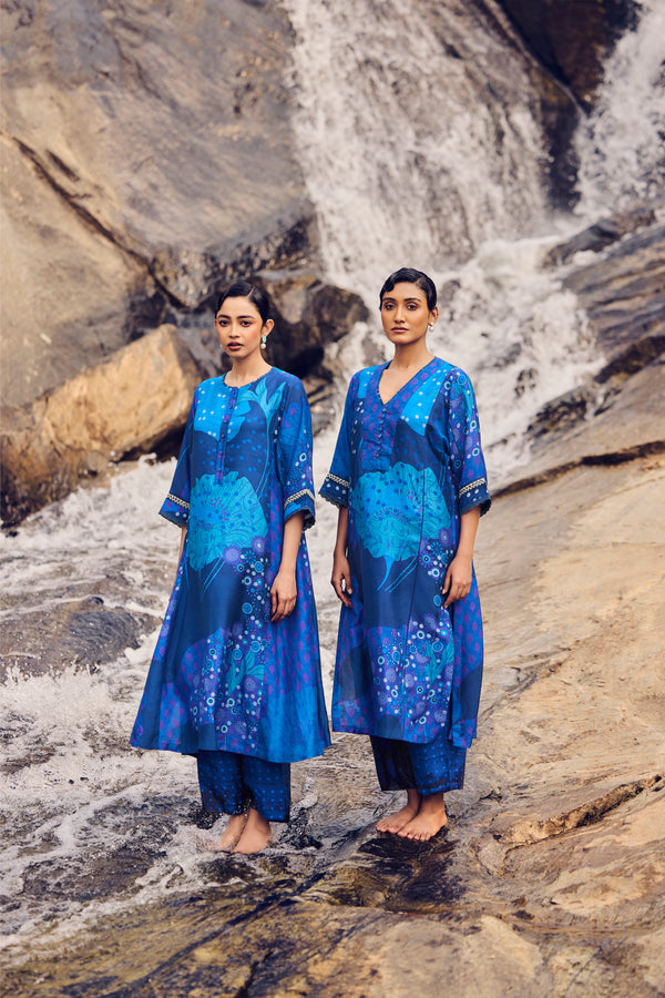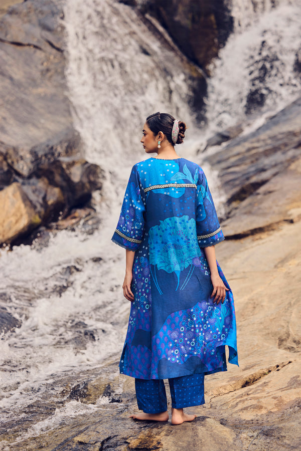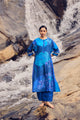 Alive with colour and craft, this electric blue handwoven and hand-printed A-line kurta flows in an effortless silhouette. Soft kaftan-cut sleeves create movement, while delicate embroidery detailing on the sleeves and back adds depth and artistry. Paired with coordinated pants, the ensemble blends comfort, elegance, and handcrafted charm.