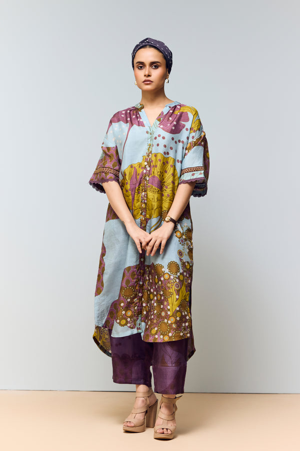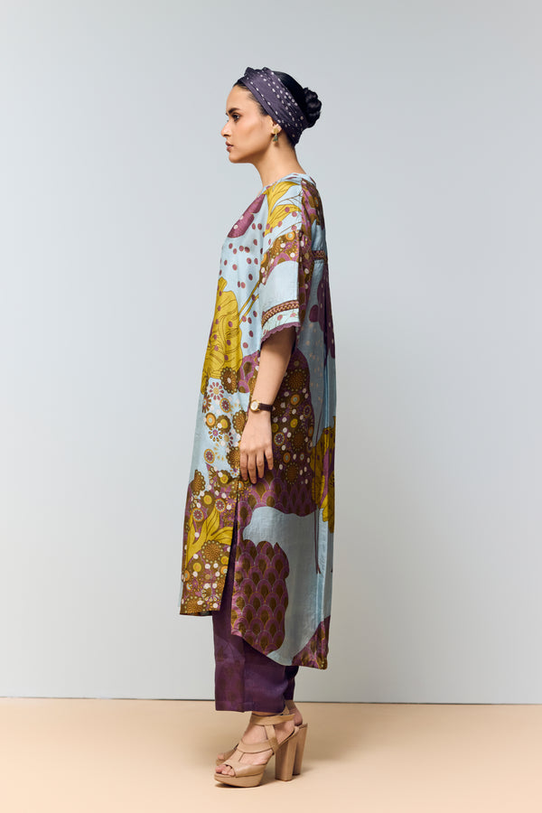Greyish Blue & Aubergine Hand Printed Cord Set – Handcrafted Mulberry Silk Co-ord Set