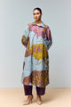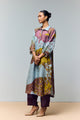 - The hand-printed top blends greyish blue and aubergine hues, bringing together cool sophistication with rich depth. It is paired with aubergine tone-on-tone printed mulberry silk pants, designed to create a seamless, elevated silhouette.