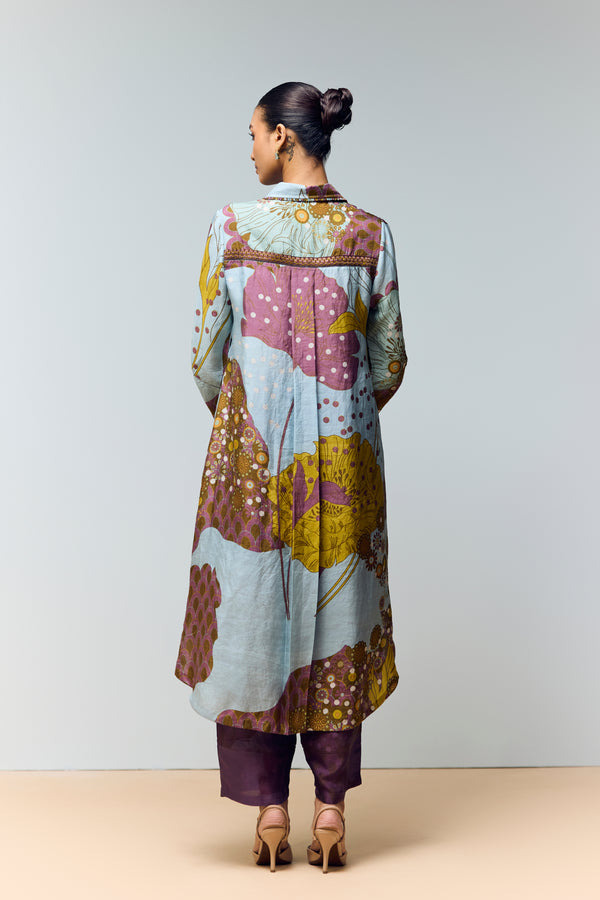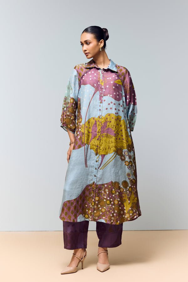 - Turn heads in this timeless Greyish Blue and Aubergine Hand Printed Cord Set, beautifully handcrafted in premium hand-woven mulberry silk. Designed for modern elegance, this luxury co-ord features a crisp shirt collar and a front button placket, offering a clean, tailored look while maintaining the fluid grace of silk.
