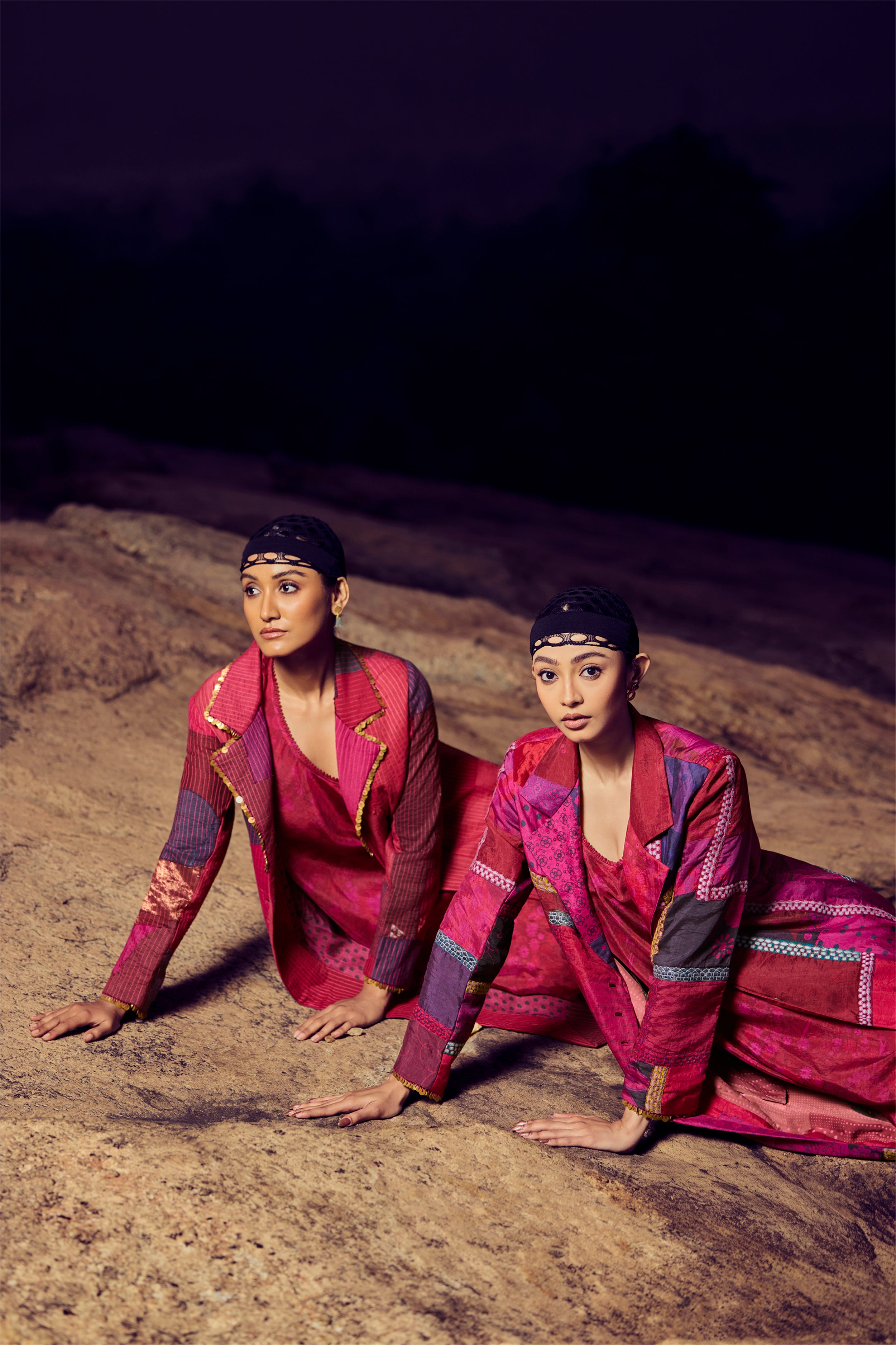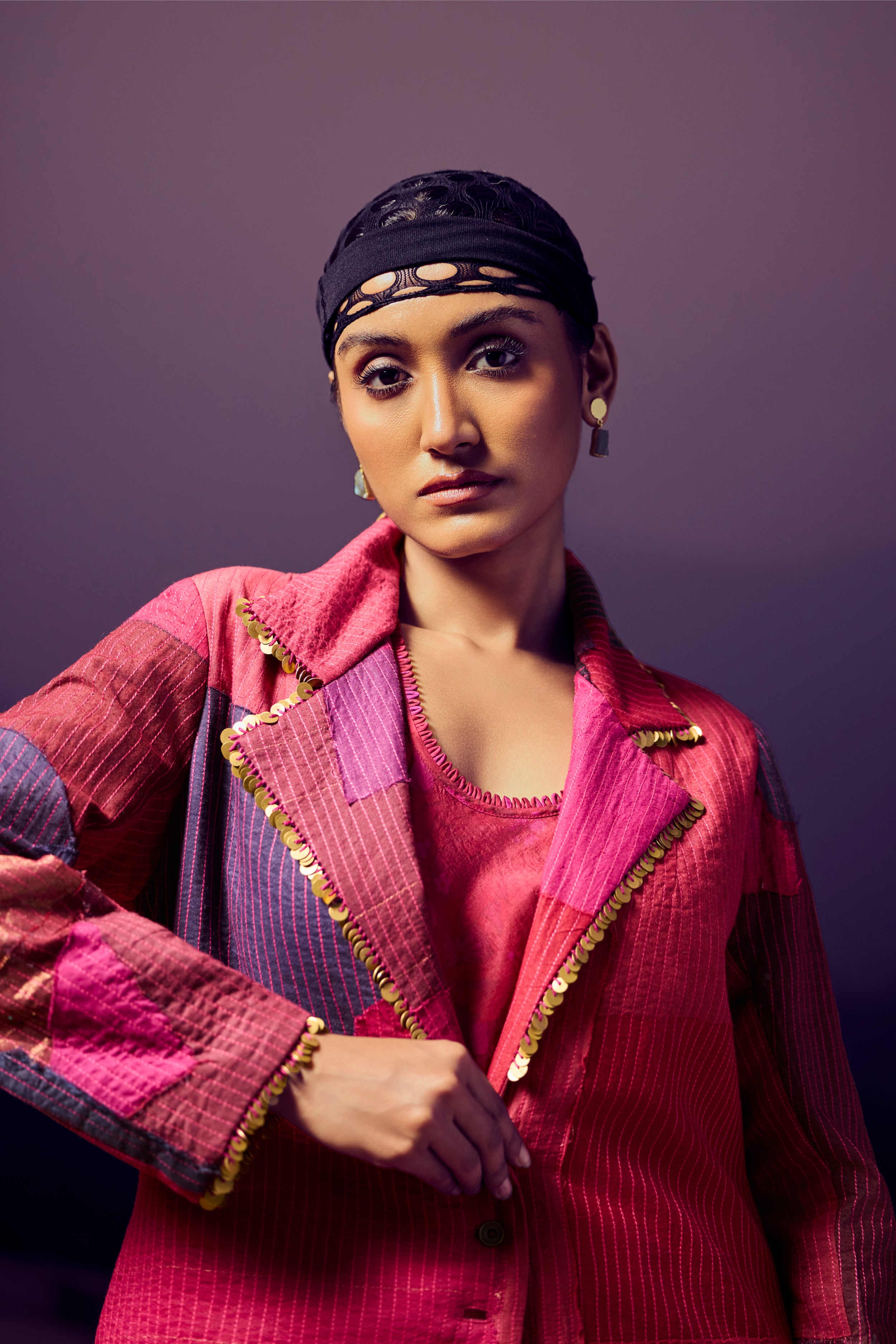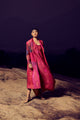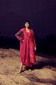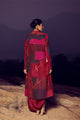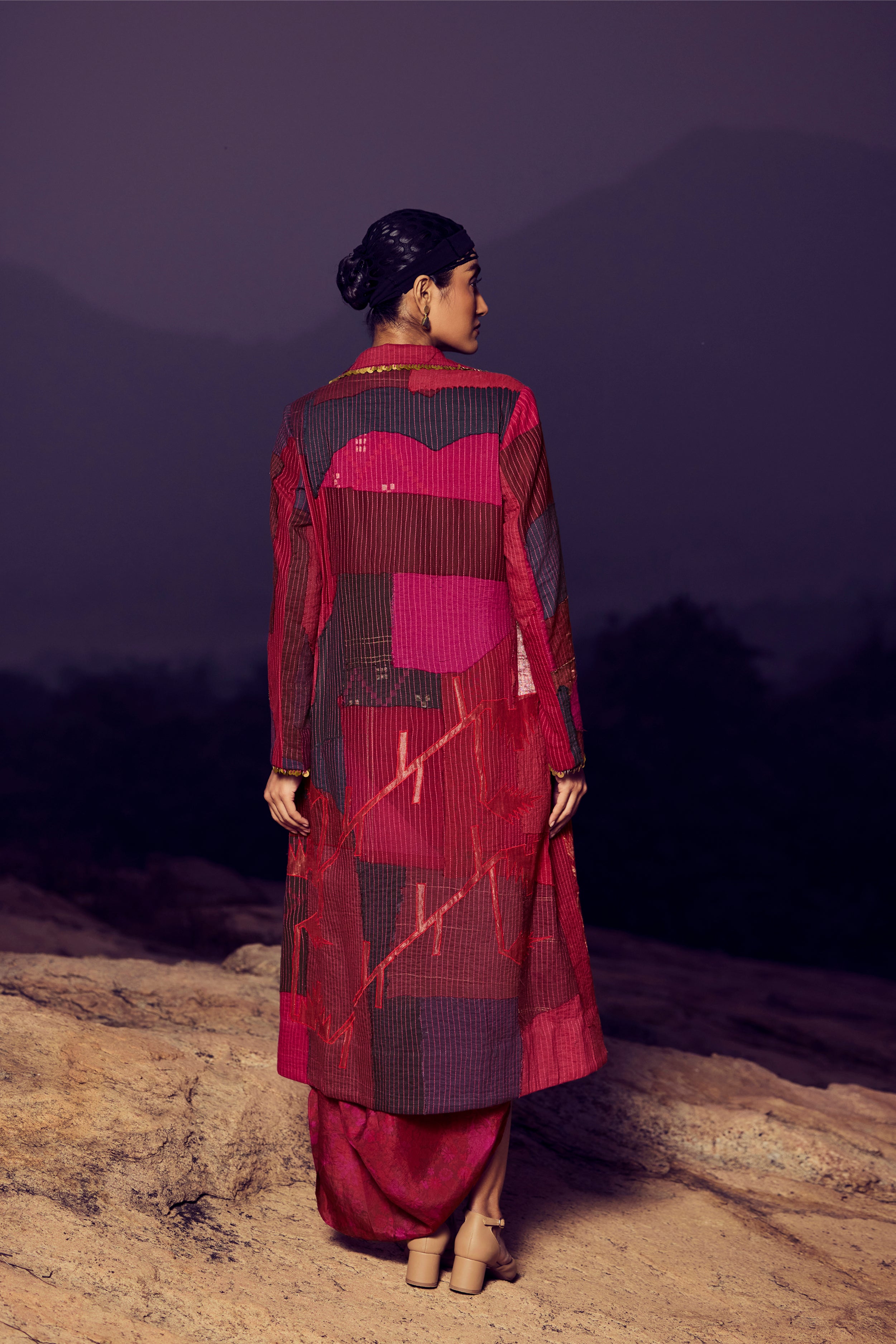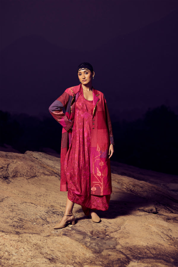 A refined union of texture and tradition. This handwoven silk khadi patchwork jacket features a quilted surface in deep maroon and burgundy tones, accented with intricate zari appliqué on the front and back. Paired with a handwoven, hand-printed mulberry silk draped dress, the ensemble embodies artisanal craftsmanship, sustainable luxury, and timeless elegance.