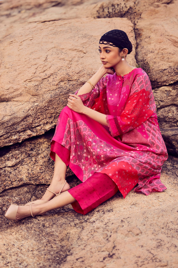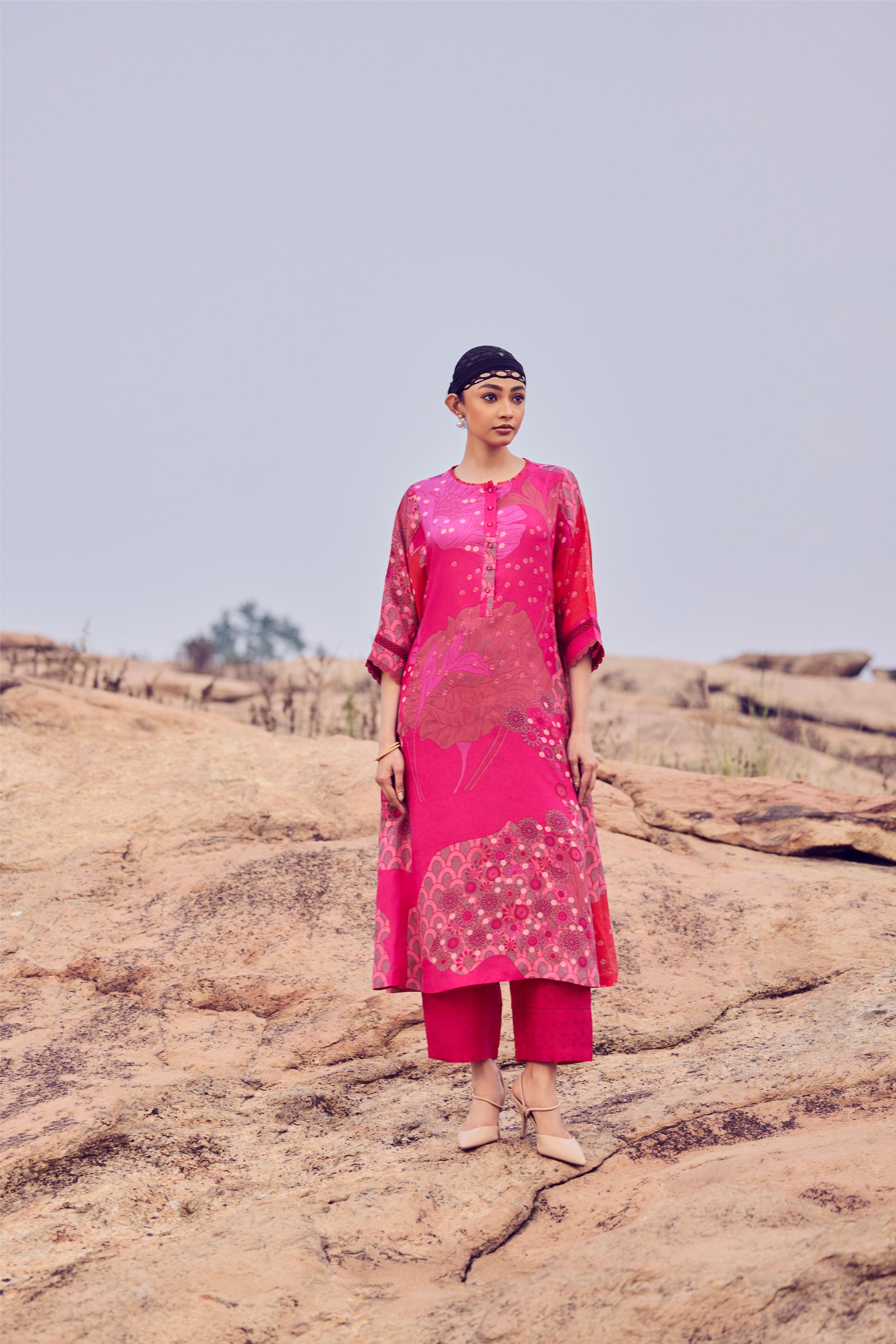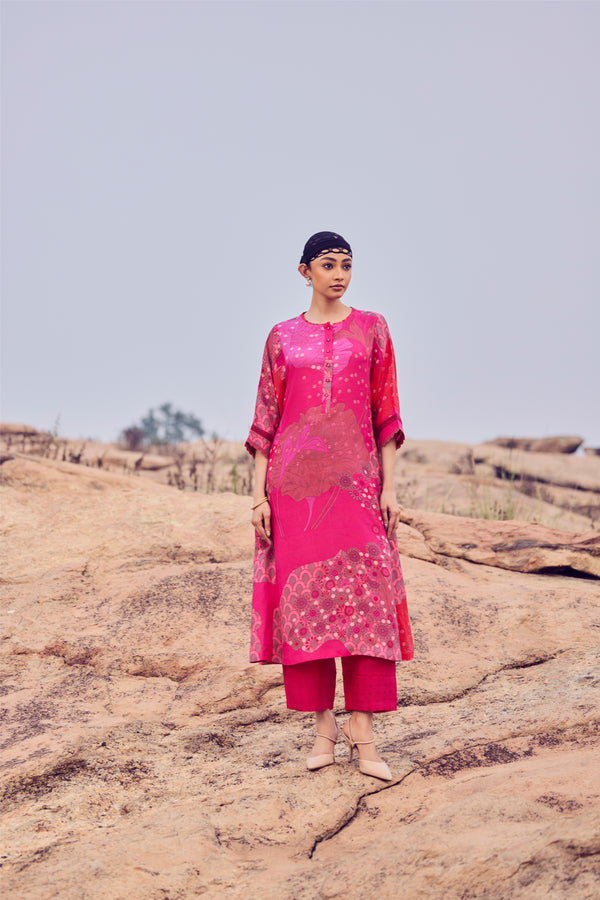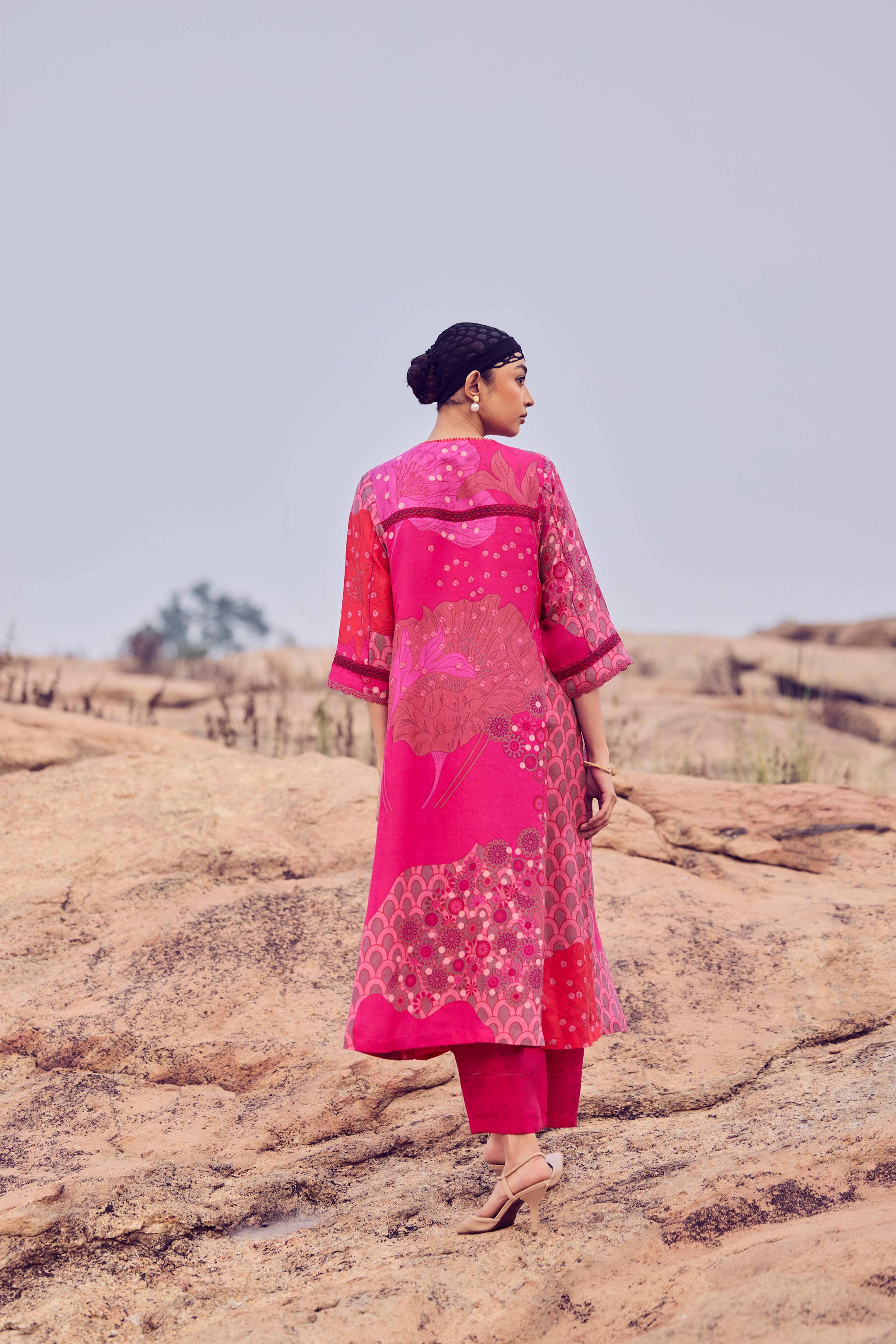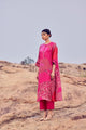 Radiant in hot pink, this handwoven and hand-printed A-line kurta flows with effortless elegance. Designed with fluid kaftan-cut sleeves and finished with delicate embroidery detailing on the sleeves and back, the silhouette blends comfort with statement artistry. Paired with coordinated pants, the ensemble celebrates handcrafted beauty in a modern form.