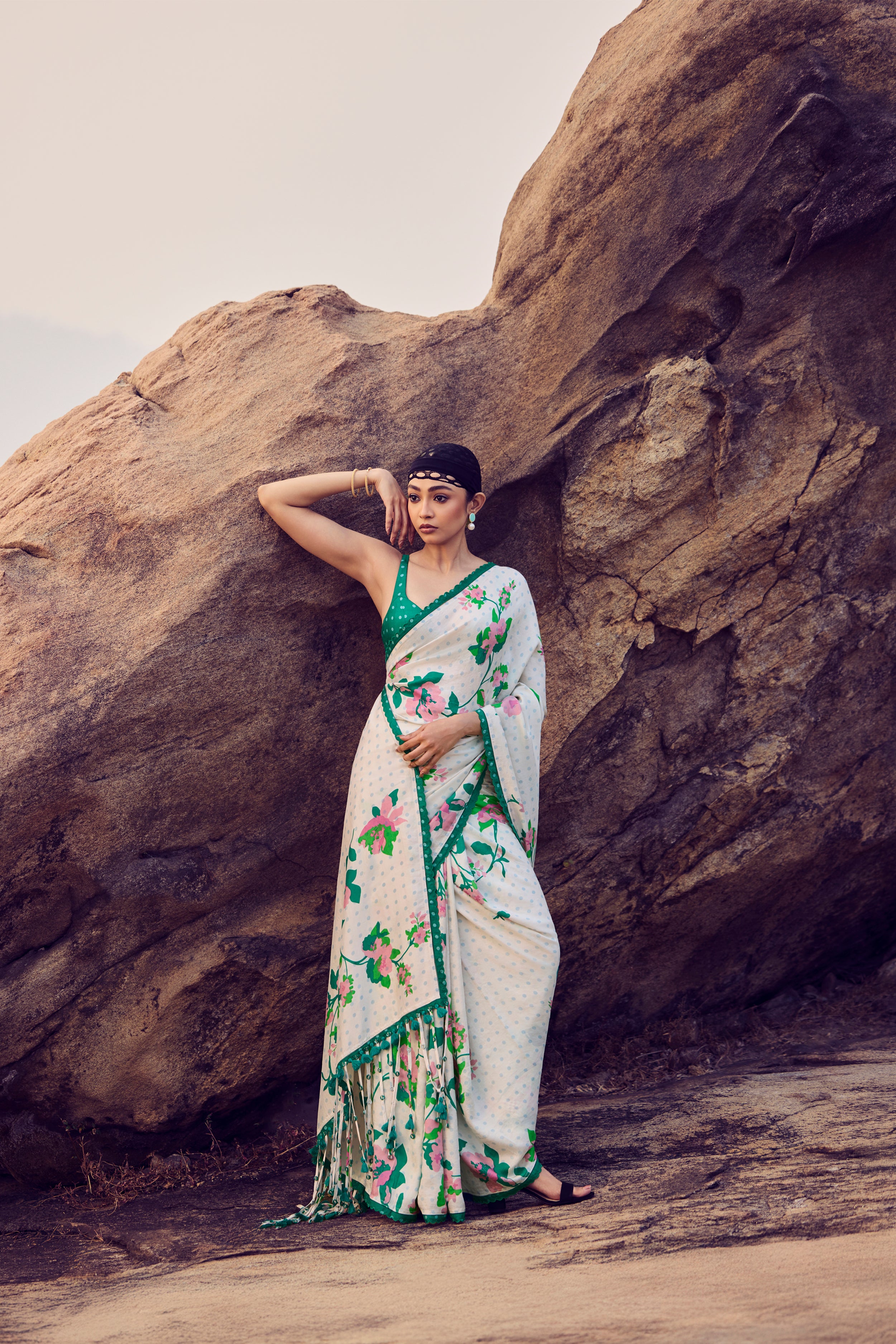 Ivory & Green Handwoven Hand-Printed Mulberry Silk Saree with Fringe Detail & Embroidered Blouse