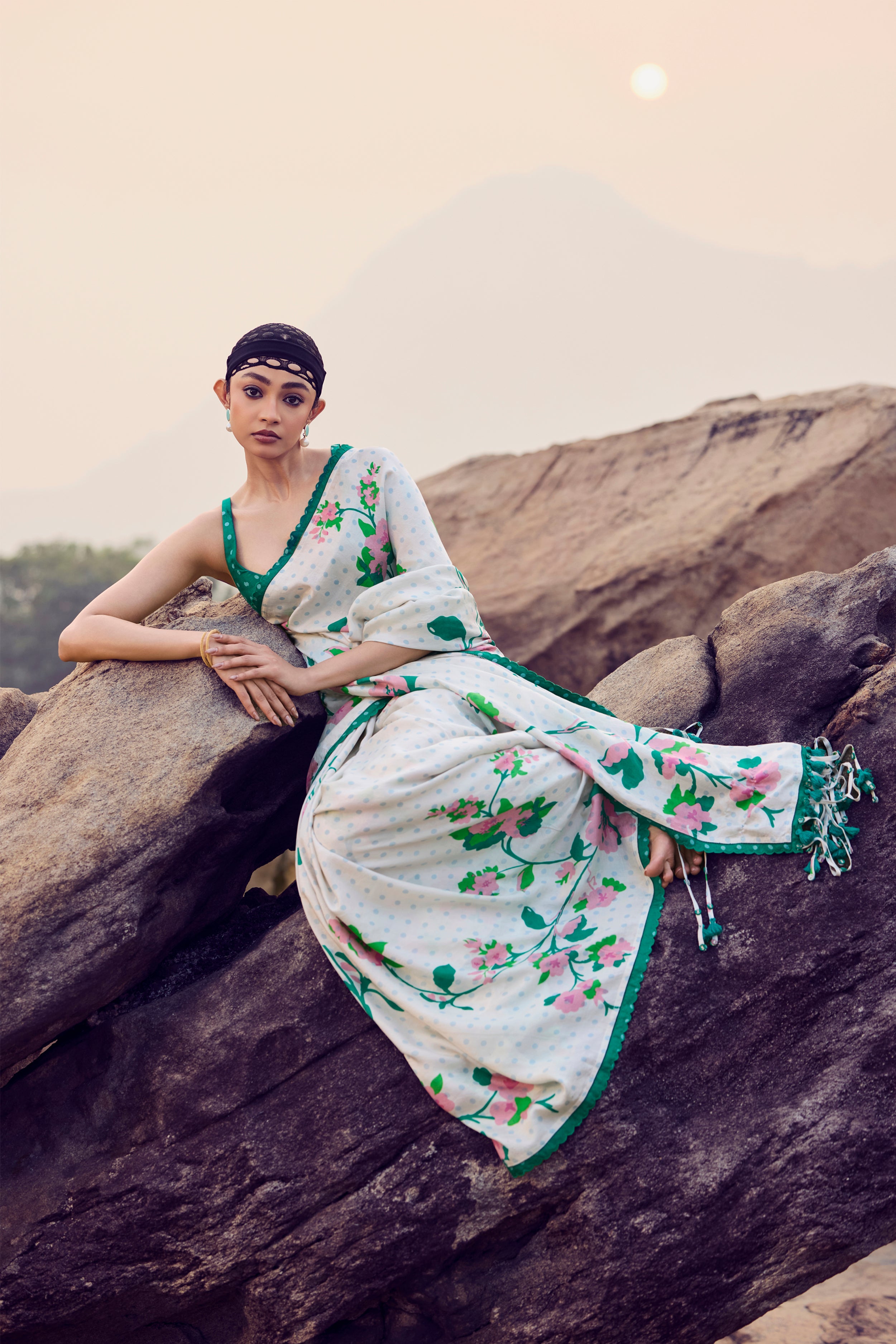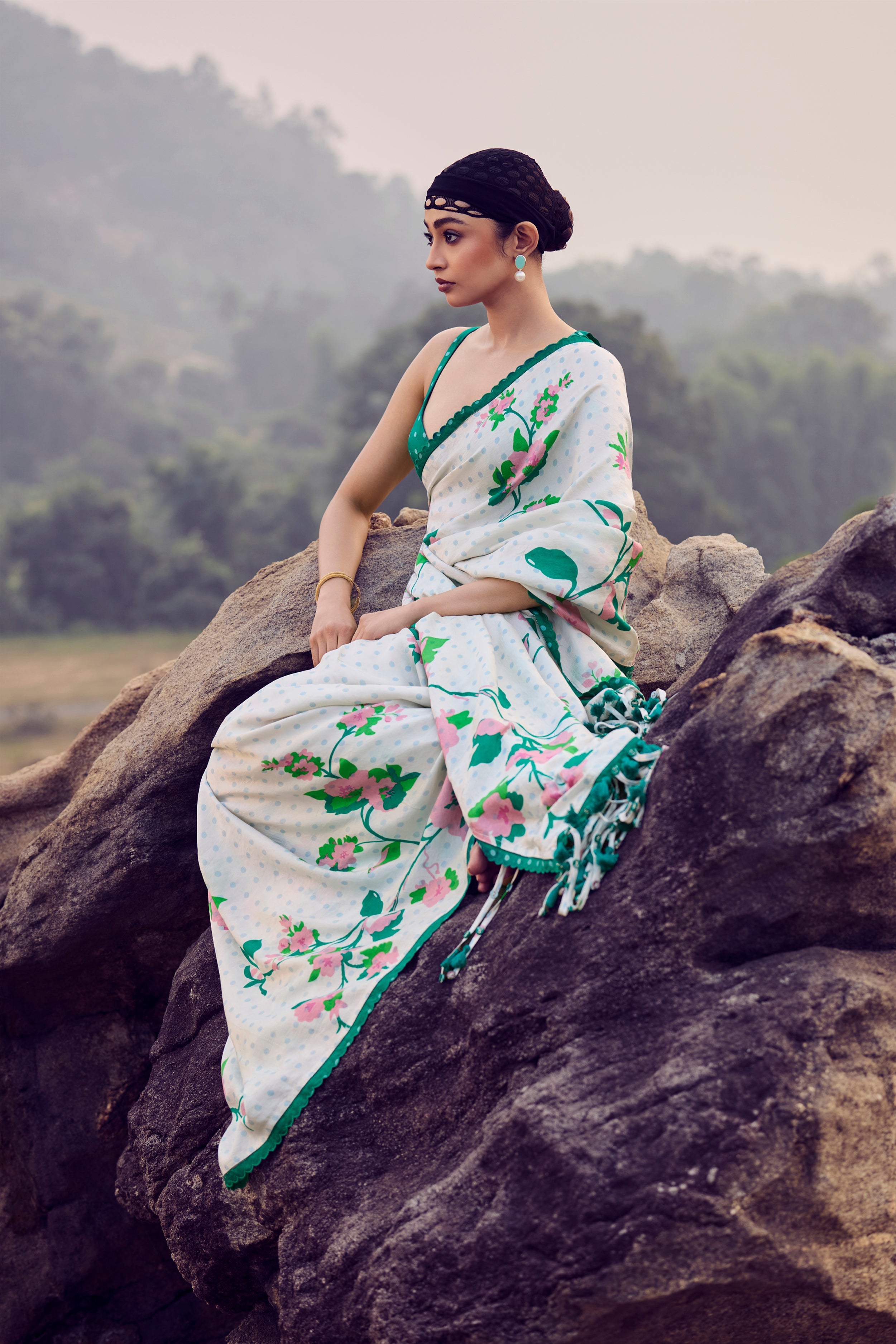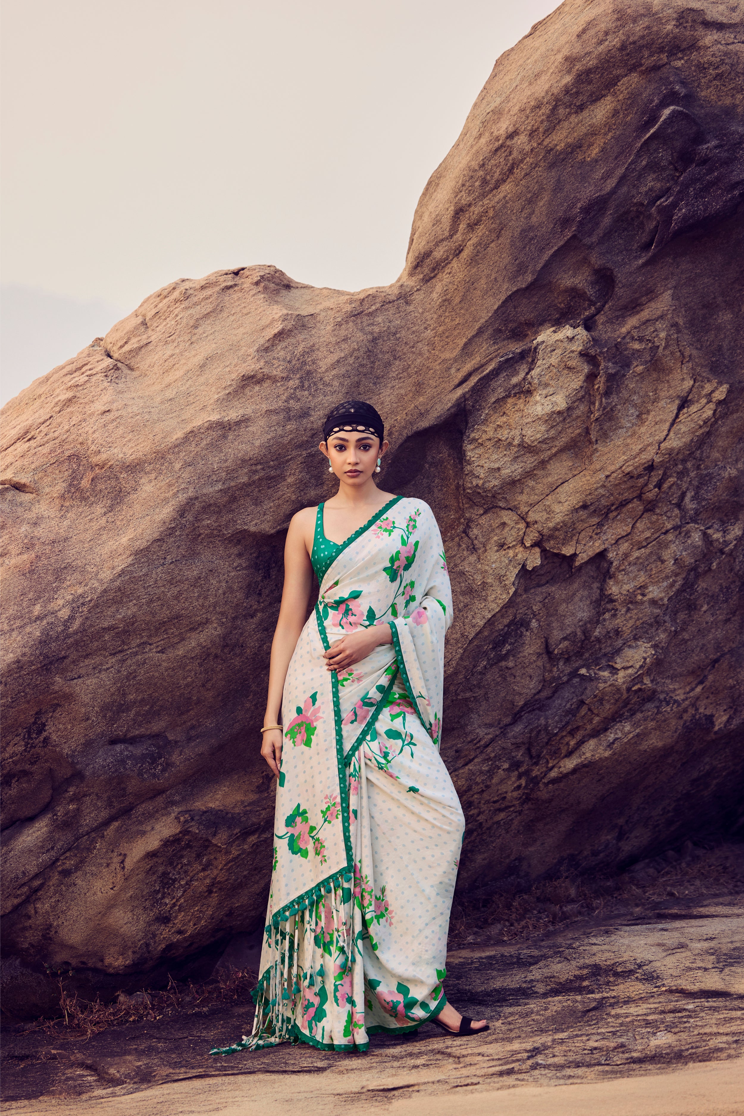 Fresh and timeless in its elegance, this ivory and green handwoven mulberry silk saree is adorned with intricate hand printing and finished with soft fringe detailing along the pallu. Paired with a delicately embroidered blouse, the drape reflects harmony between tradition and contemporary grace.