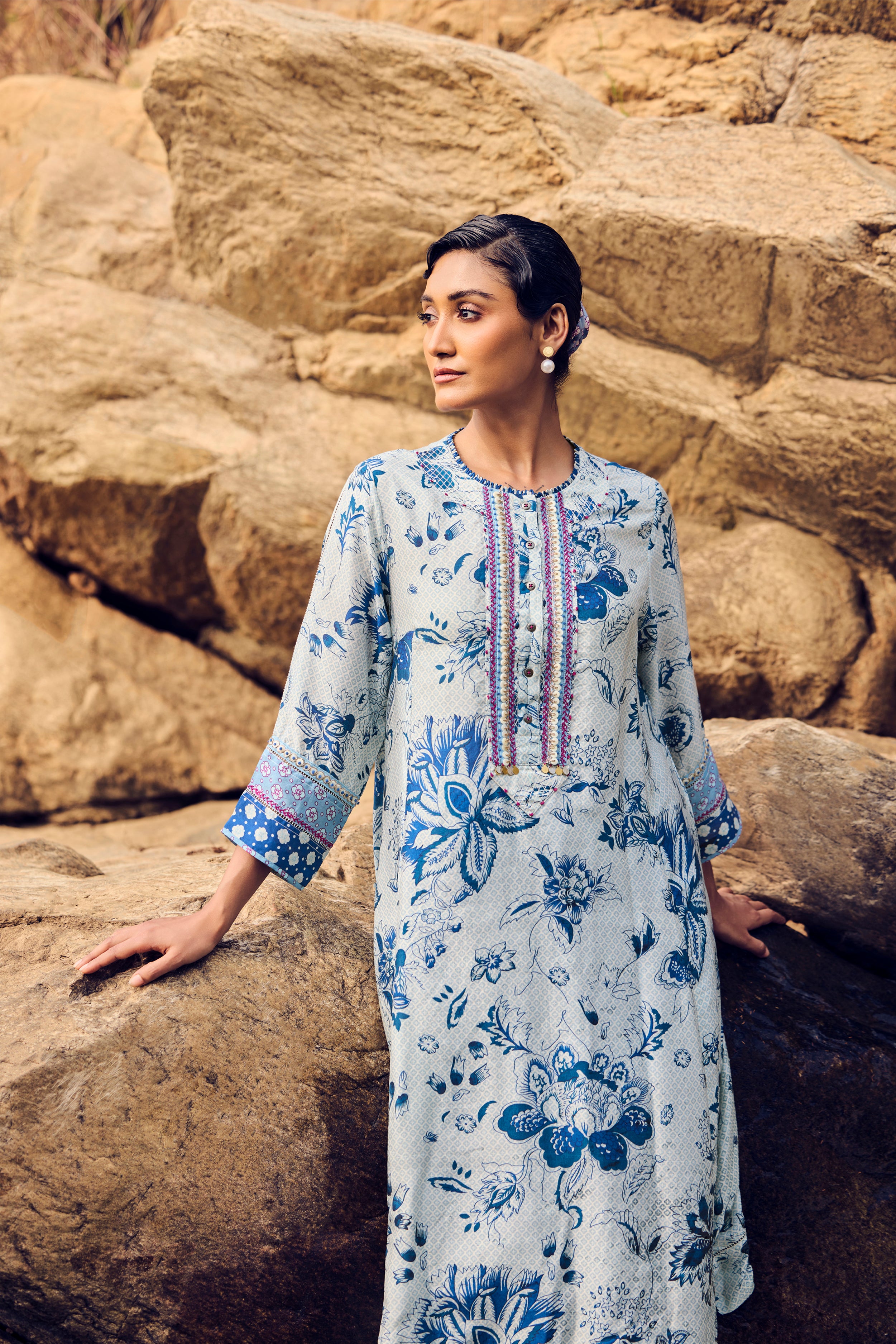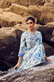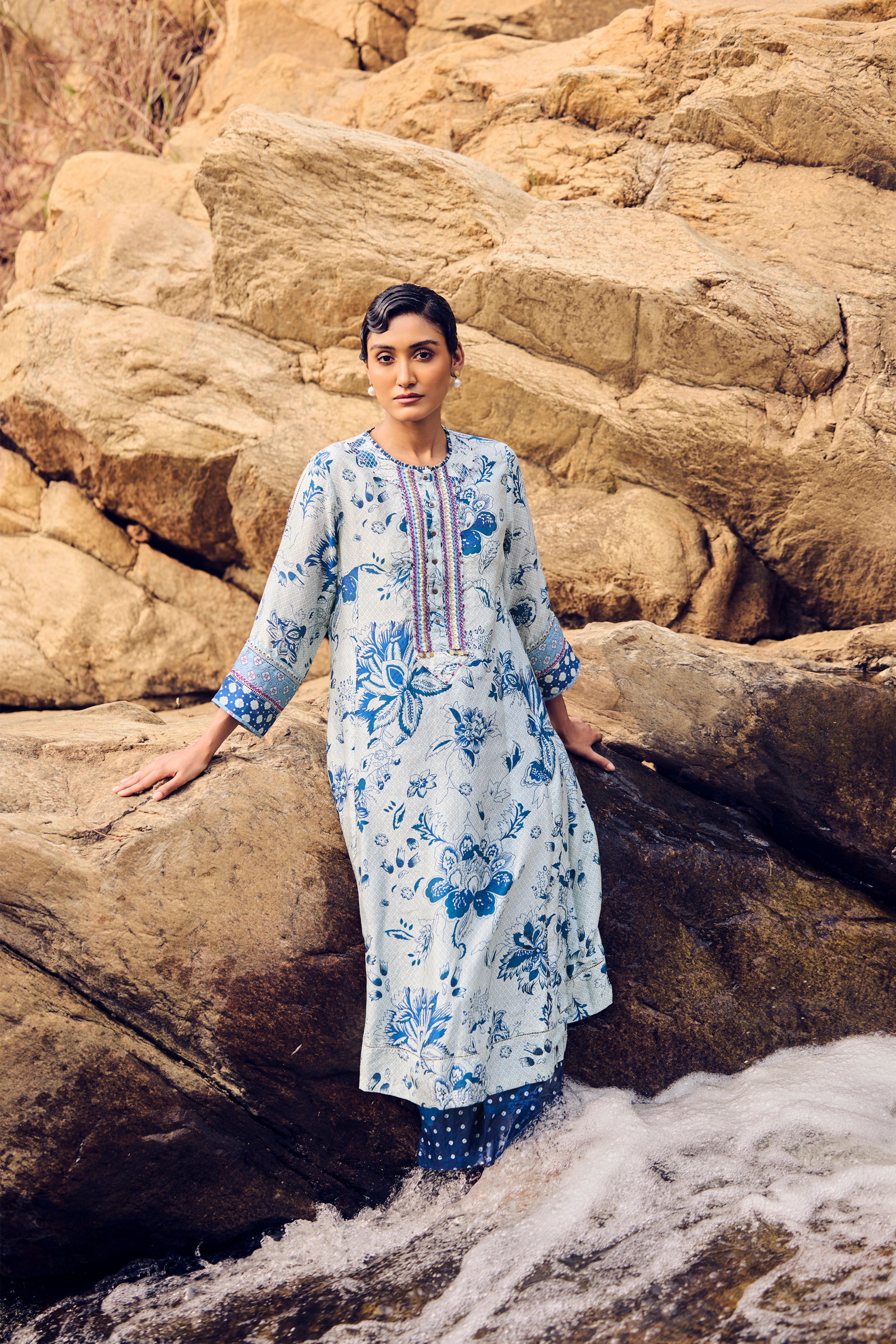Rooted in timeless elegance, this ivory and indigo handwoven mulberry silk A-line kurta is brought to life with traditional hand printing and intricate embroidery detailing across the front, back, and sleeves. The fluid silhouette drapes softly, while the coordinated pants complete a look of effortless sophistication.