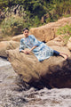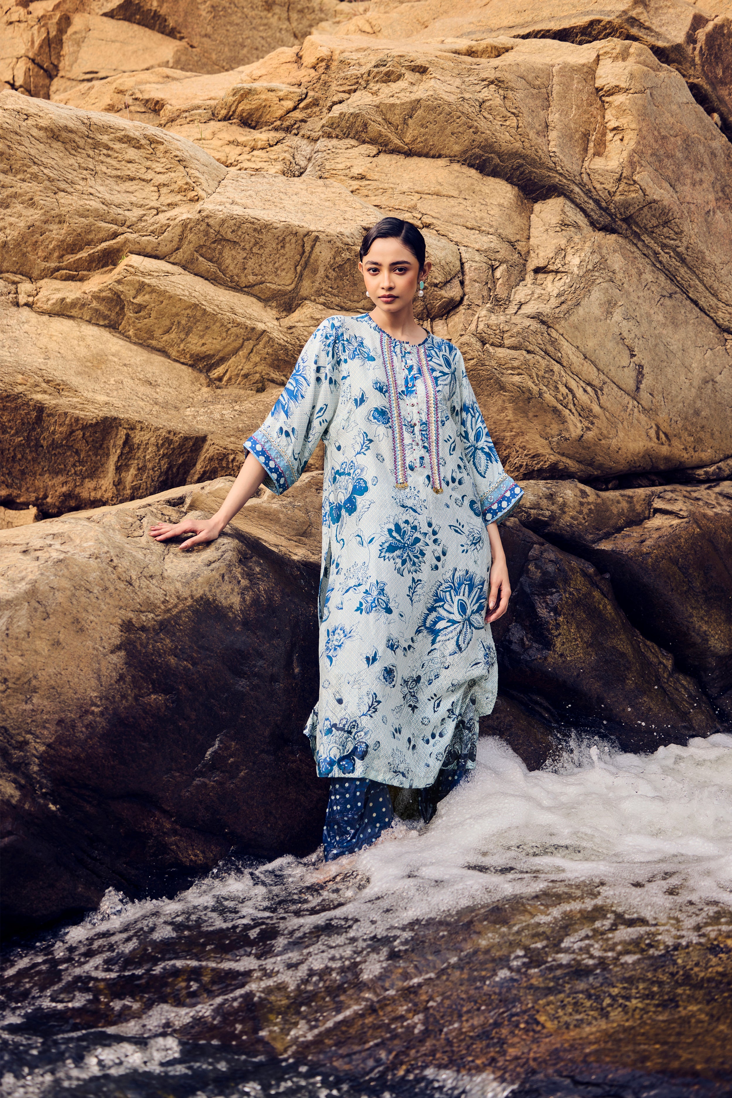 Timeless ivory meets deep indigo in this handwoven mulberry silk kurta, brought alive through traditional hand printing and intricate embroidery detailing across the front, back, and sleeves. The natural sheen of pure silk lends fluidity and grace, while the coordinated pants complete a look of effortless sophistication.