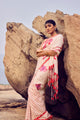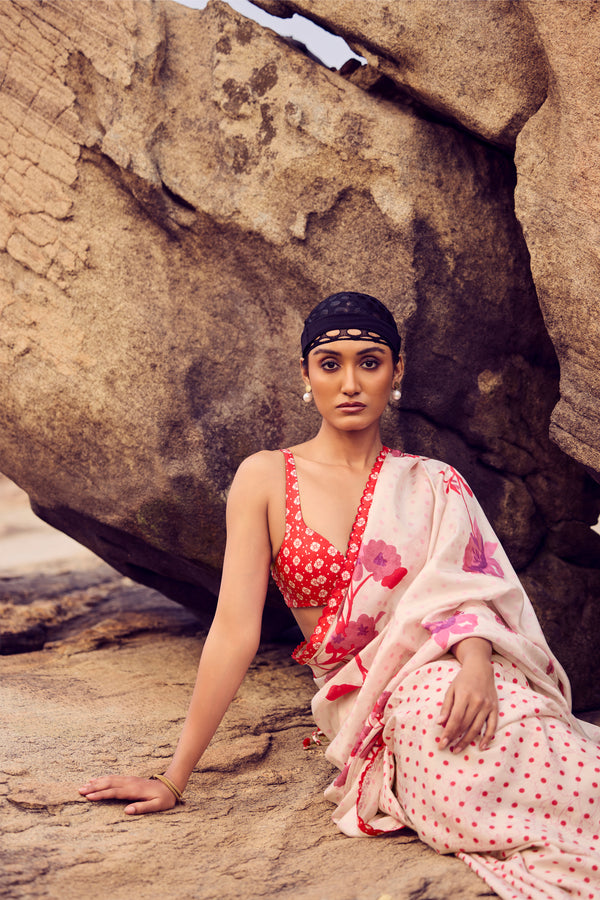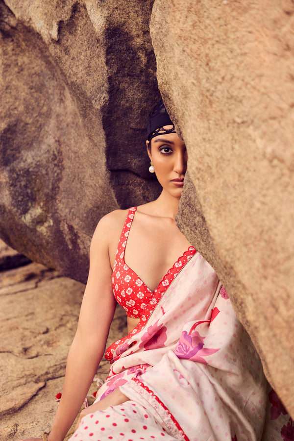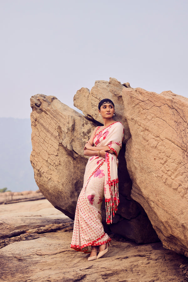 Ivory & Red Handwoven Hand-Printed Mulberry Silk Saree with Fringe Detail & Embroidered Blouse