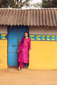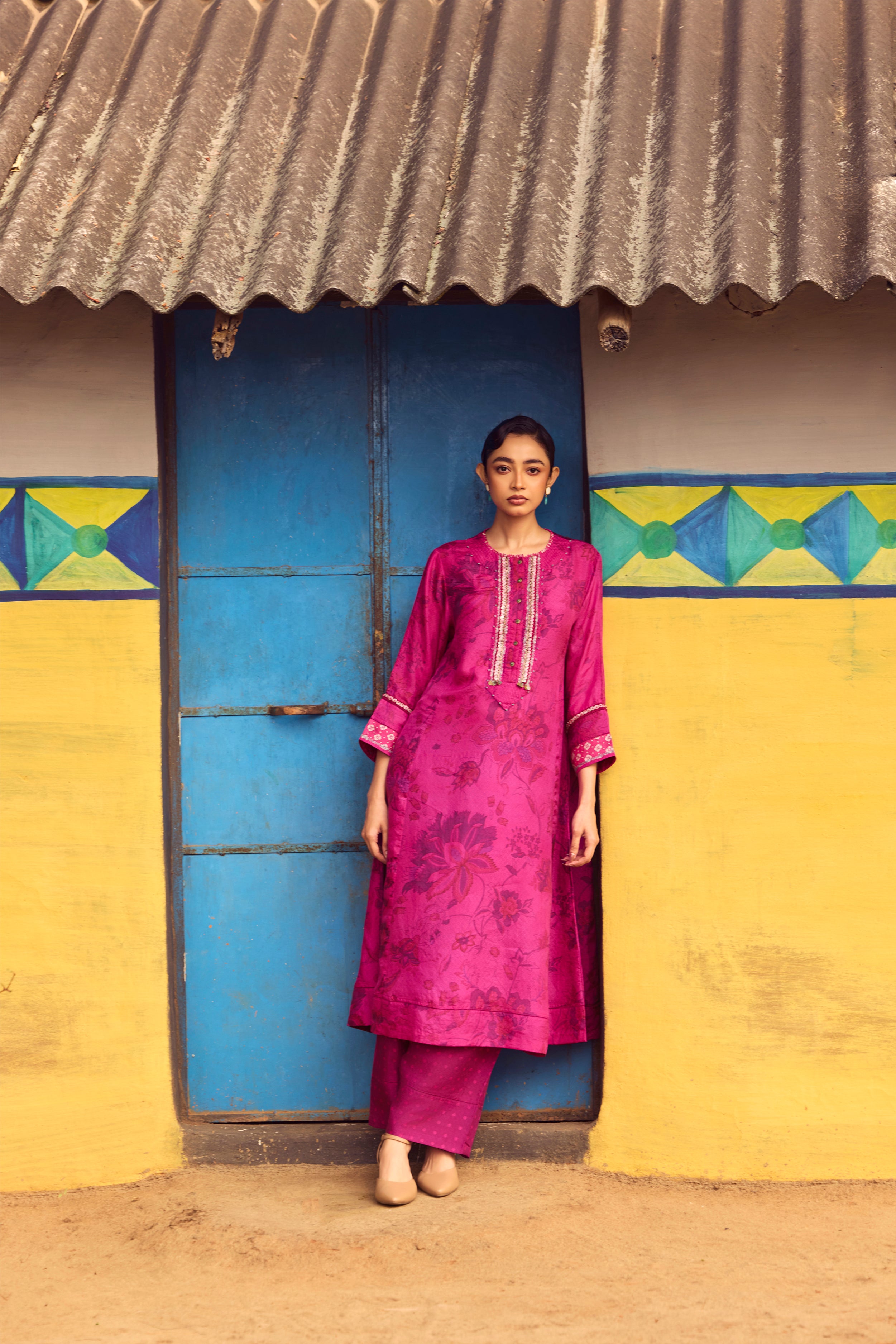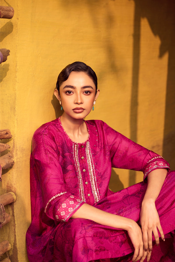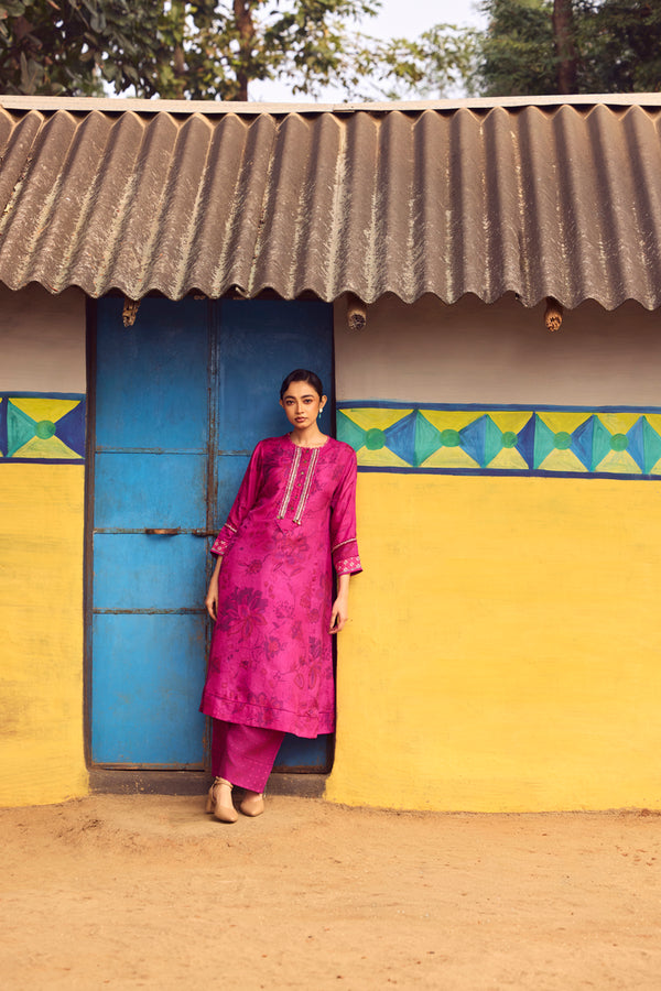 Bold and luminous, this magenta handwoven mulberry silk A-line kurta is brought to life with traditional hand printing and intricate embroidery detailing across the front, back, and sleeves. The gently flared silhouette flows with natural elegance, while the coordinated pants complete a look of effortless sophistication.