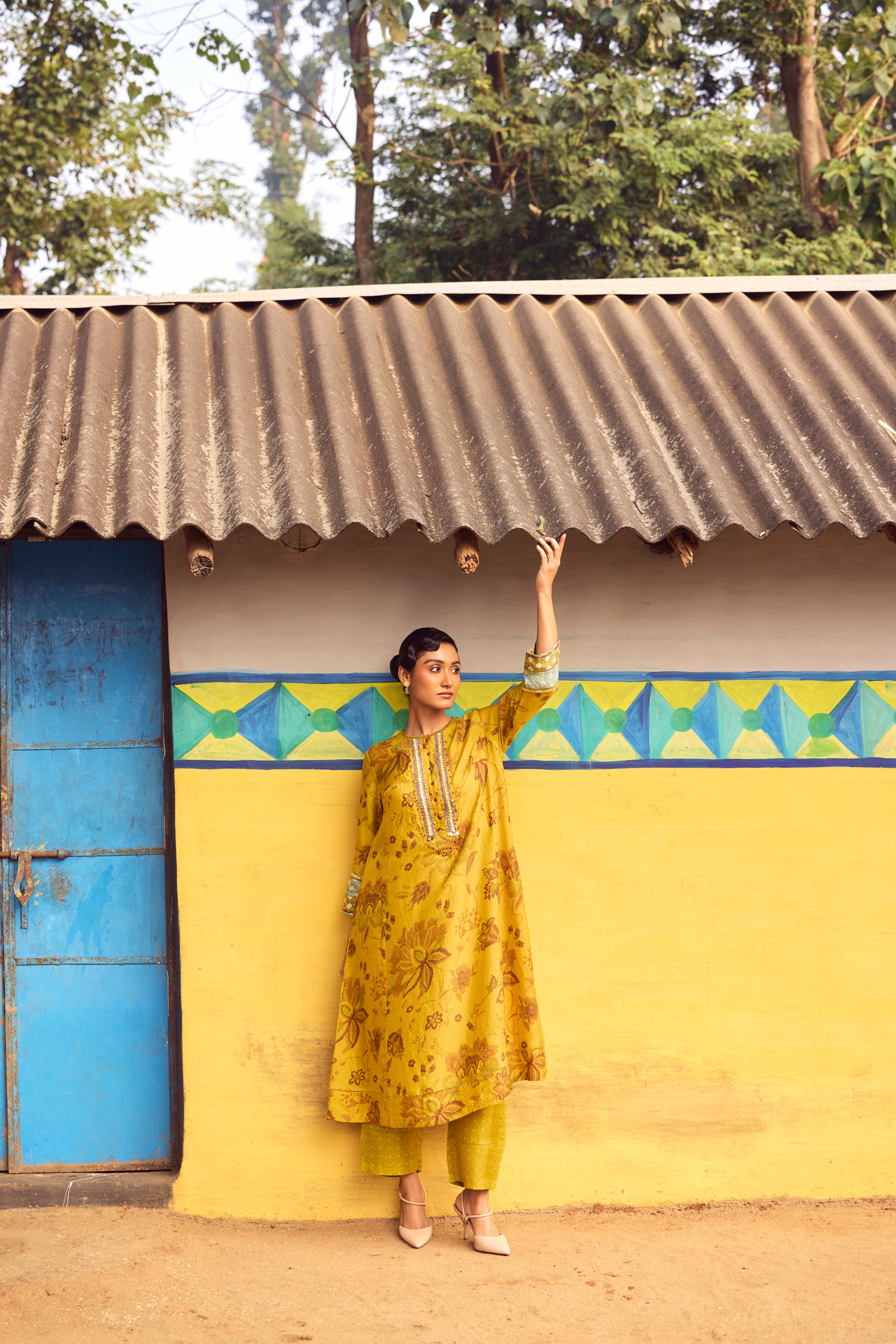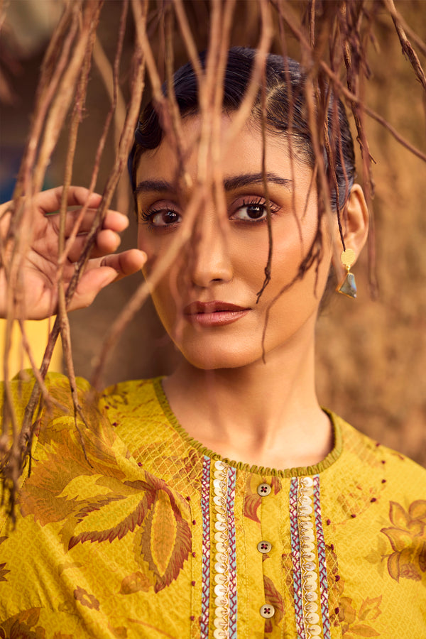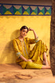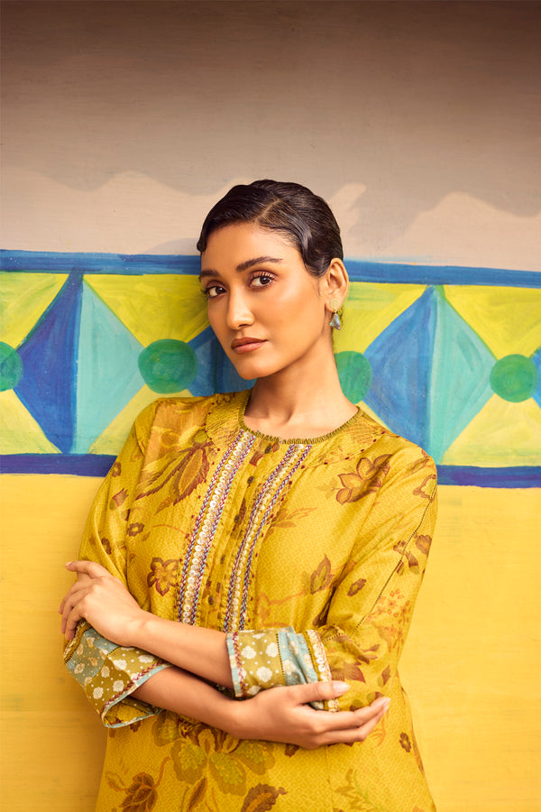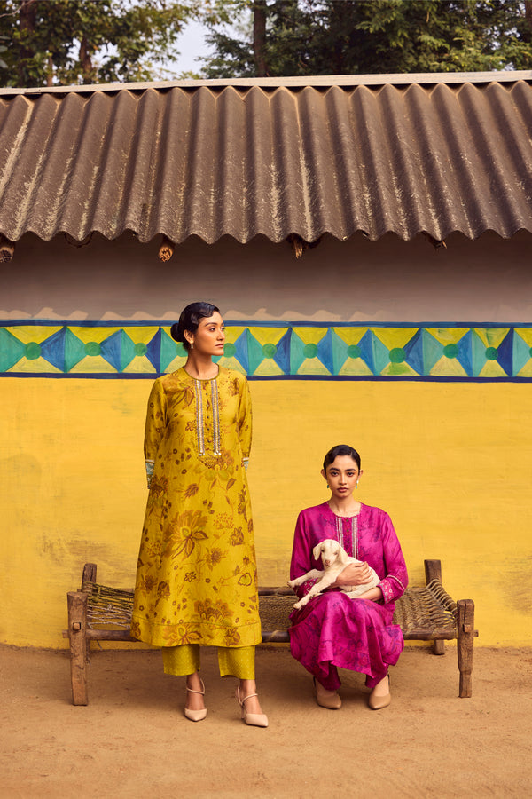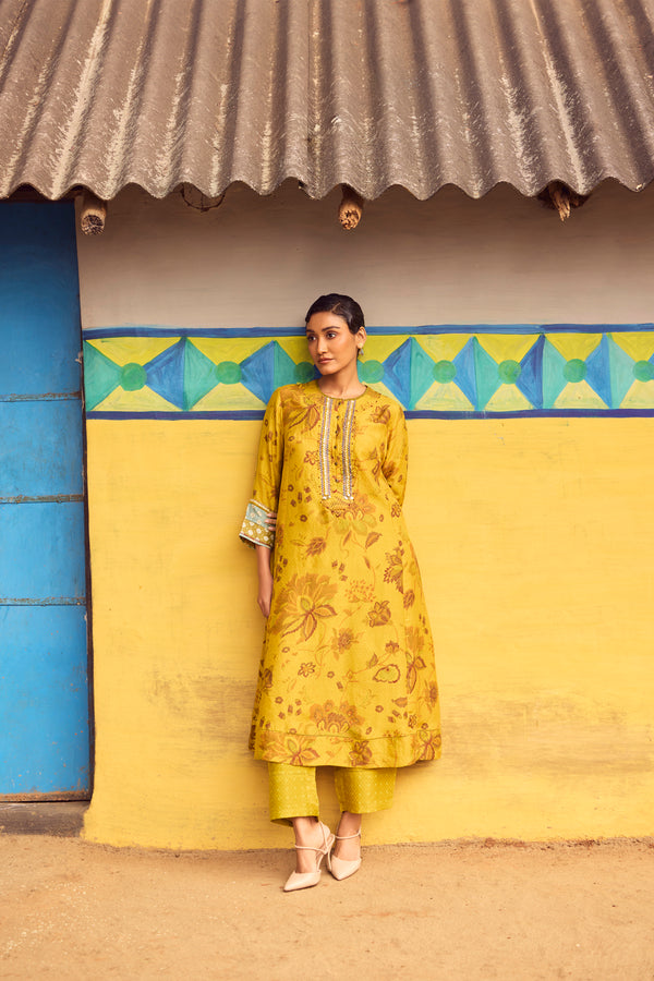 Bathed in warm mustard tones, this handwoven mulberry silk A-line kurta is elevated with traditional hand printing and intricate embroidery detailing across the front, back, and sleeves. The fluid flare of the silhouette allows the silk to move with effortless grace, while the coordinated pants complete a look of refined elegance.
