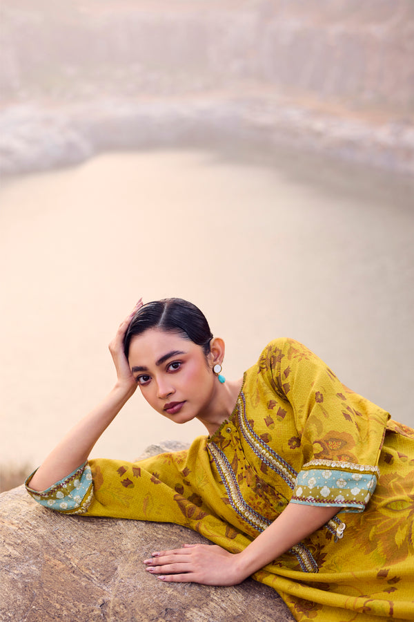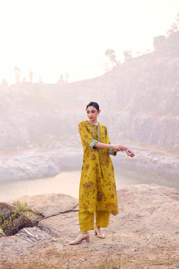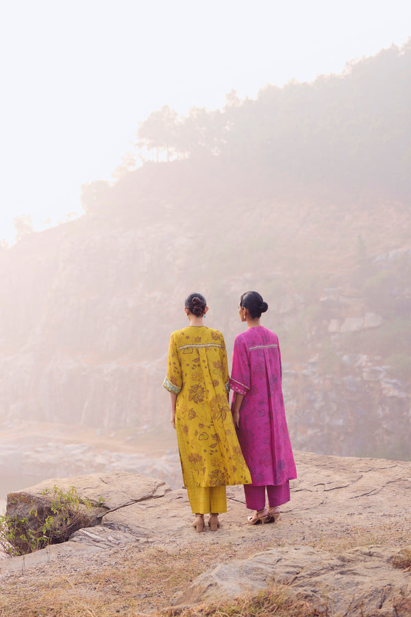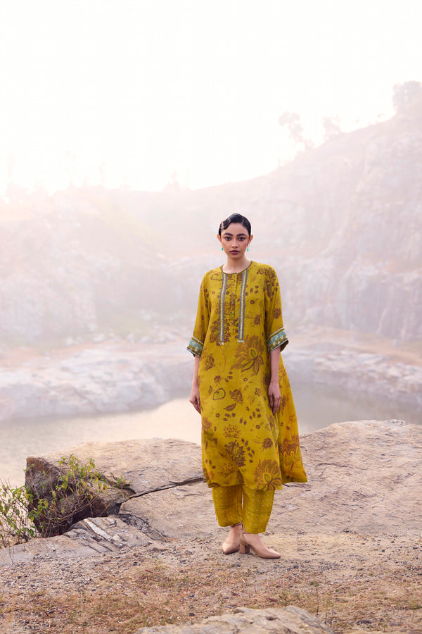 Warm and radiant, this mustard handwoven mulberry silk kurta is enriched with traditional hand printing and delicate embroidery detailing across the front, back, and sleeves. The natural sheen of pure silk lends graceful movement, while the coordinated pants complete a silhouette of effortless elegance.
