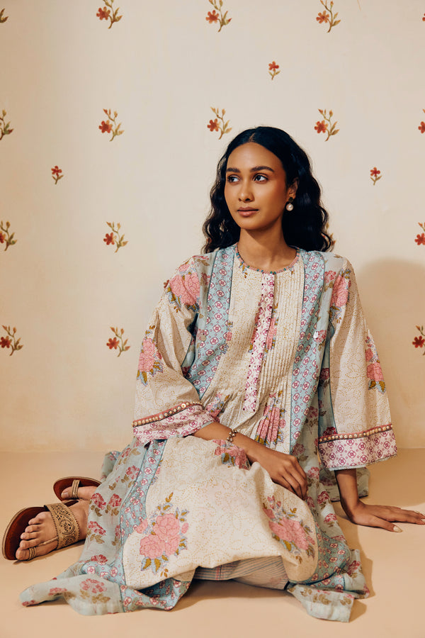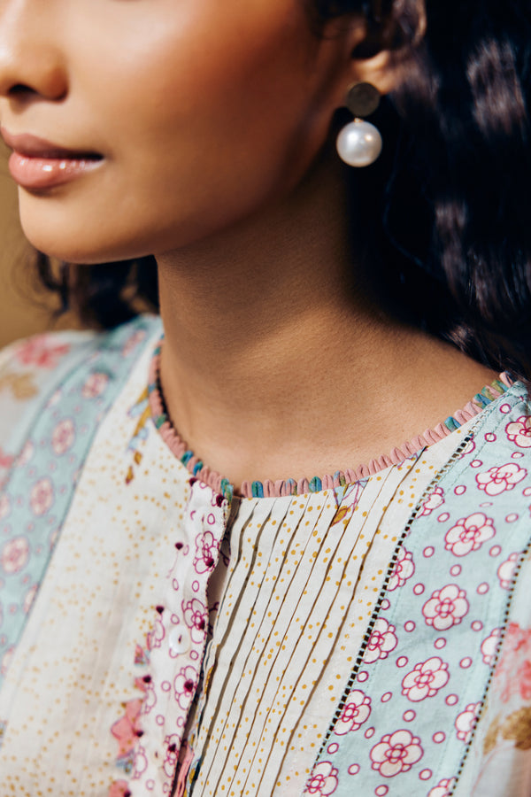 - The tunic features a unique multi-paneled design, seamlessly blending printed mulberry silk and hand block printed handloom Chanderi, while pintuck detailing on the front and back adds subtle texture and sophistication.