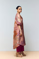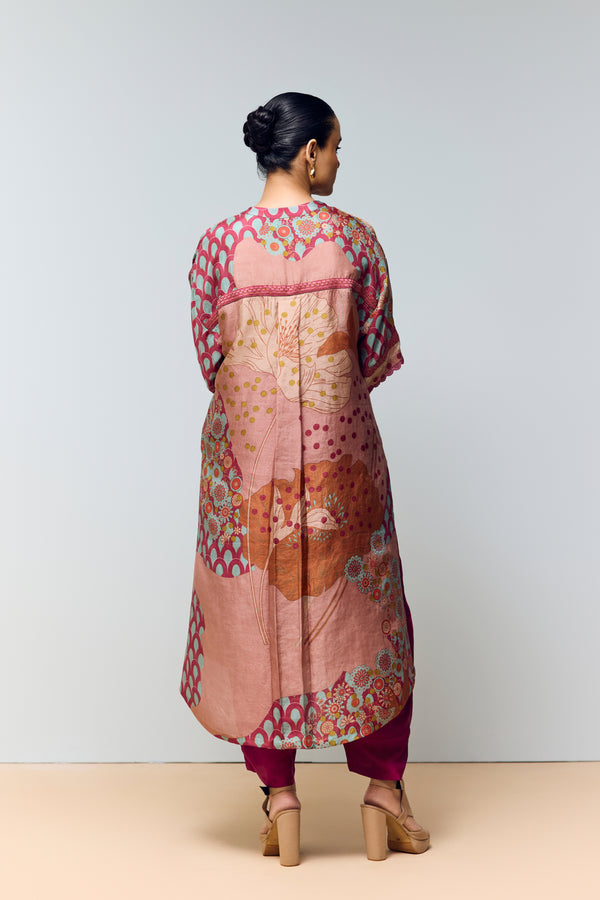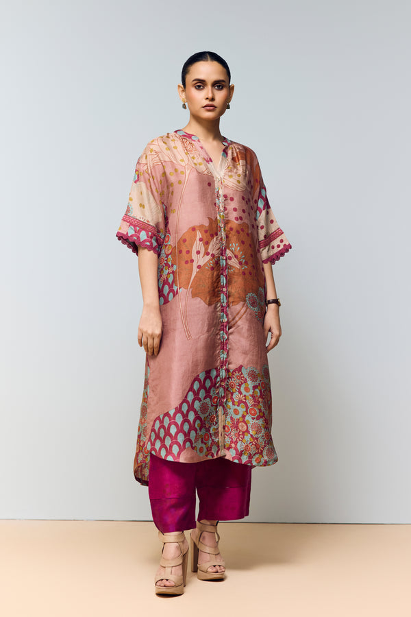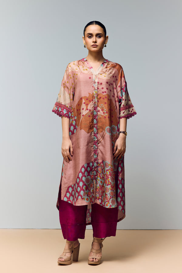 The hand-printed top in peachish pink and magenta pink hues creates a striking, romantic palette that radiates warmth and sophistication. It’s paired with magenta tone-on-tone printed mulberry silk pants, bringing depth and continuity to the ensemble.