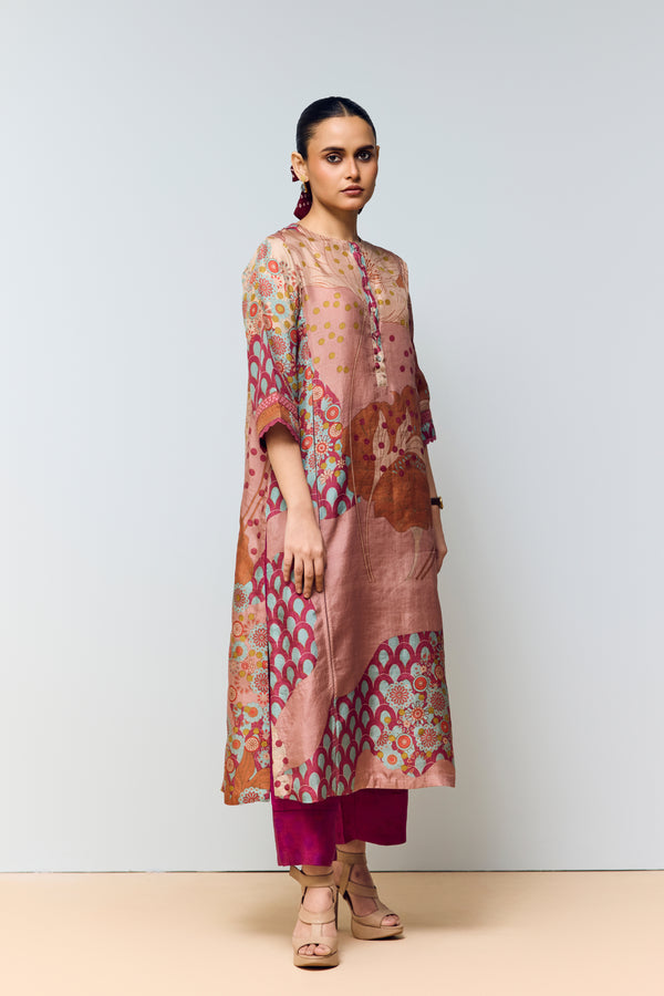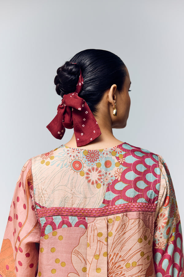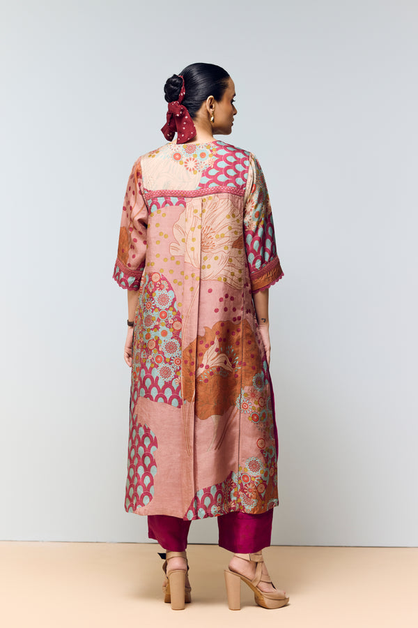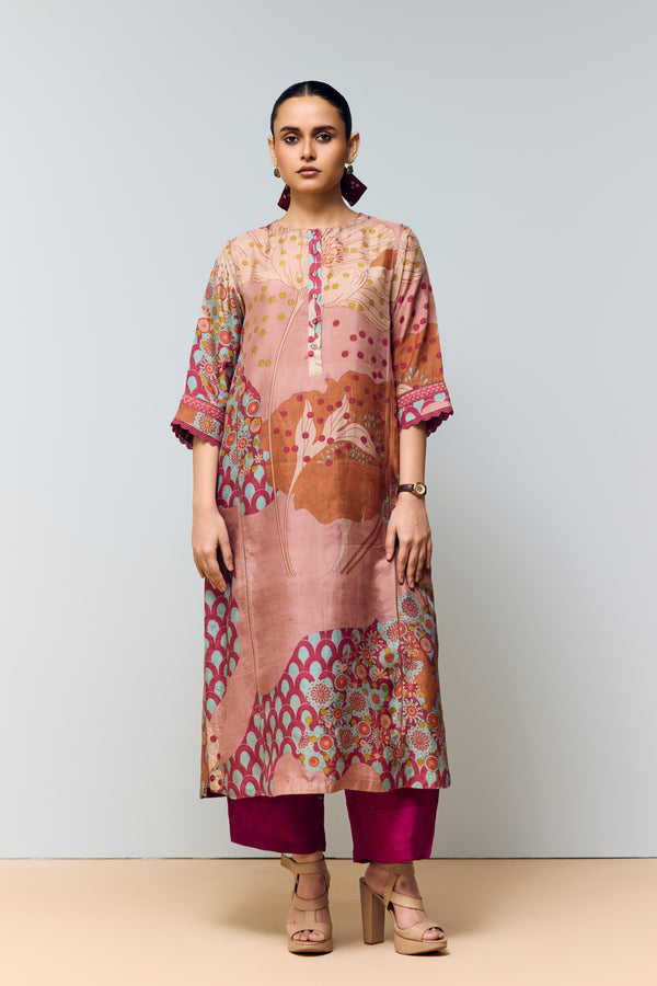 Peachish Pink & Magenta Pink Hand Printed Cord Set – Mulberry Silk Co-ord with Kaftan Sleeves