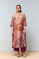 - Make a soft yet striking style statement in our Peachish Pink and Magenta Pink Hand Printed Cord Set, expertly handcrafted in 100% hand-woven mulberry silk. This dreamy co-ord set features a delicate round neckline, breezy kaftan-style sleeves, and a front button placket, offering relaxed sophistication with a contemporary twist.