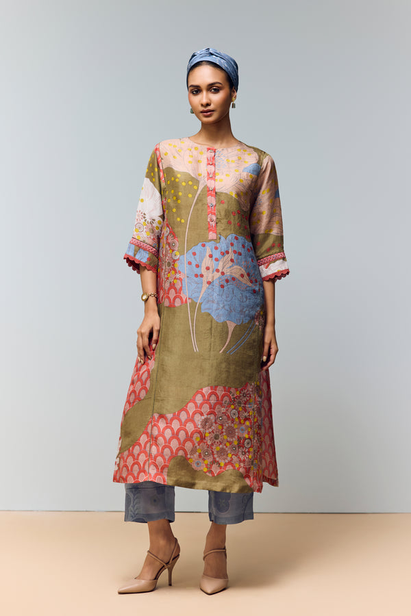 Sap Green, Peachish Orange &; Ice Blue Hand Printed Cord Set – Mulberry Silk Co-ord with Kaftan Sleeves